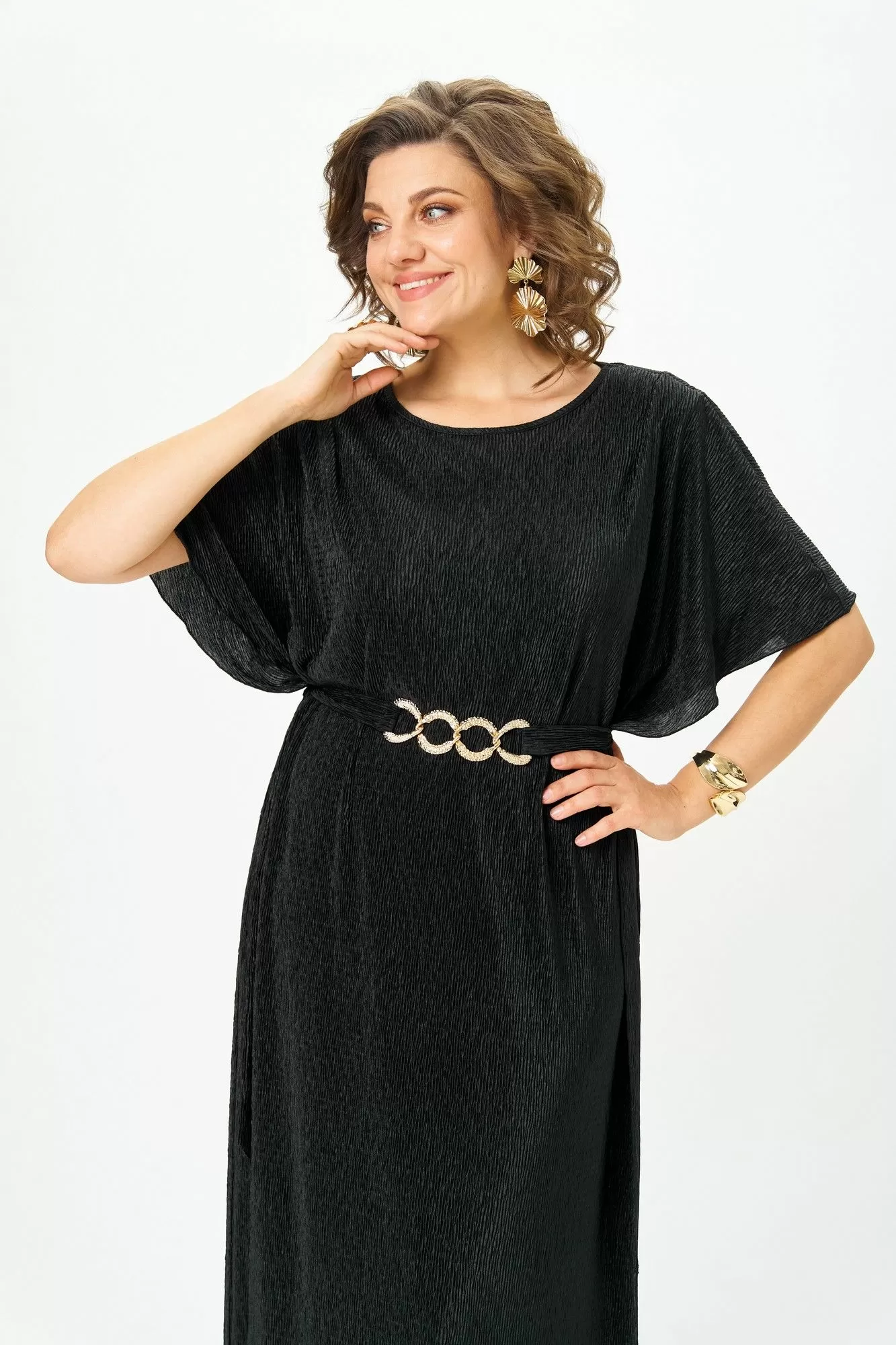 Элегантное вечернее платье в пол из струящейся ткани с эффектом жатки (кринкл). Лёгкая текстура создаёт красивое мерцание и динамику при каждом движении. Платье выполнено в лаконичном крое с двумя боковыми швами, которые формируют идеальный силуэт без лишних деталей. Пояс с декоративной пряжкой подчёркивает талию, а разрезы по бокам добавляют легкости и женственности.