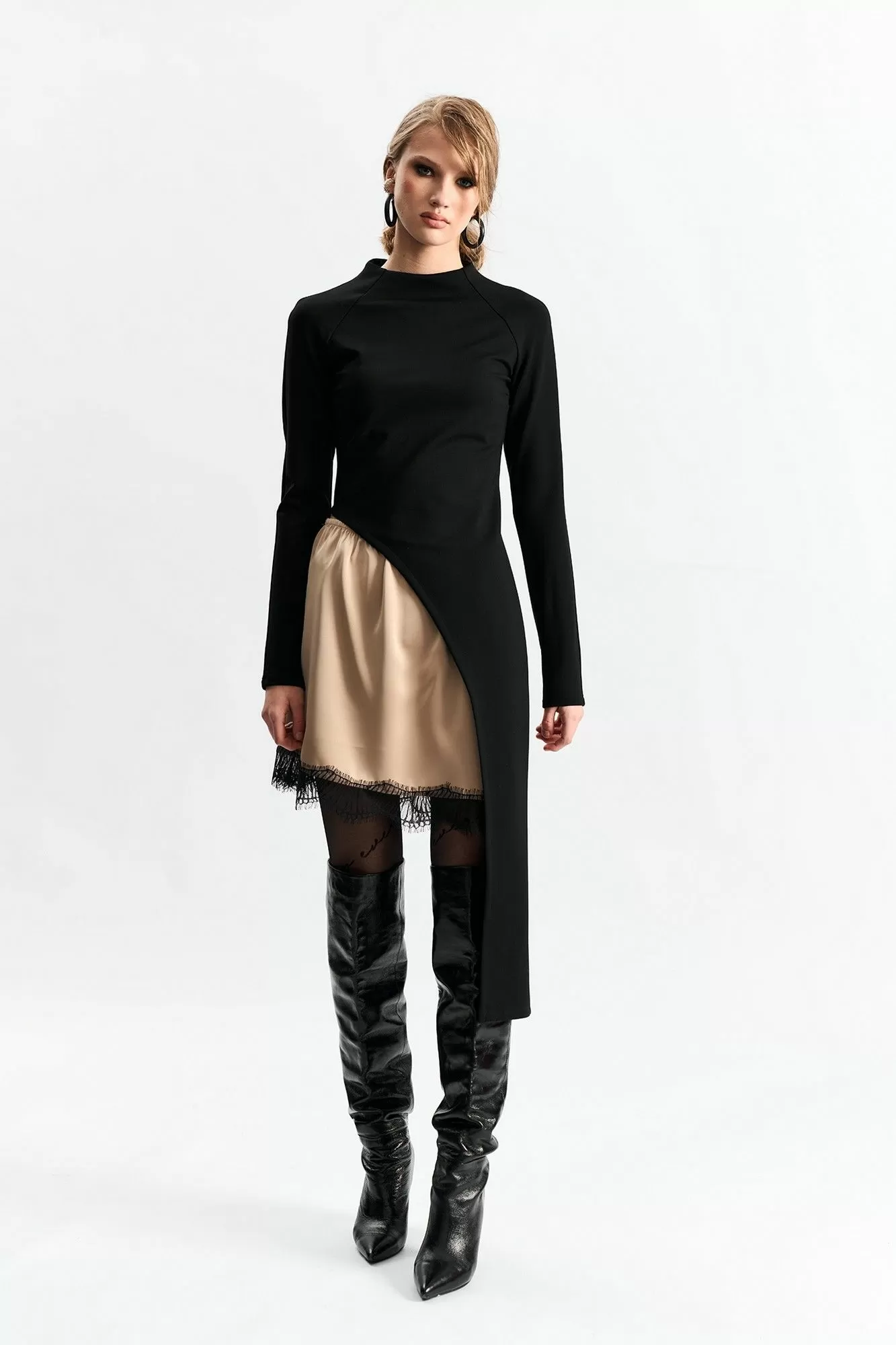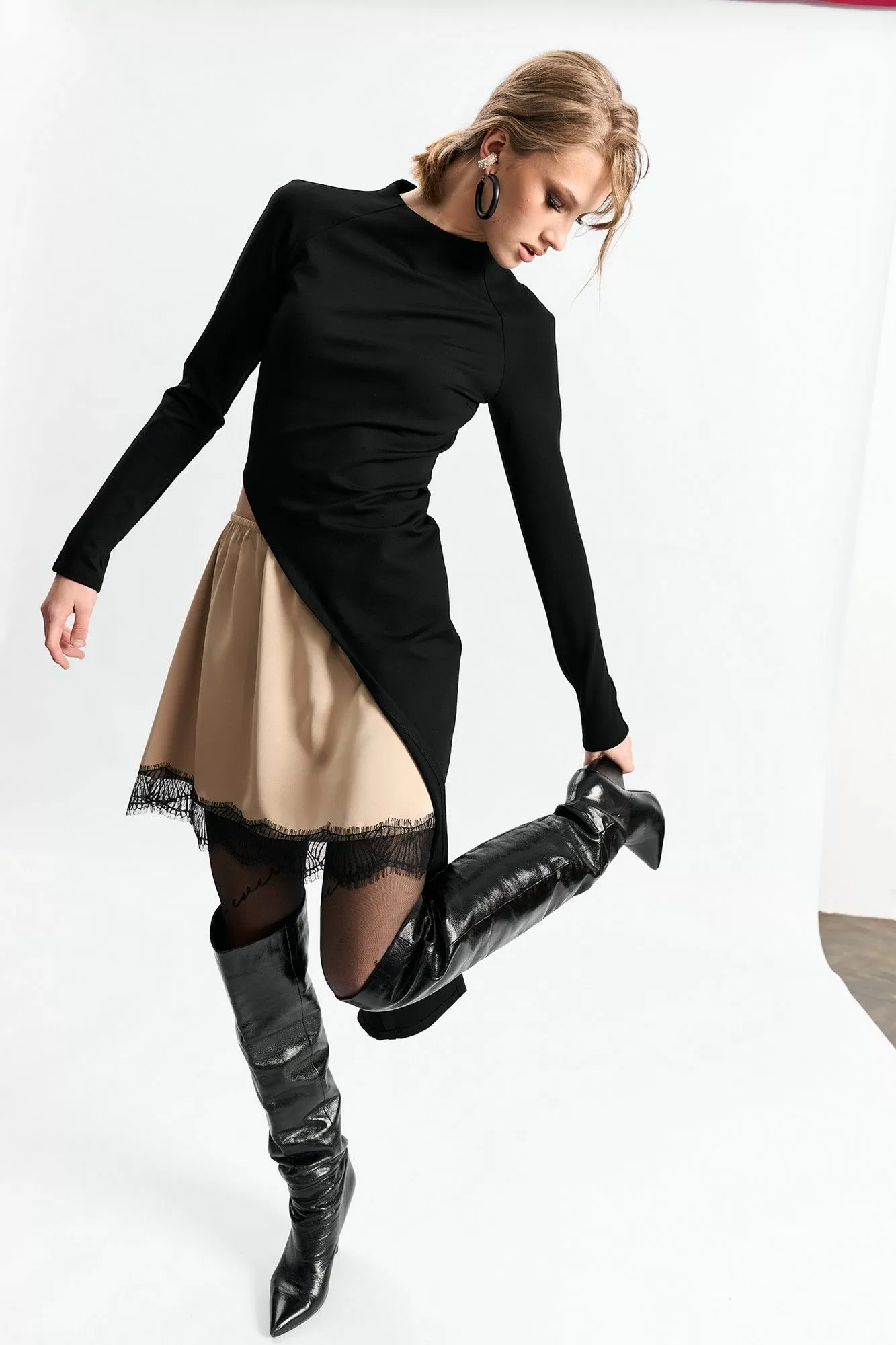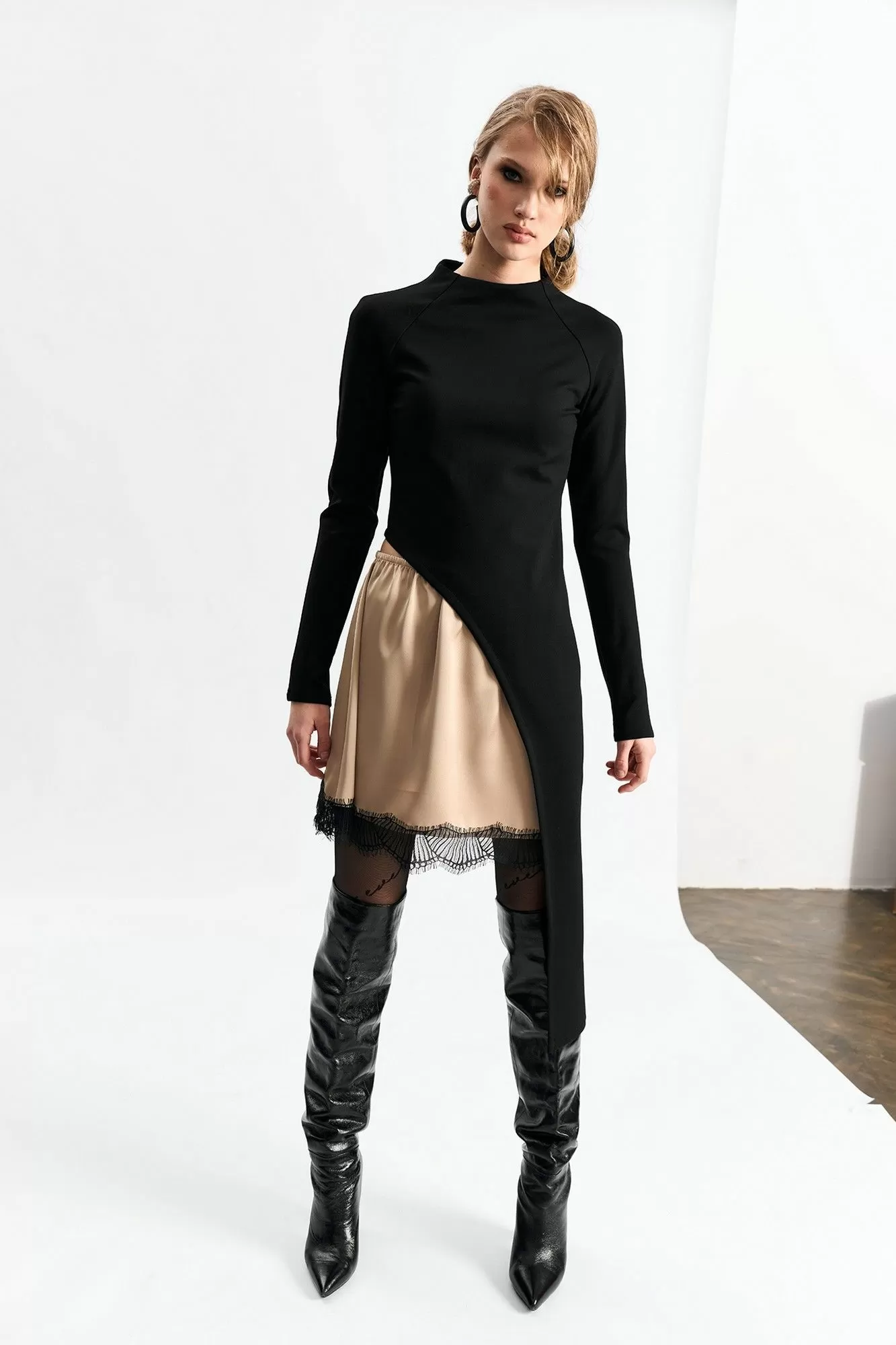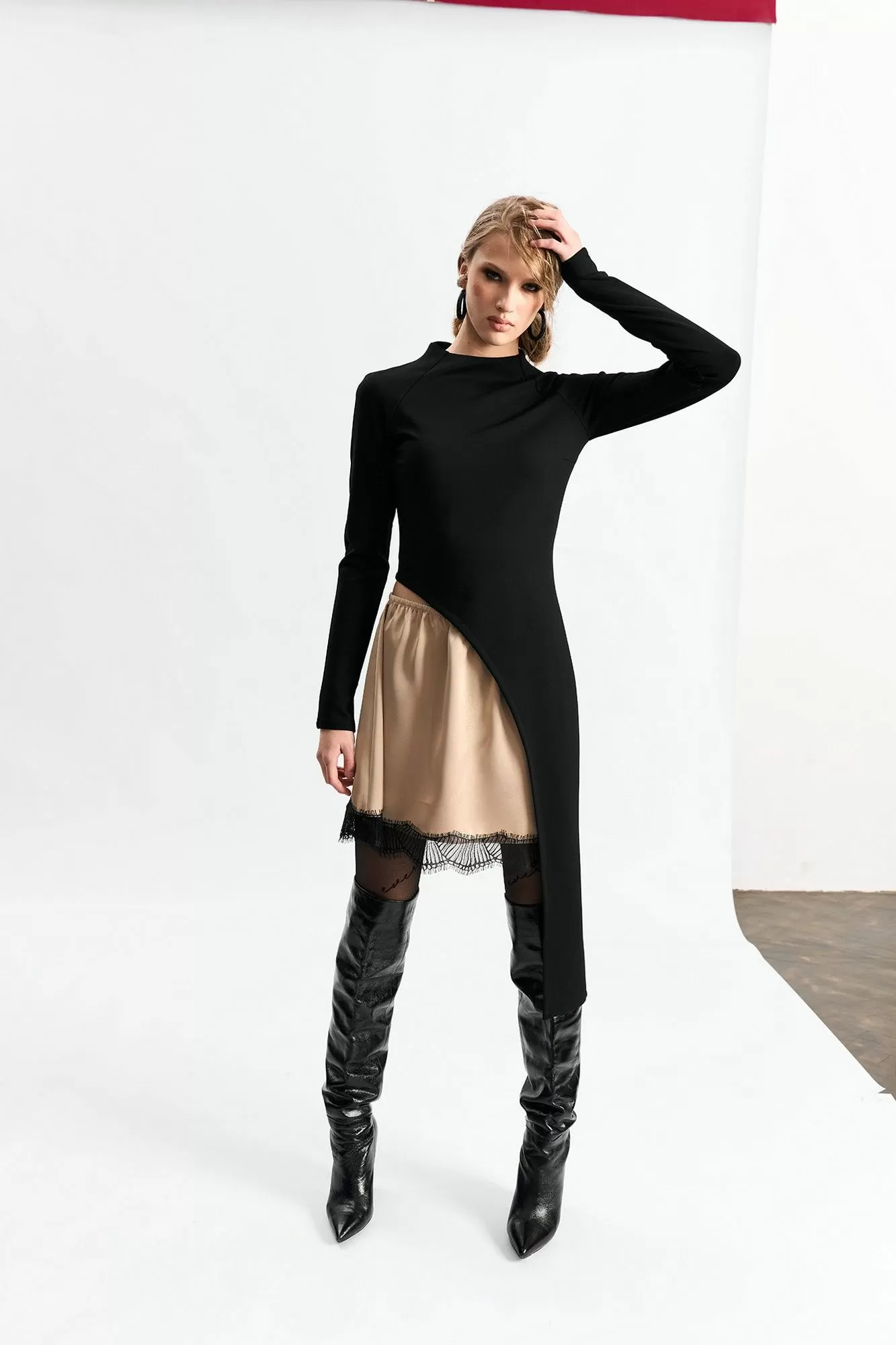 Джемпер асимметричный, с удлиненной левой стороной. Рукав удлиненный с разрезом бля большого пальца. Прилегающий силуэт, сзади - потайная молния в цвет изделия