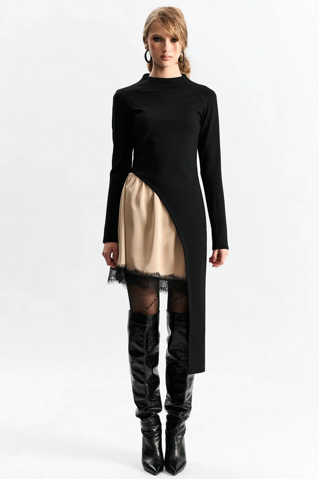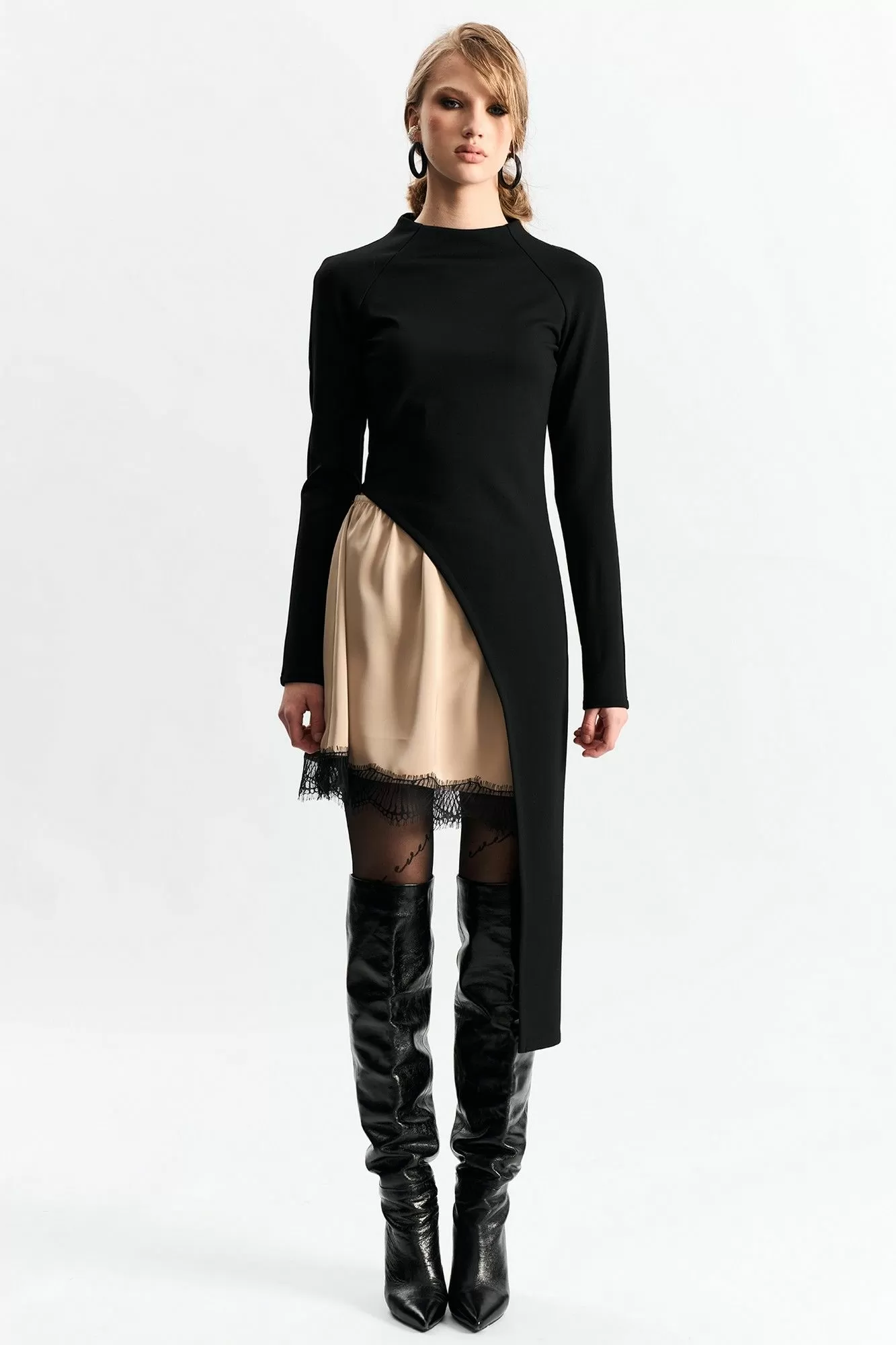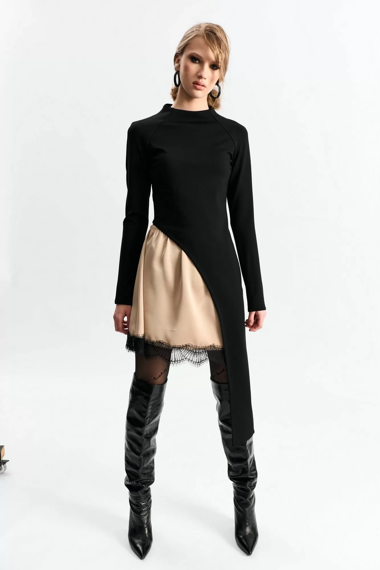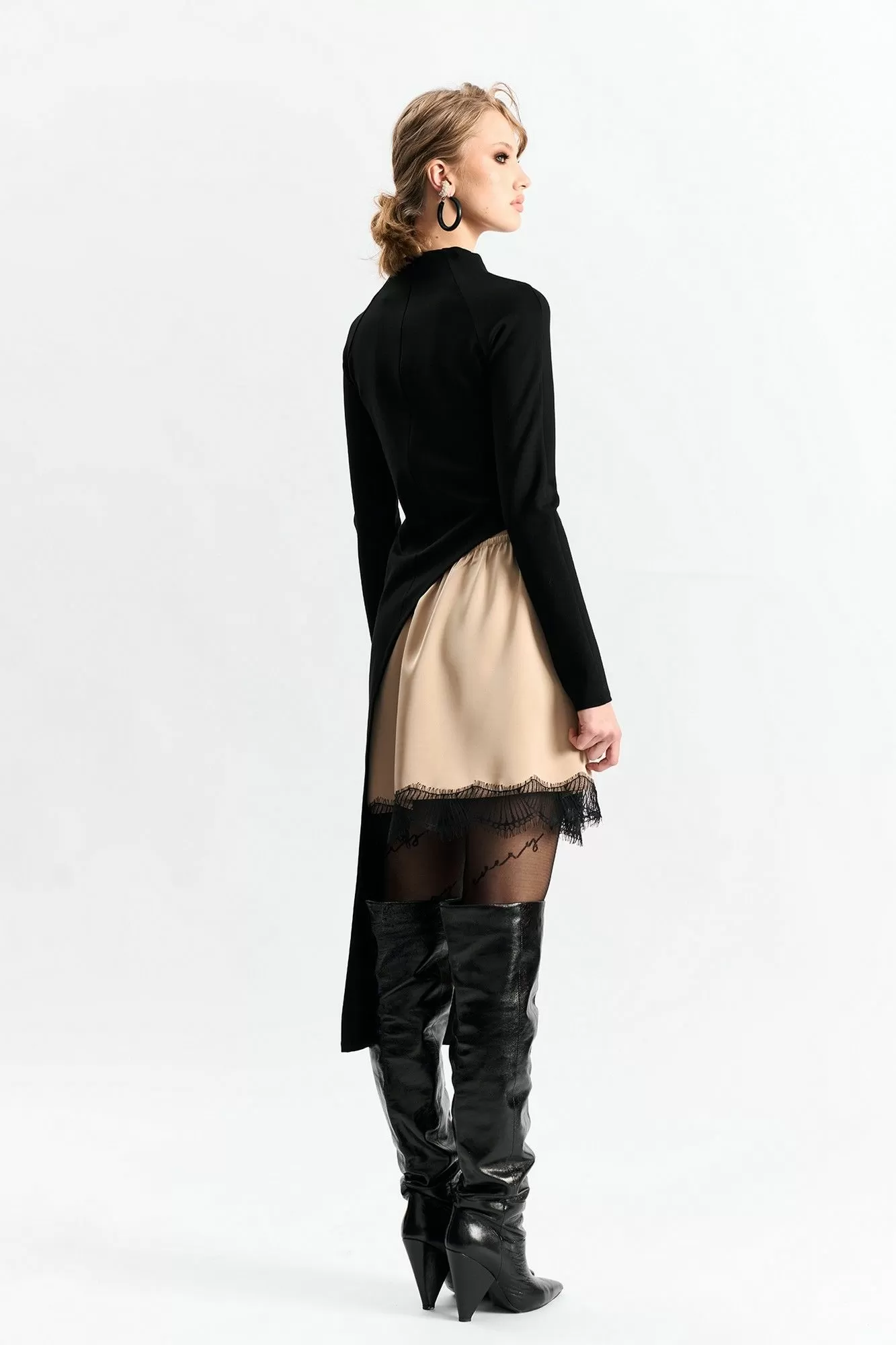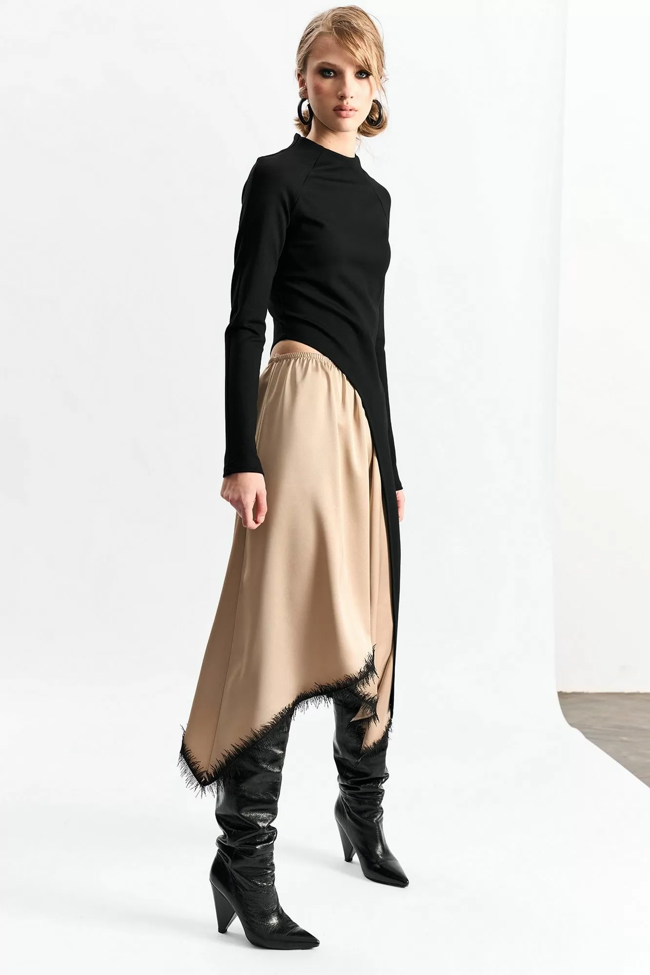 Джемпер асимметричный, с удлиненной левой стороной. Рукав удлиненный с разрезом бля большого пальца. Прилегающий силуэт, сзади - потайная молния в цвет изделия