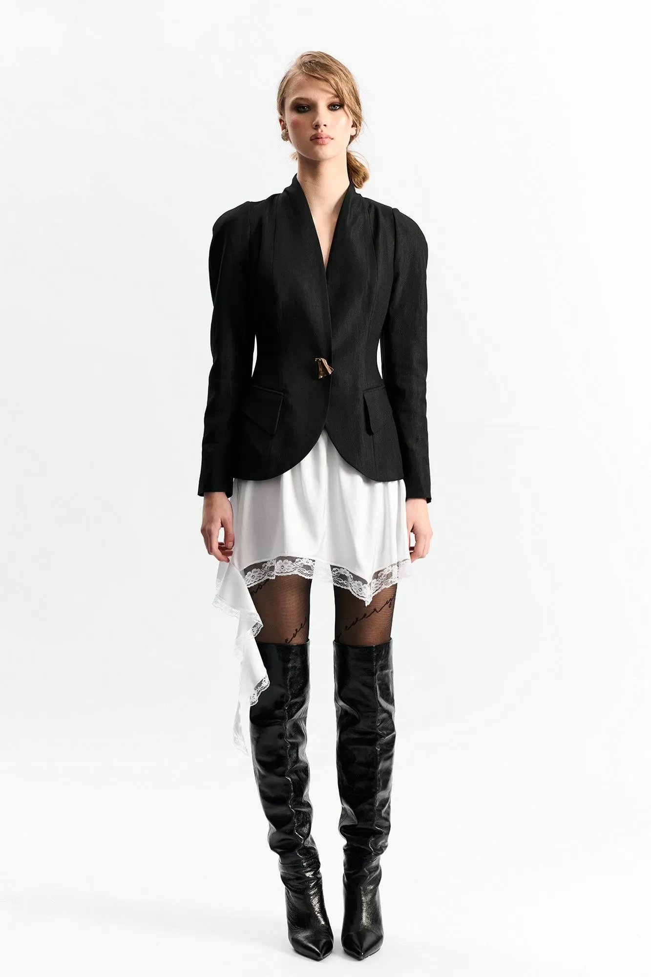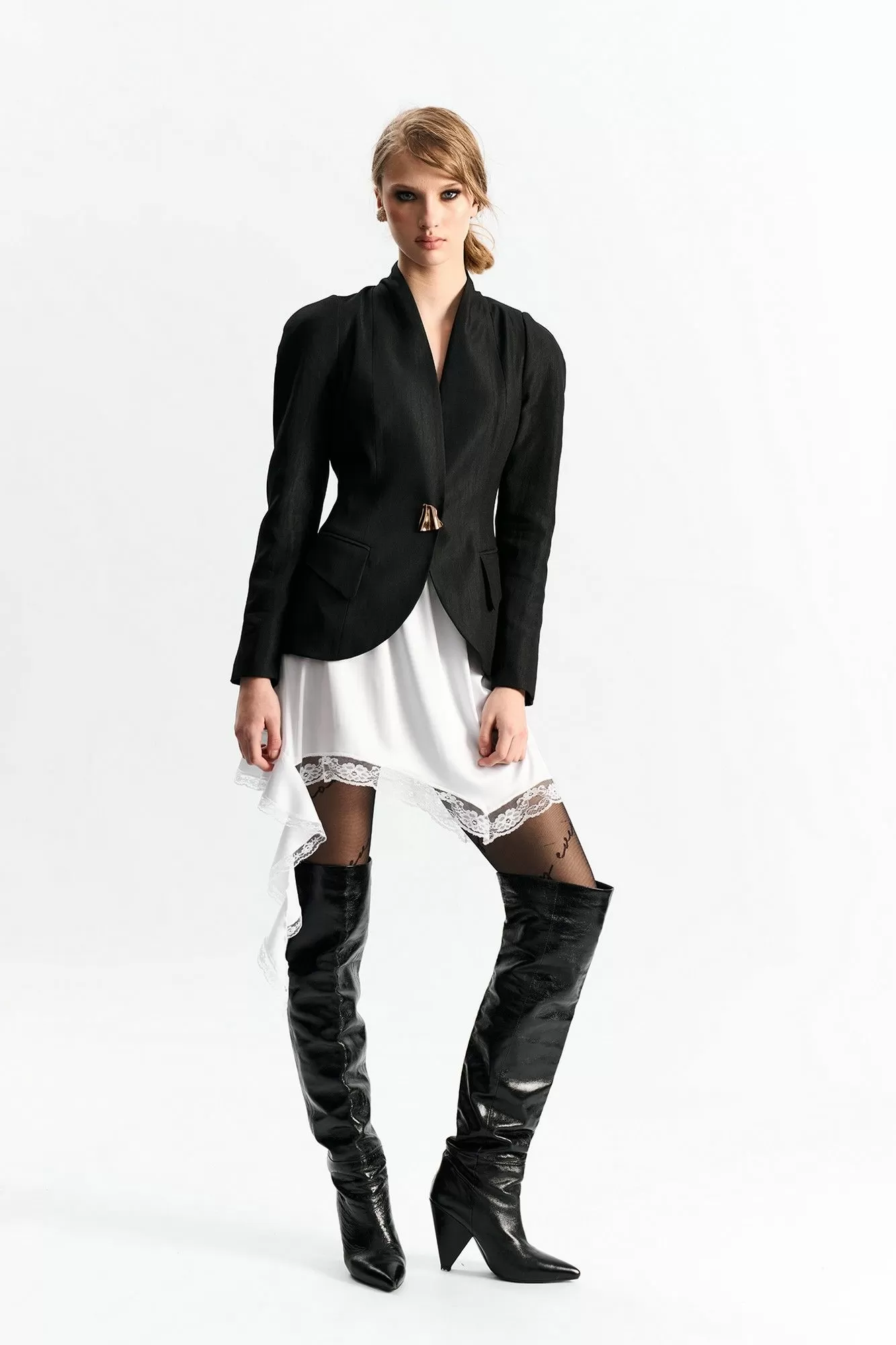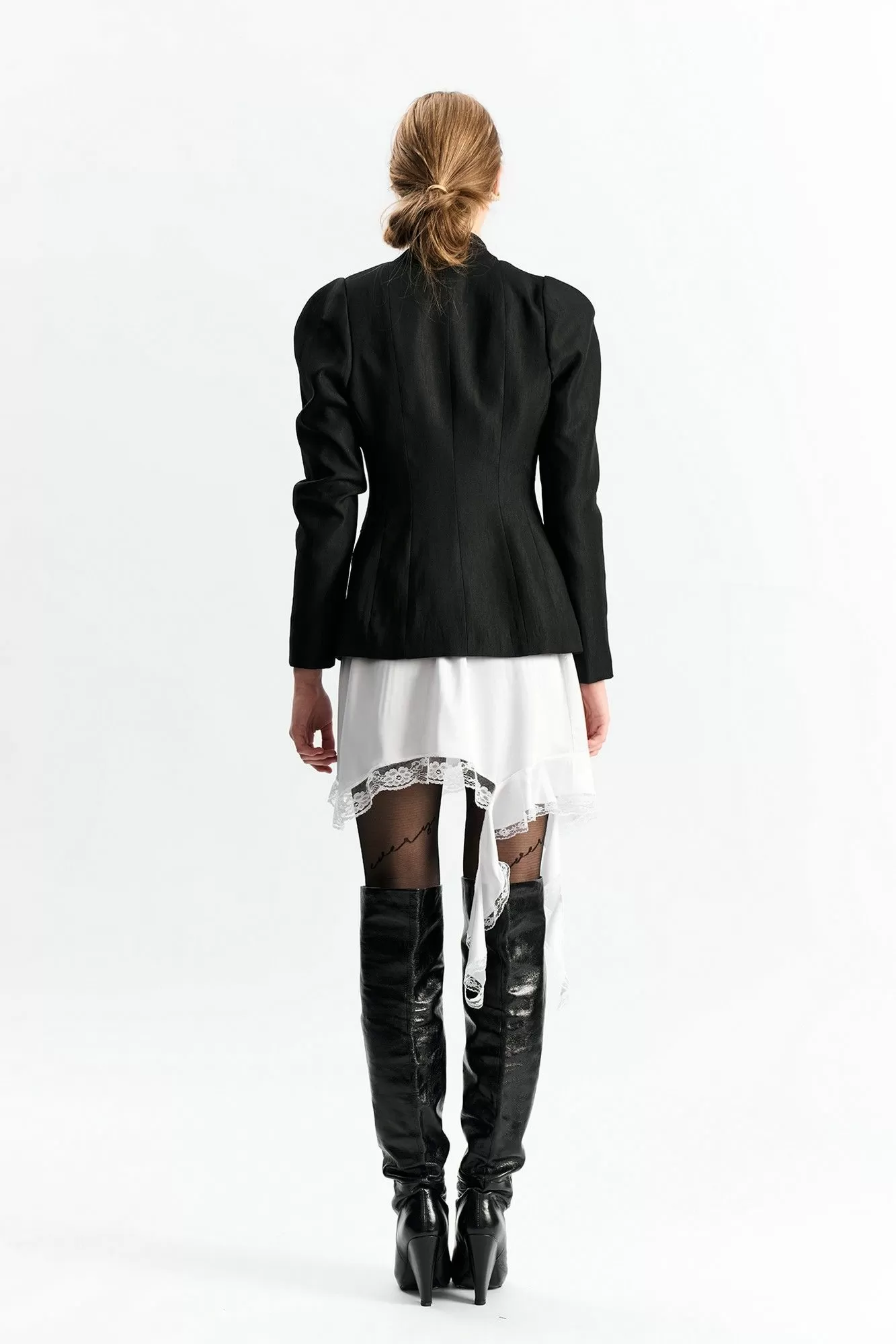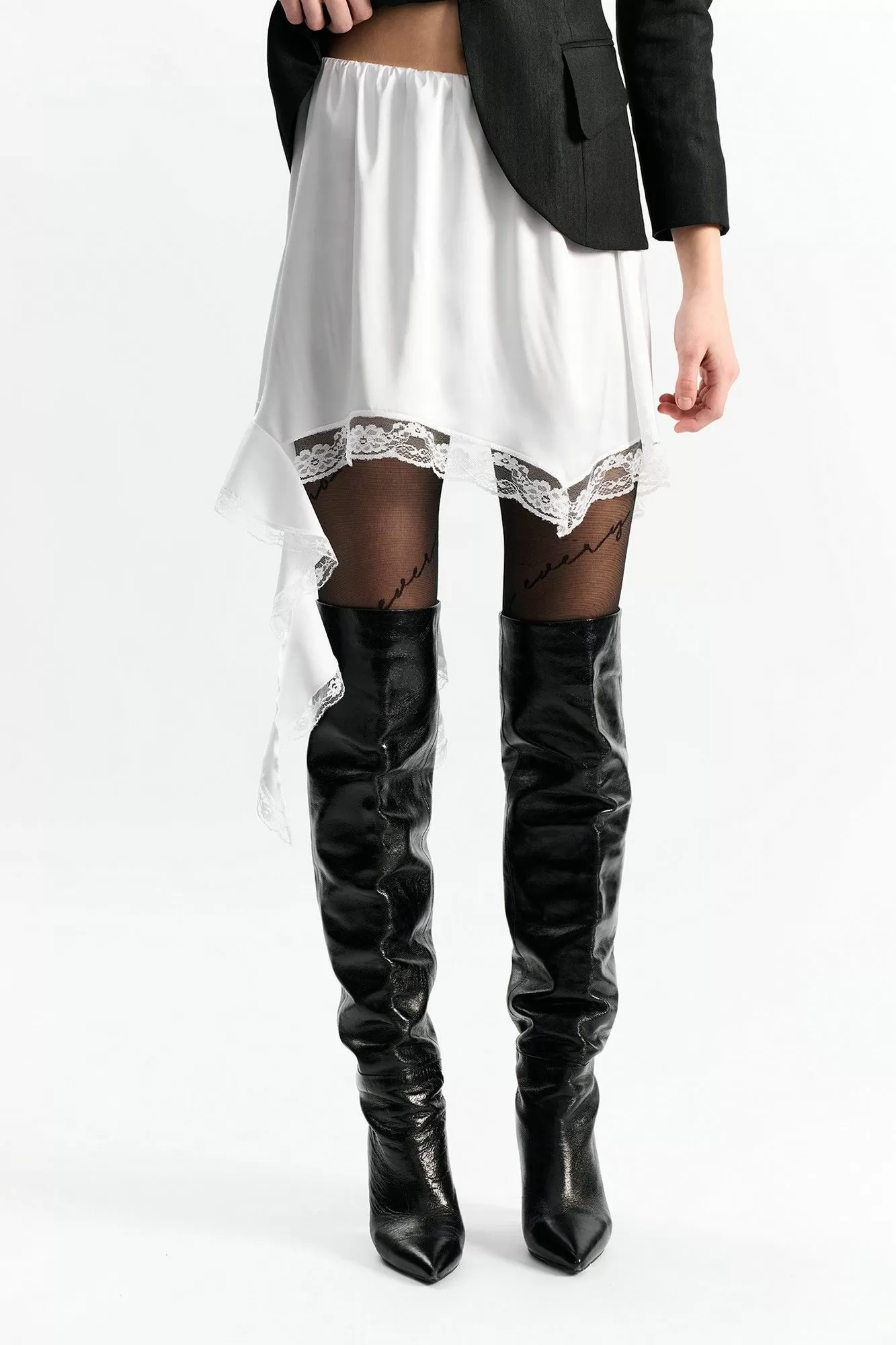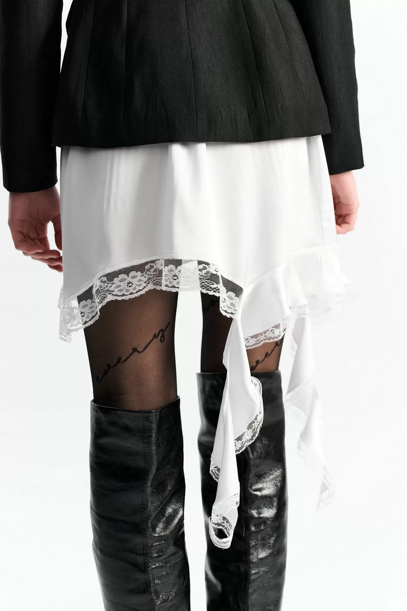 Юбка-мини с фигурным низом, кружевом, и декоративным воланом сбоку. Пояс на резинке.