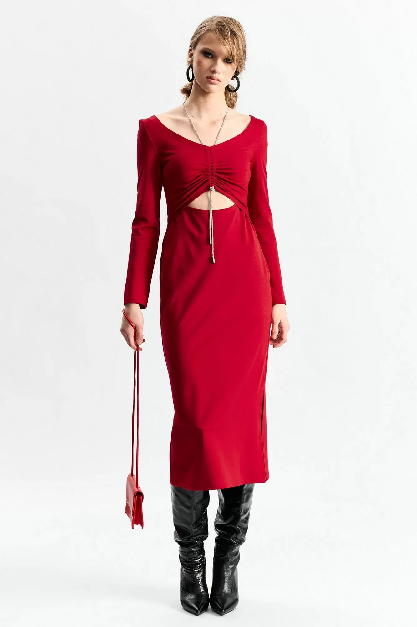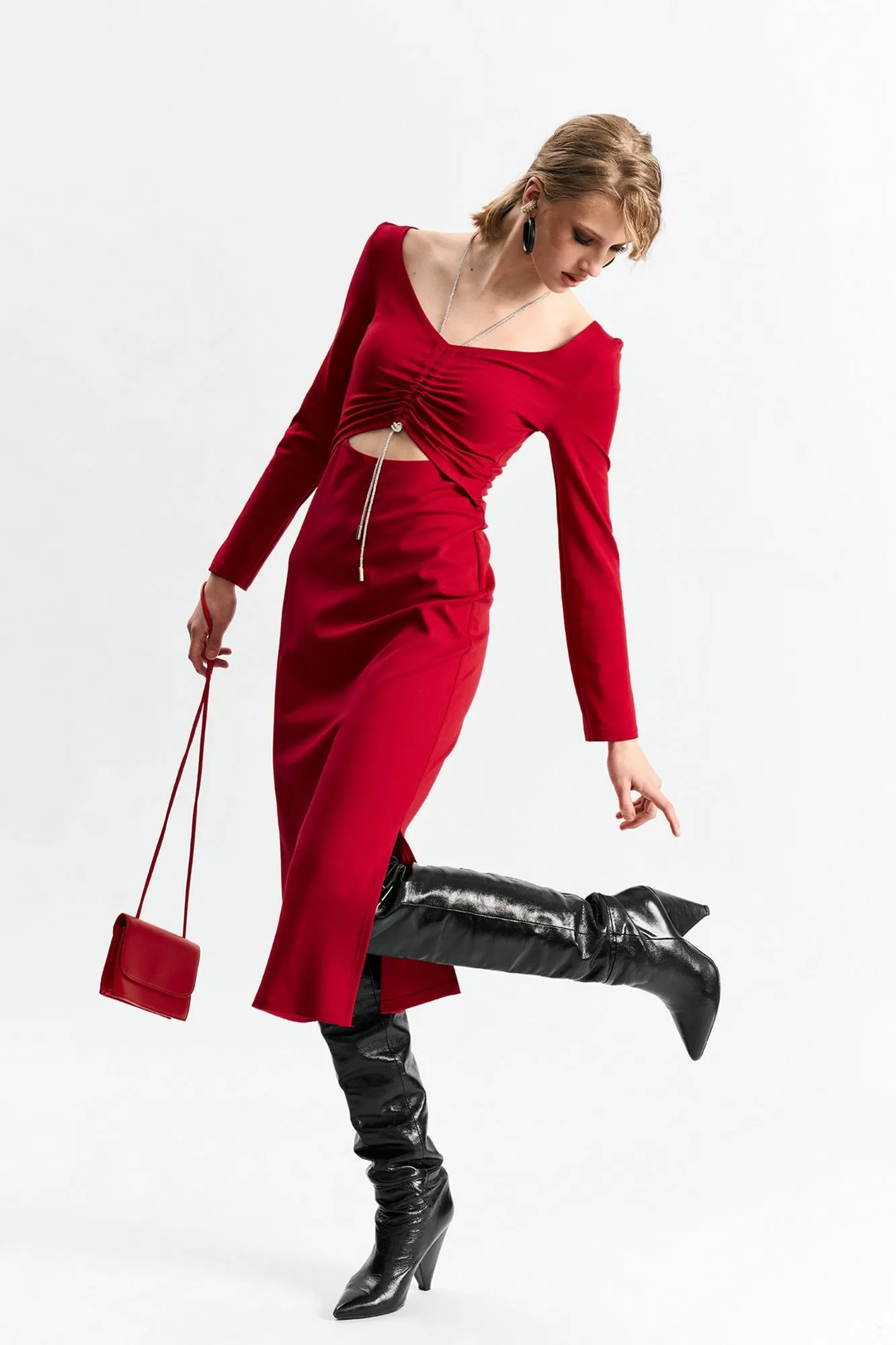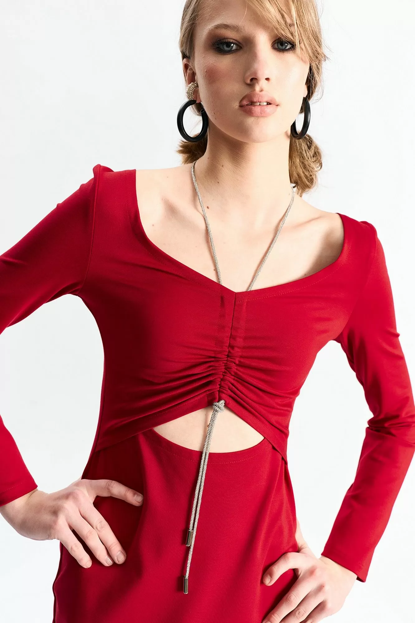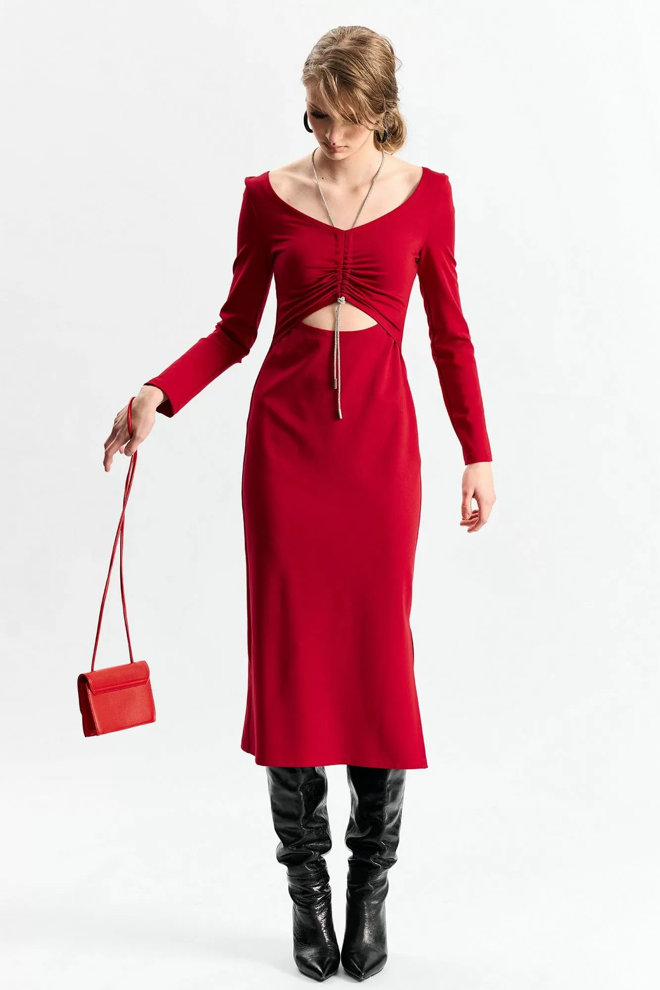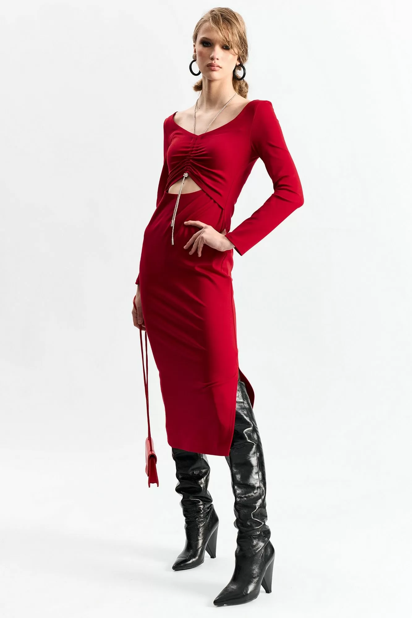 Платье прилегающего силуэта с подрезом в области талии и декоративным шнуром со стразами с затяжкой по груди .