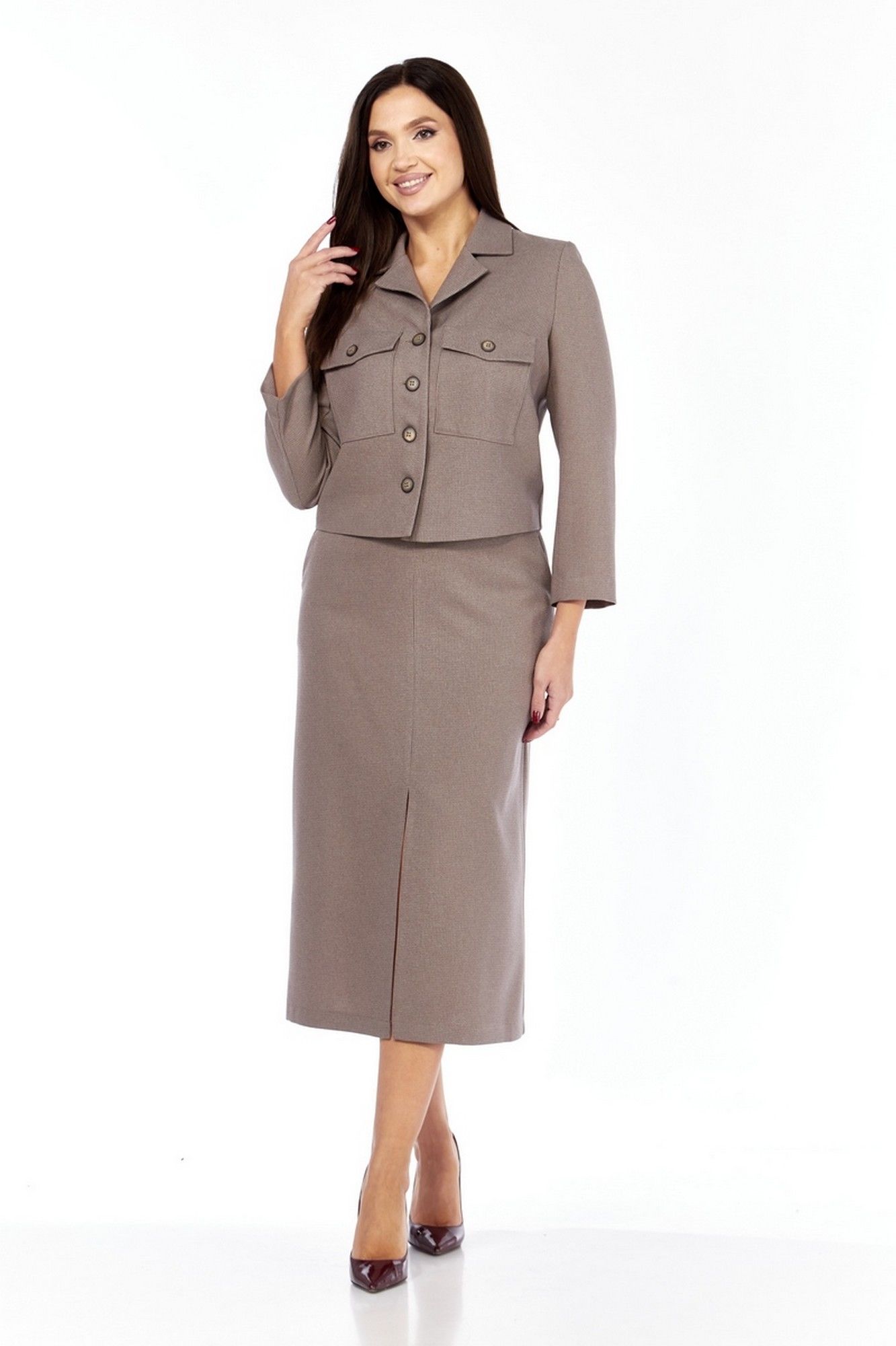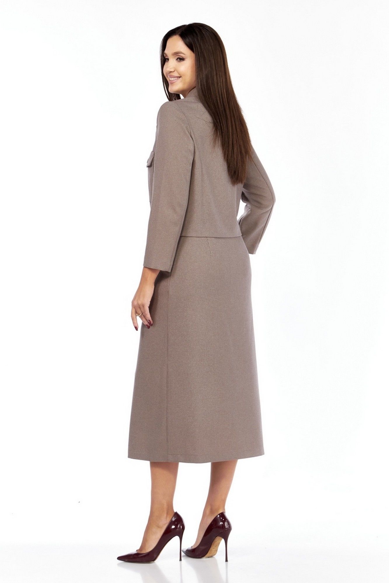 Костюм женский состоящий из жакета и юбки. Жакет приталенного силуэта на подкладке спереди, со втачным рукавом длины ¾. Имеет отложной воротник с лацканами, по переду застежка на петли и пуговицы, на груди накладные карманы с клапанами, которые застегиваются на петлю и пуговицу. Юбка длинная, трапециевидная, с разрезом по переду, на подкладке. На передней половинке карманы-хулиганы. Пояс фиксированный, застёжка слева, на молнию, петлю и пуговицу. Жакет: длина жакета по спинке – 49 см, длина рукава – 54 см. Юбка: длина по боковому шву – 87 см.