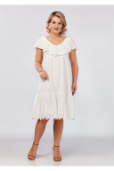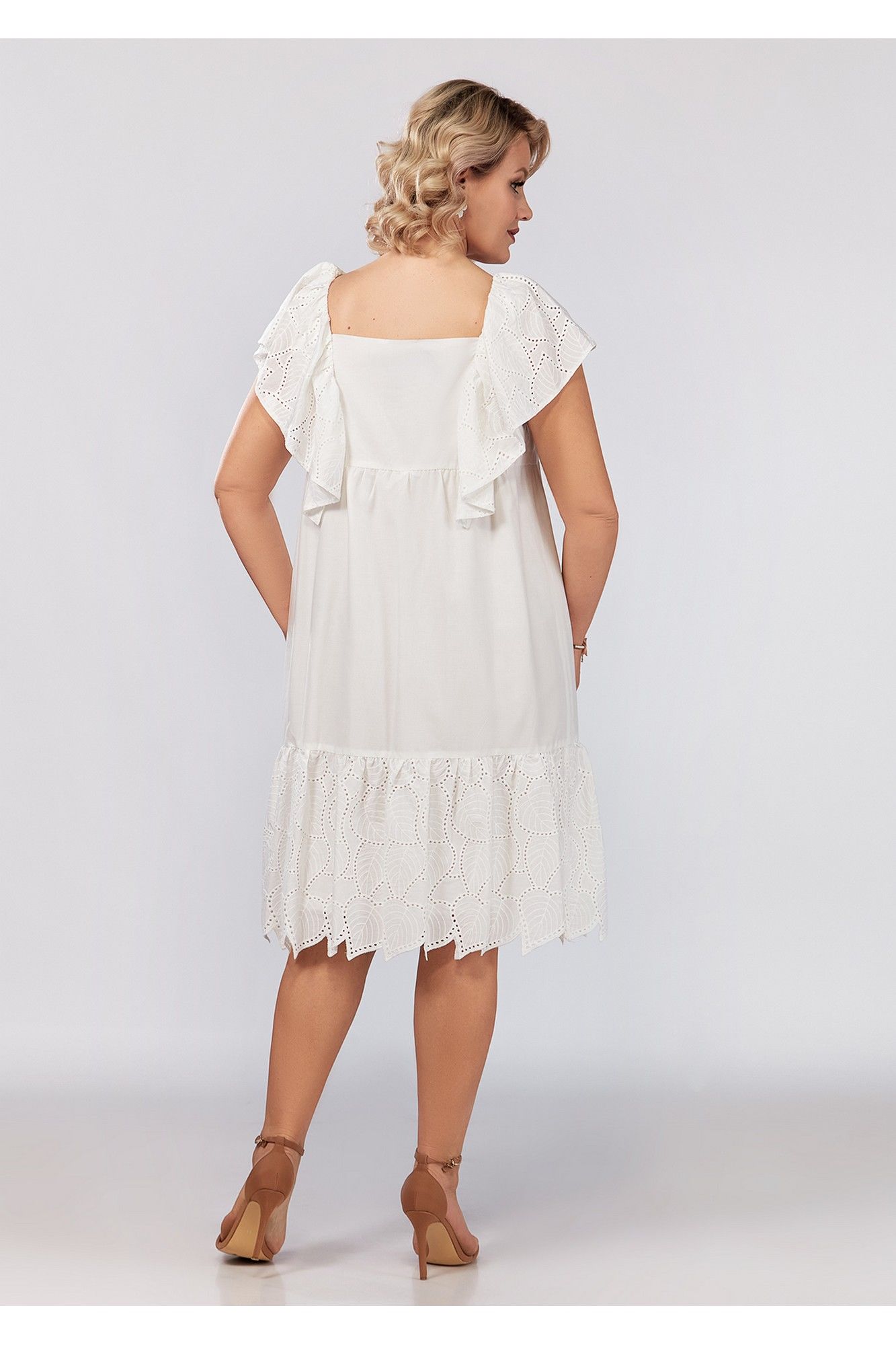 Летнее платье свободного покроя, выполнено из хлопковой ткани и хлопка с вышивкой. Горловина платья округлой формы, обработана притачным воланом, присборенным по горловине, из хлопковой ткани с вышивкой. Также на полочке обработана кокетка из однотонного хлопка, нижний волан присборен и выполнен из хлопка с вышивкой. Спинка выполнена из однотонного хлопка, со средним швом и вытачками, в среднем шве потайная молния. Легкое, эффектное платье на хлопковой подкладке отличный вариант для вашего летнего гардероба! в 52р. Ширина груди- 53см, Ширина талии -74см, Ширина бедер- 74см