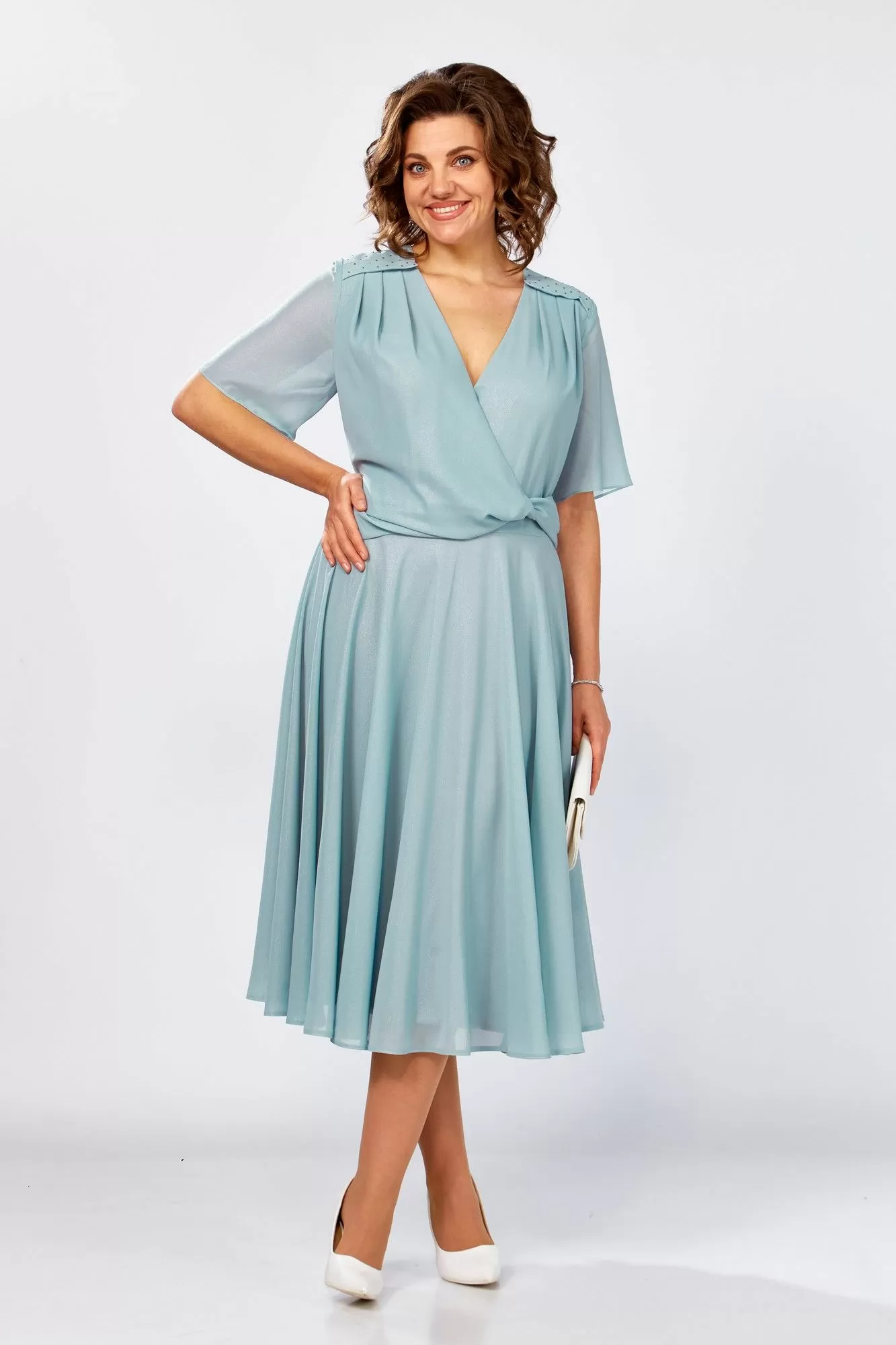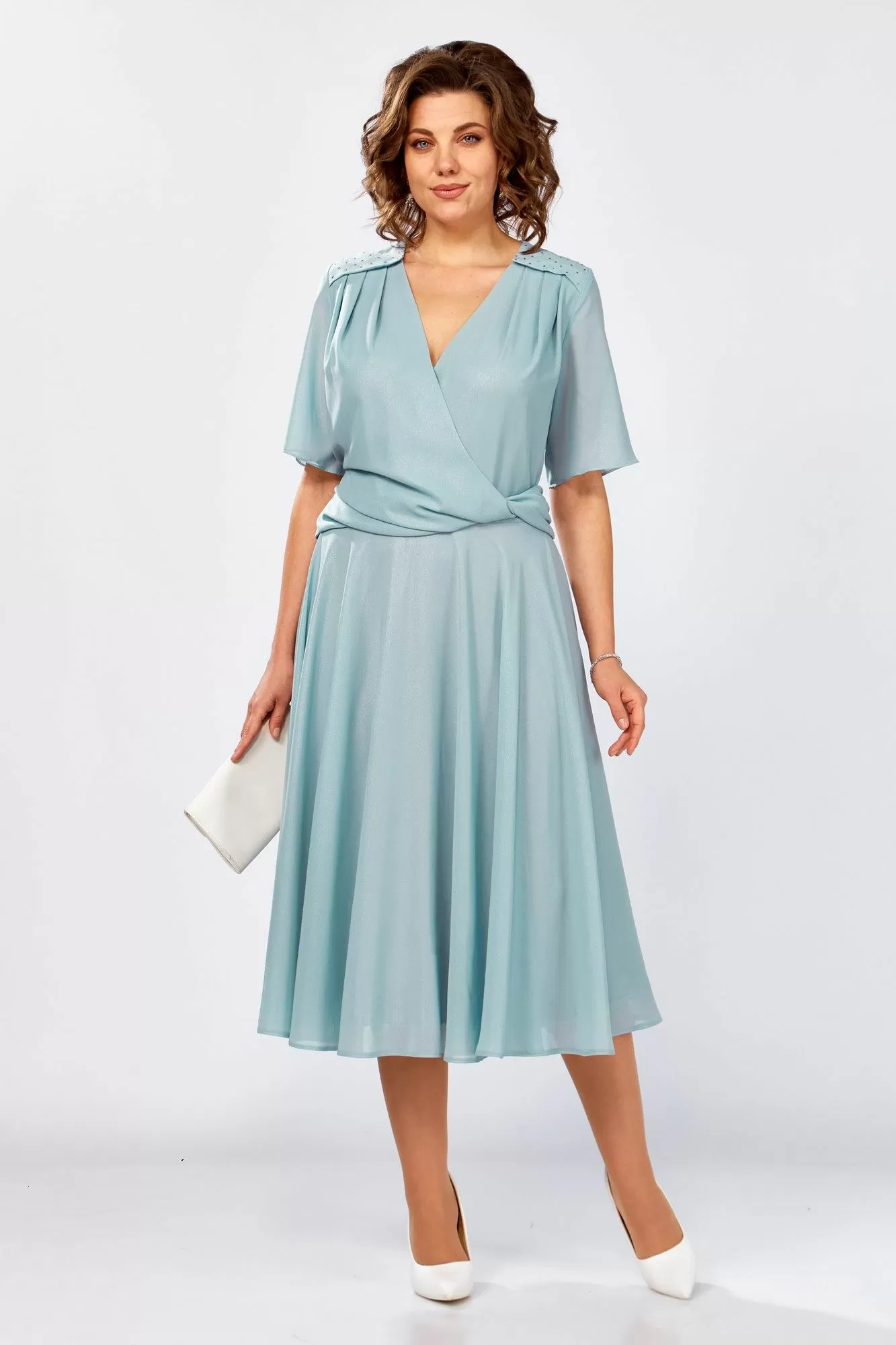 Женское платье полуприлегающего силуэта, выполнено из шифона с блеском, на трикотажной подкладке. Лиф платья отрезное по линии талии, горловина V-образной формы. Правая часть полочки отлетная по линии талии, с перекрутом по левому боку, по линии плеча обработаны кокетки, декорированные стразами, от кокетки на полочке заложены складки. Юбка платья расклешенного силуэта, выполнена из основной ткани, на подкладке. Спинка отрезная по линии талии, со средним швом и вытачками, в среднем шве потайная молния. Рукав втачной, укороченный, из основной ткани. Эффектное платье с оригинальным конструктивным решением прекрасно скроет нюансы фигуры и подчеркнет талию.