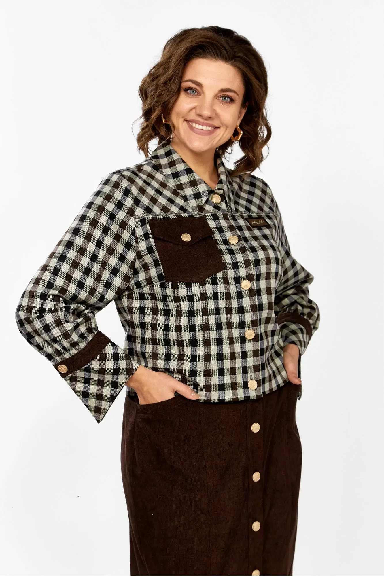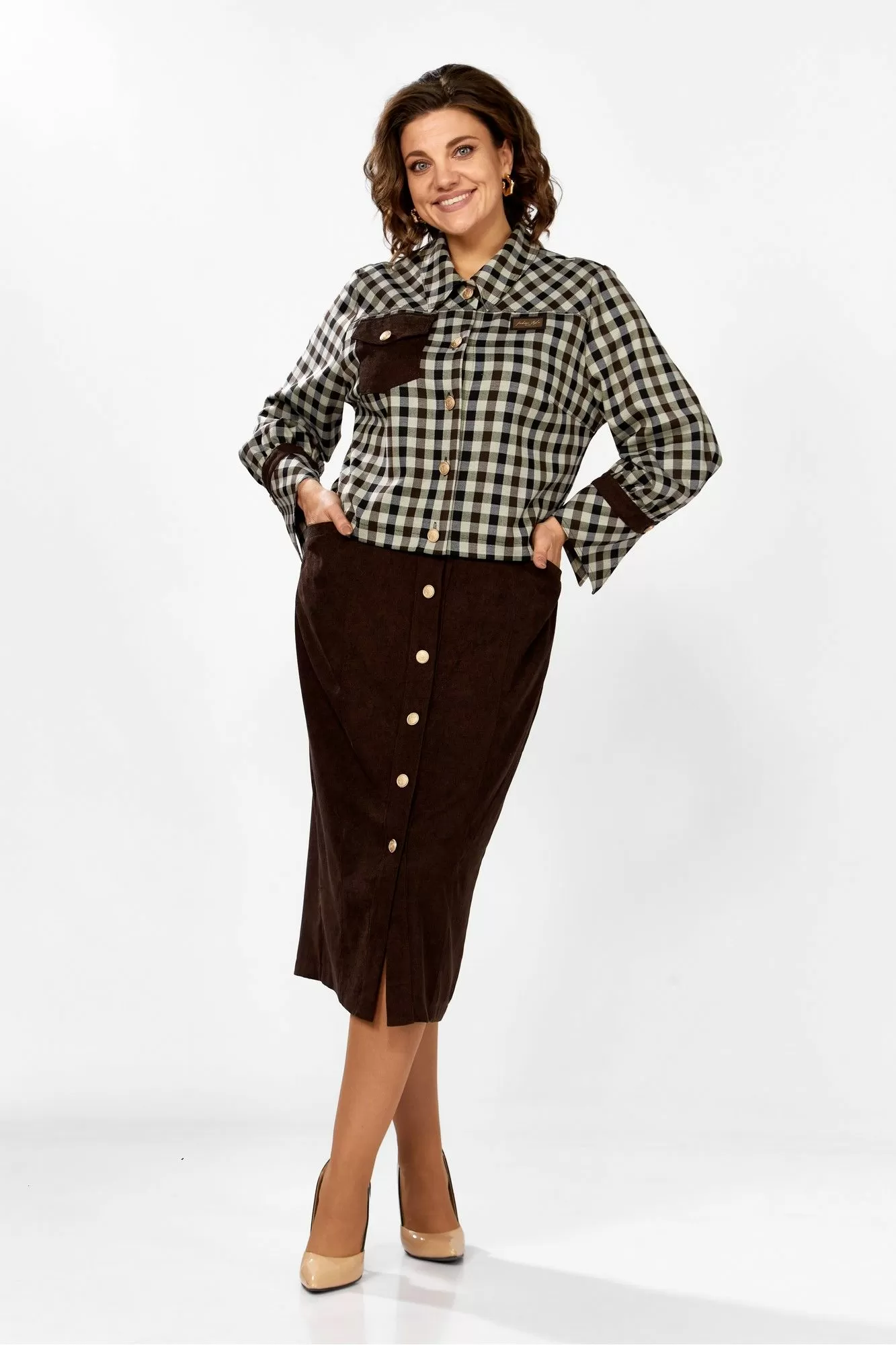 Женский комплект, состоит из жакета и юбки. Жакет выполнен из текстильной ткани в клетку, в качестве отделки штрукс. Горловина обработана воротником со стойкой, застежка по переду на пуговицы. На полочке обработаны рельефы и кокетки, также на полочке обработан накладной карман с клапаном из штрукса по одной стороне, по второй нашивка. Спинка идентична полочке, рукав втачной, по низу с манжетой из штрукса и текстиля в клетку, застегивается на пуговицу. Юбка выполнена из штрукса, с застежкой по переду на планку с пуговицами. Верхний срез обработан притачным поясом, по переду обработаны вертикальный подрезы и карманы. Заднее полотнище юбки со средним швом и вытачками. Эффектный и стильный комплект для вашего осеннего образа!