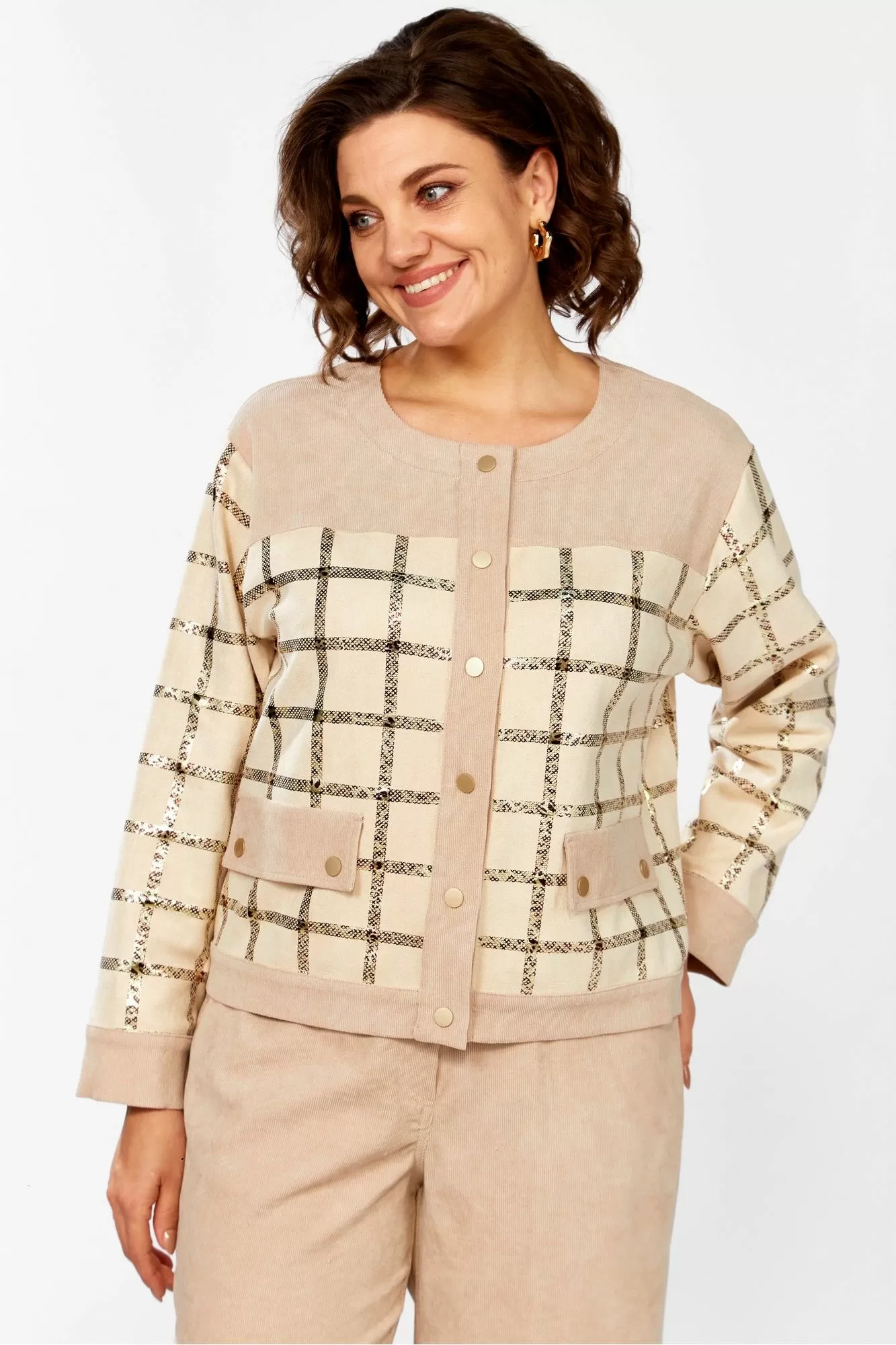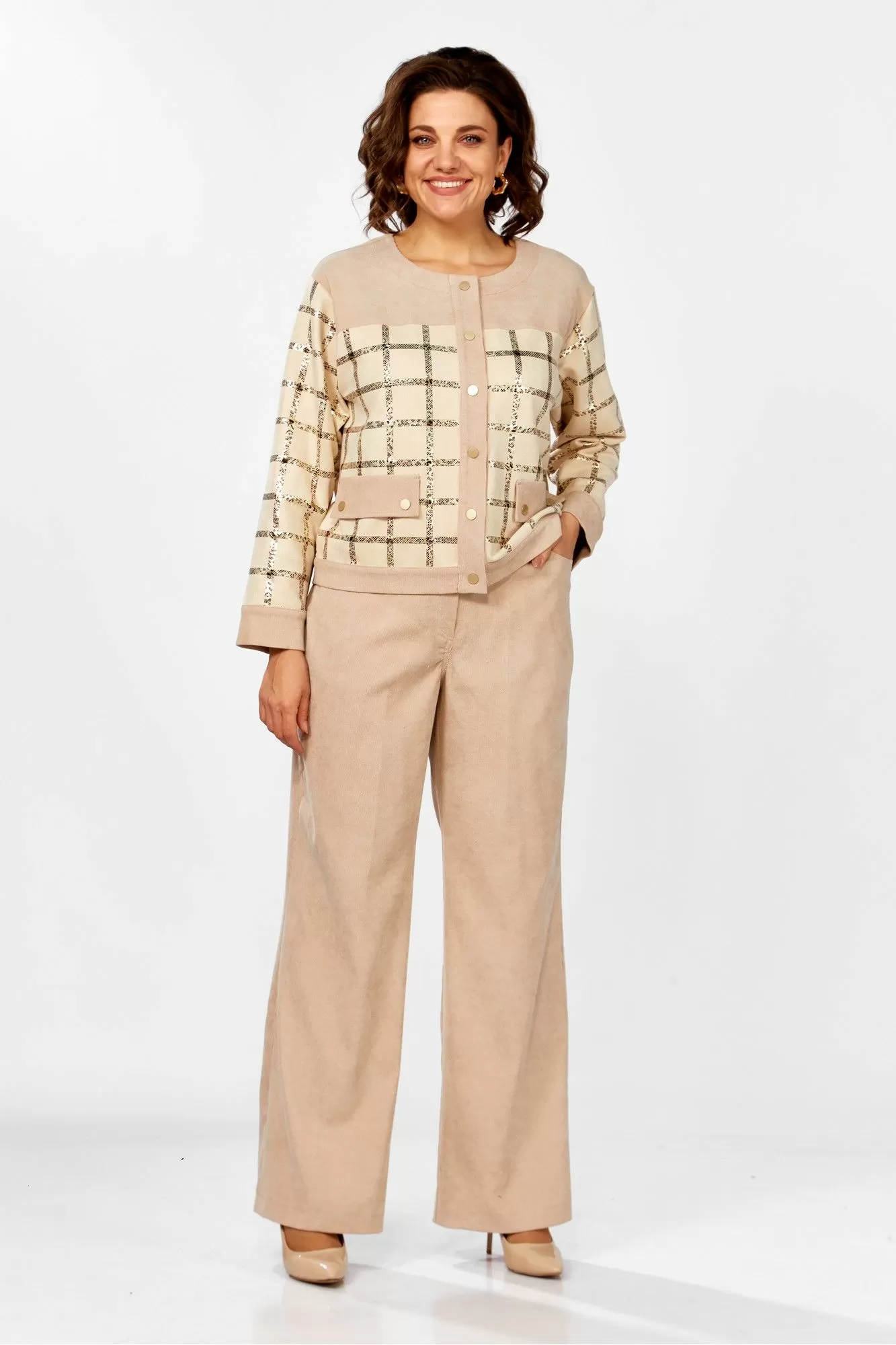 Женский комплект полуприлегающего силуэта, выполнен из штруксовой ткани и замши с принтом. Жакет выполнен из замши с принтом, застежка по переду, на планку с кнопками, горловина округлой формы, на обтачке, обтачка и планка из штрукса. Также на полочке обработаны кокетки из штрукса, также на полочке обработаны клапаны из штрукса, низ жакета обработан притачной планкой из штрукса. Спинка также с кокеткой из штрукса, рукав втачной, длинный, по низу на манжете из штрукса. Брюки выполнены из штрукса, прямого покроя, верхний срез обработан притачным поясом. Застежка по переду на молнию-пуговицу, в боковых швах карманы. Стильный комплект отличный выбор для осеннего образа!