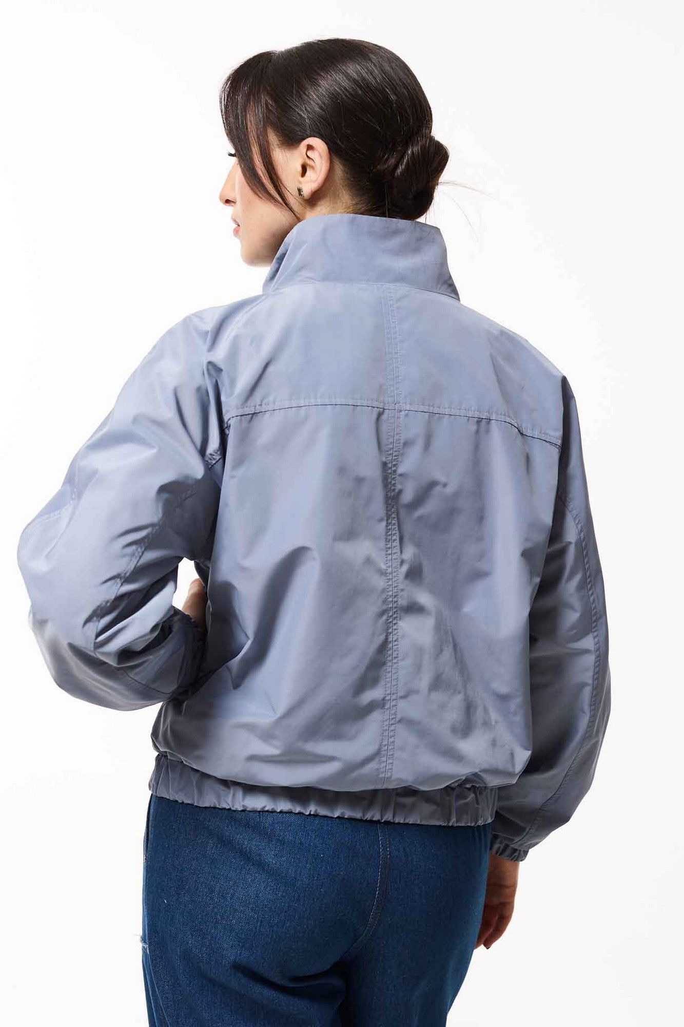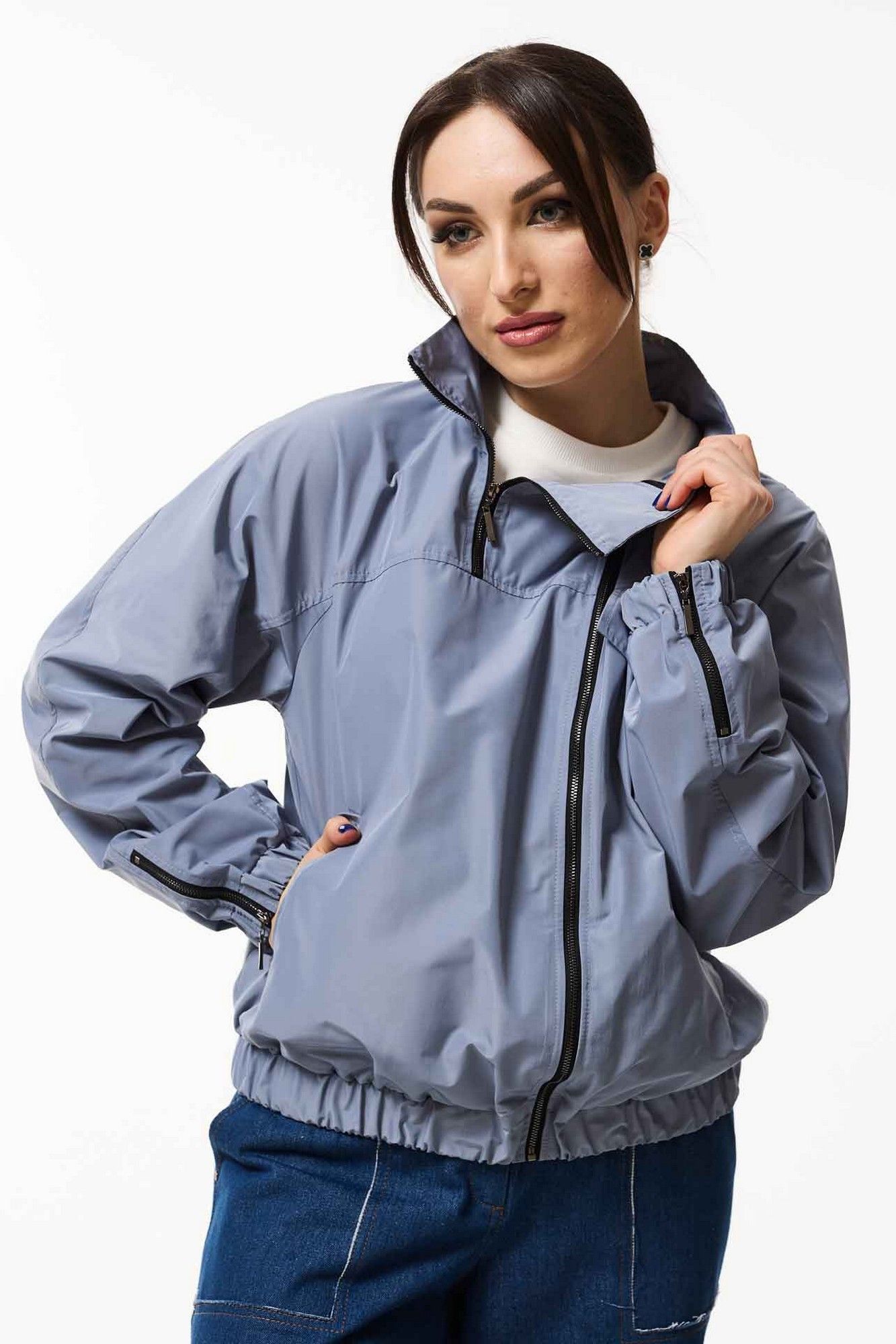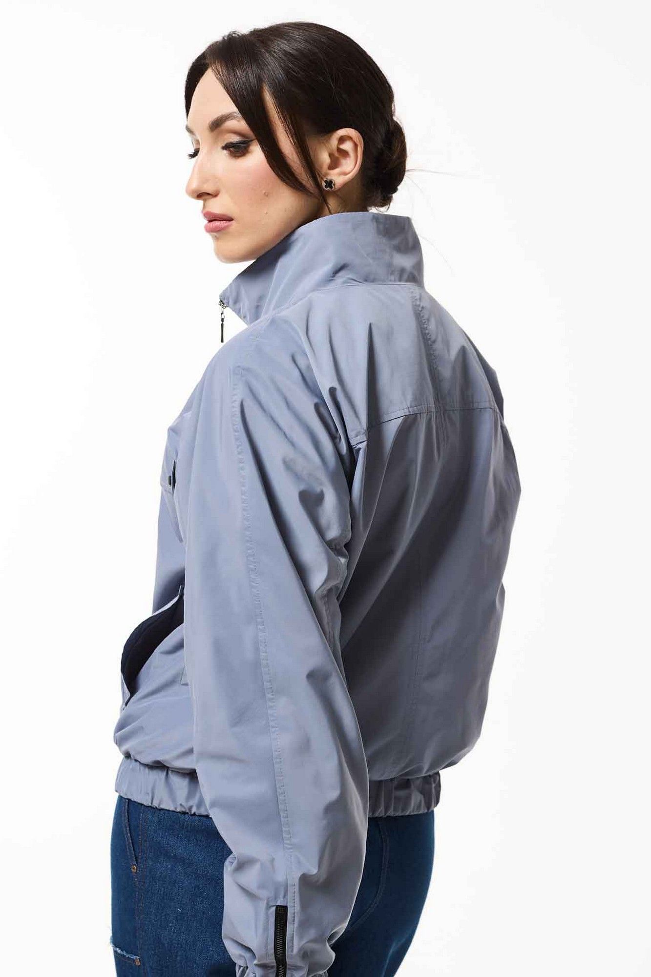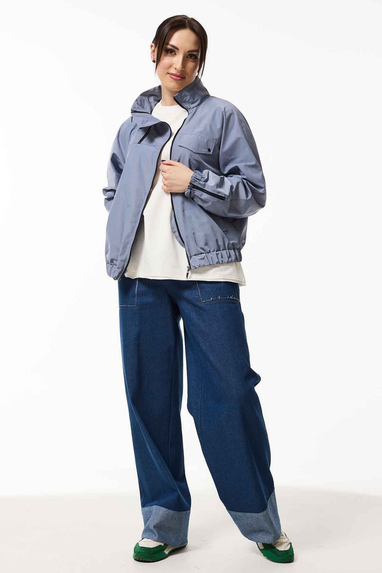Жакет свободный со спущенными плечами на подкладке, по низу притачная планка, в которую продета резинка. По переду накладные карманы с клапанами. Воротник отложной. Рукава одношовные втачные по низу резинка.