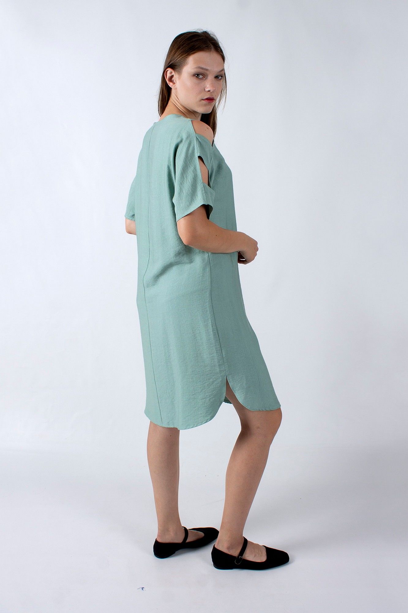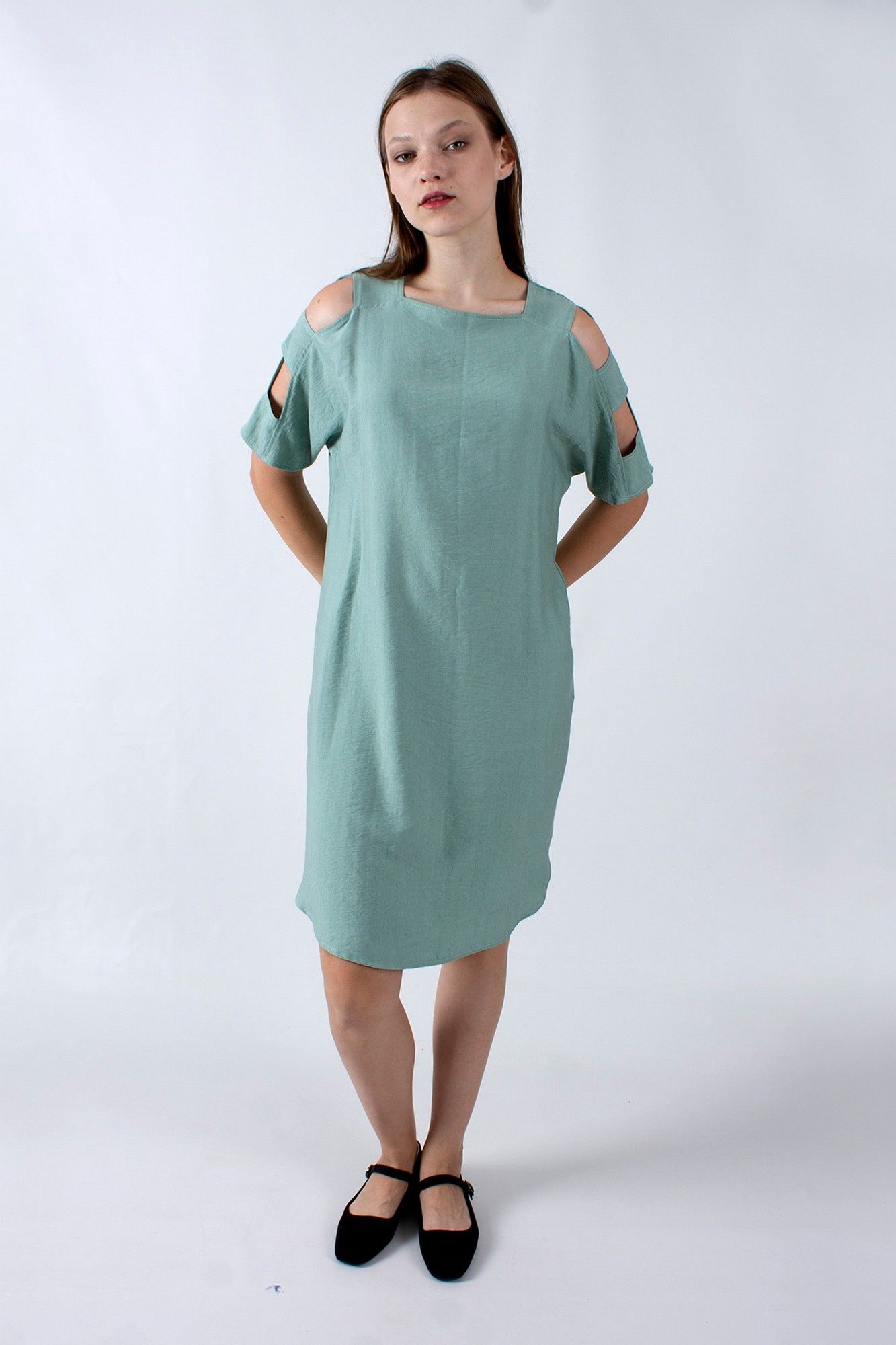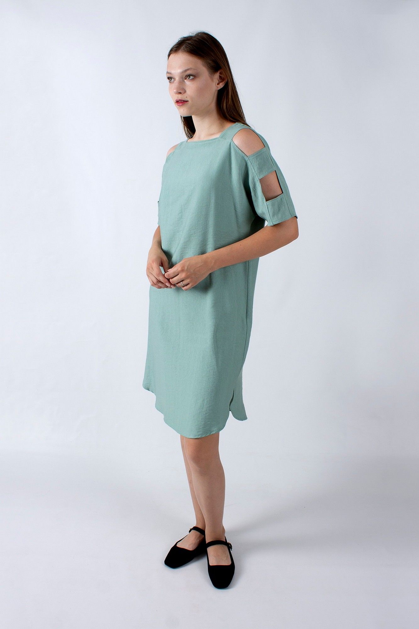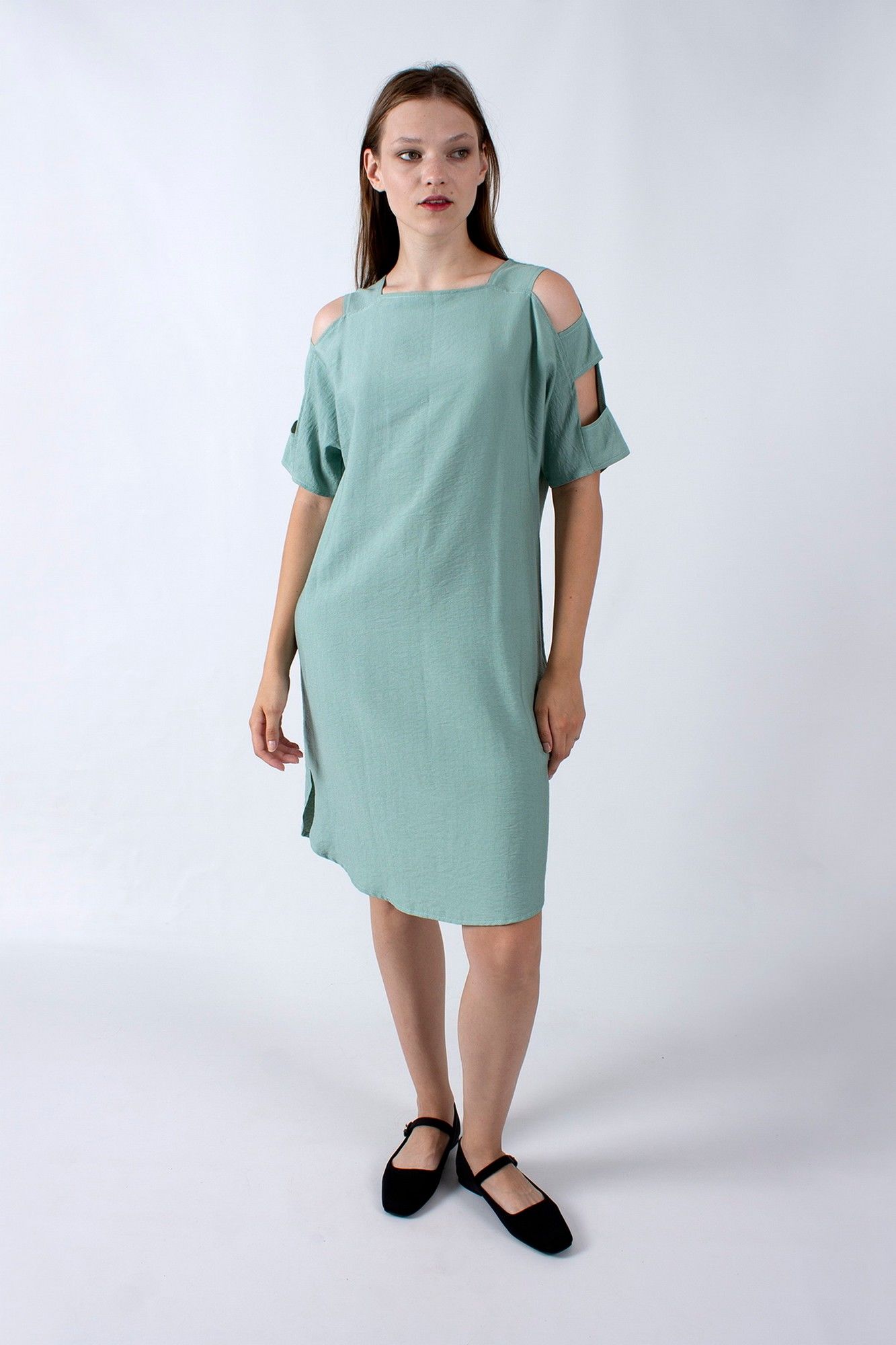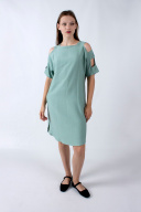 Длина изделия: 100 см. Длина рукава: 33 см. Характеристика: Платье прямого силуэта со спущенным рукавом. Фигурный низ с разрезами. По переду декоративные вставки.