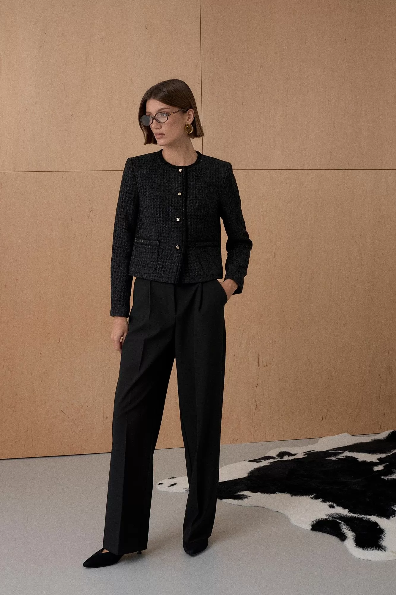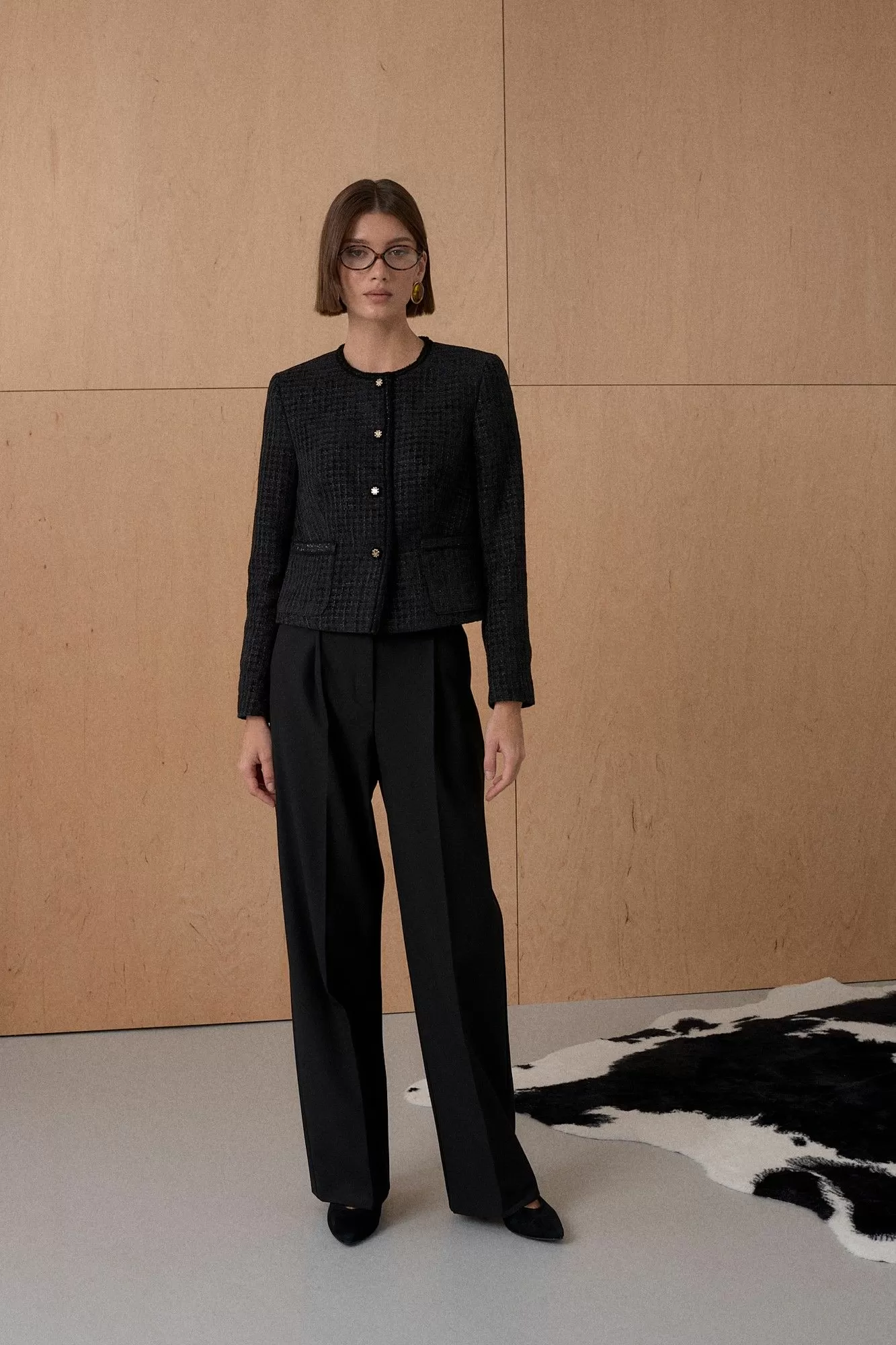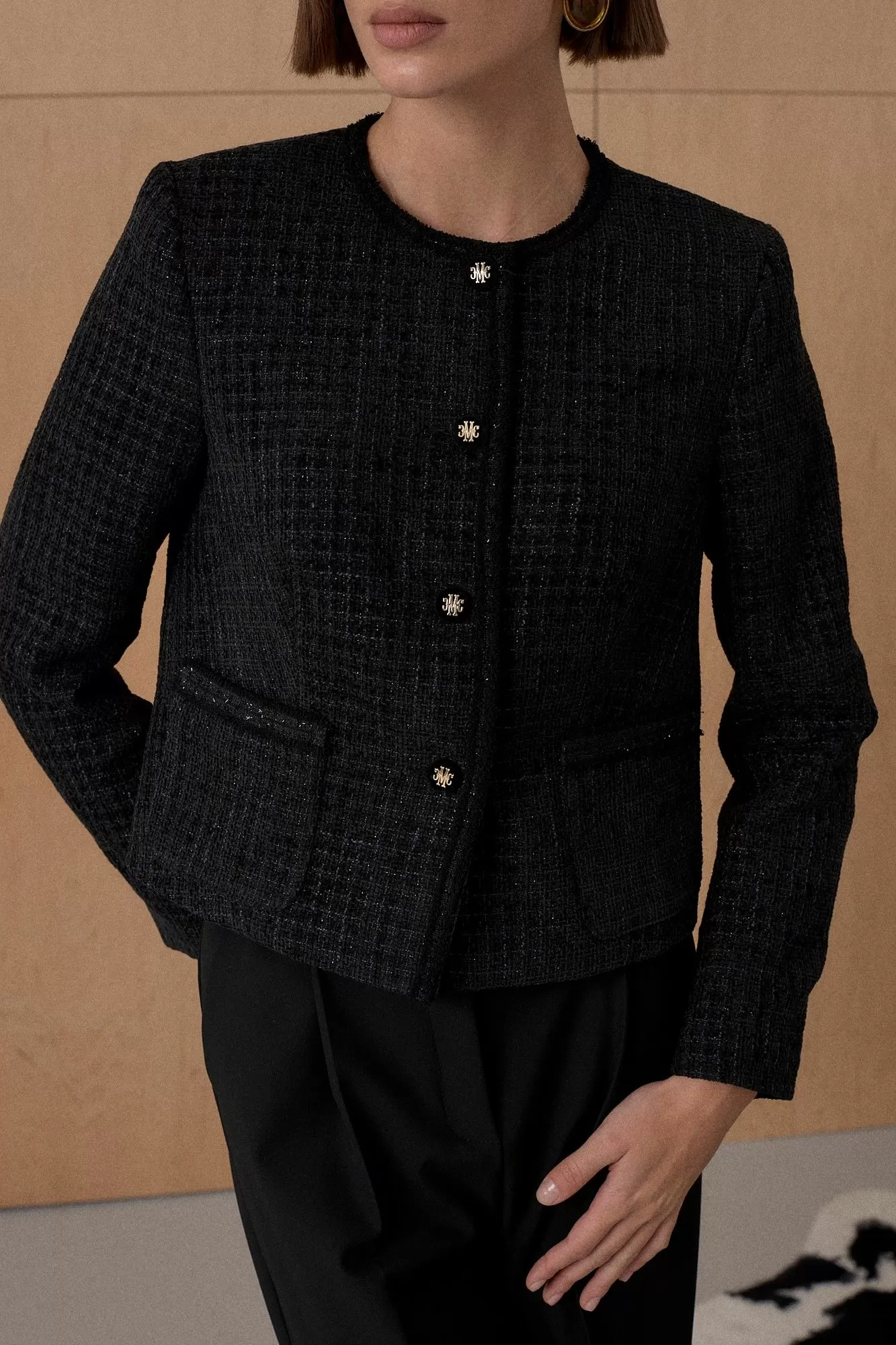 Жакет укороченной формы из благородного жаккарда. Декорирован мерцающей тесьмой. На подкладке. Длина от плечевой точки у основая шеи 52 см. Длина рукава от воротника 76 см. Состав 80% ПЭ, 18% вискоза, 2% спандекс
