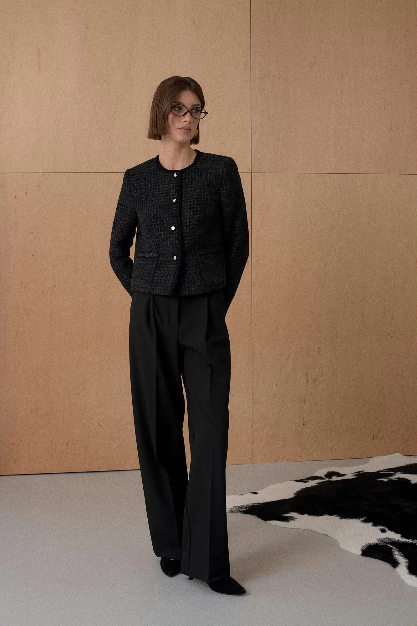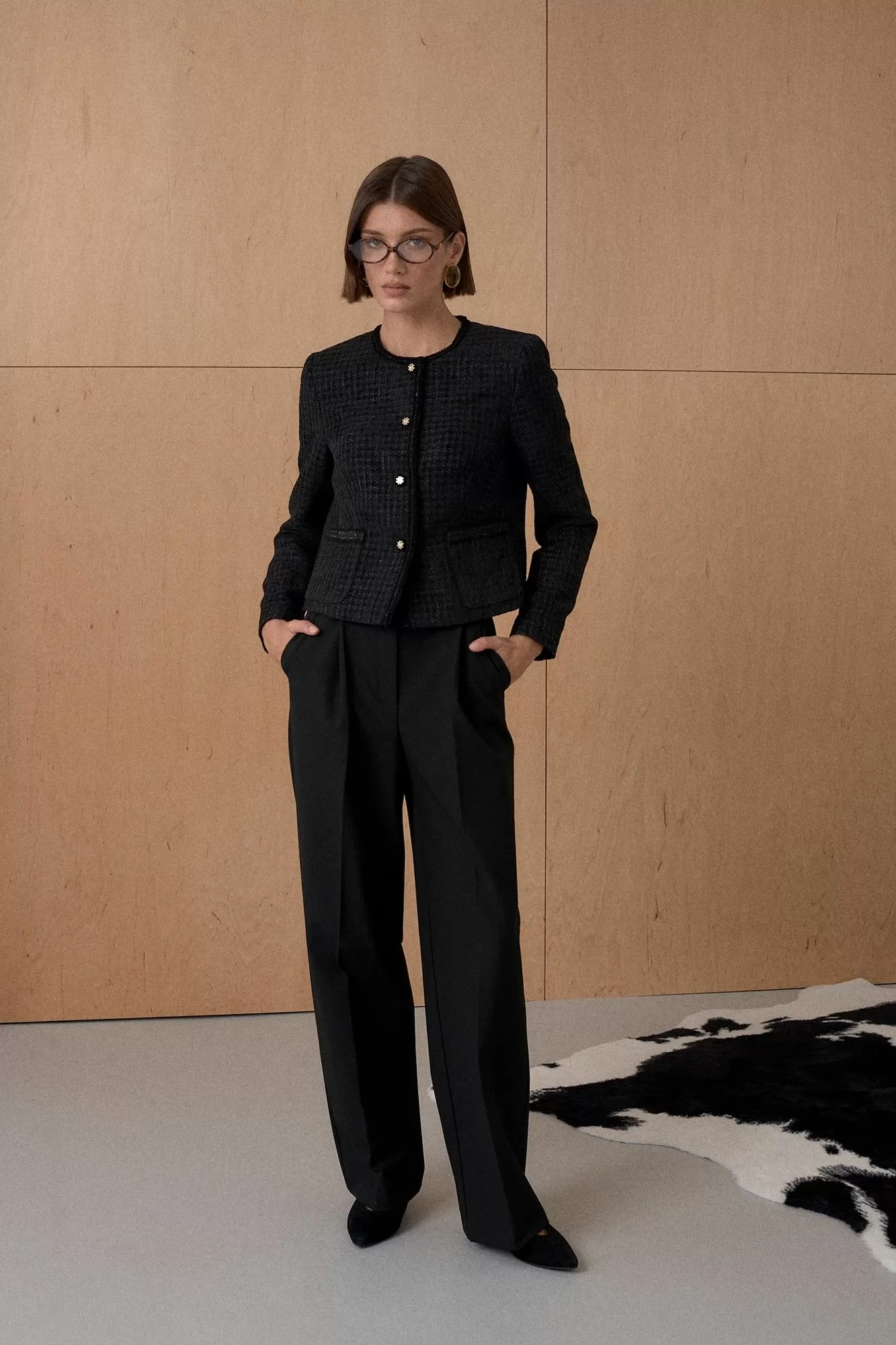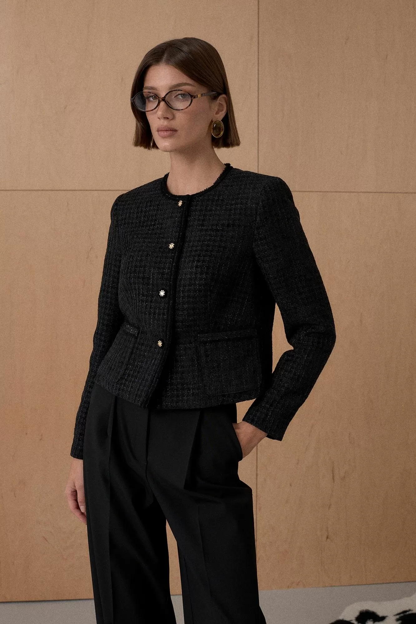 Жакет укороченной формы из благородного жаккарда. Декорирован мерцающей тесьмой. На подкладке. Длина от плечевой точки у основая шеи 52 см. Длина рукава от воротника 76 см. Состав 80% ПЭ, 18% вискоза, 2% спандекс