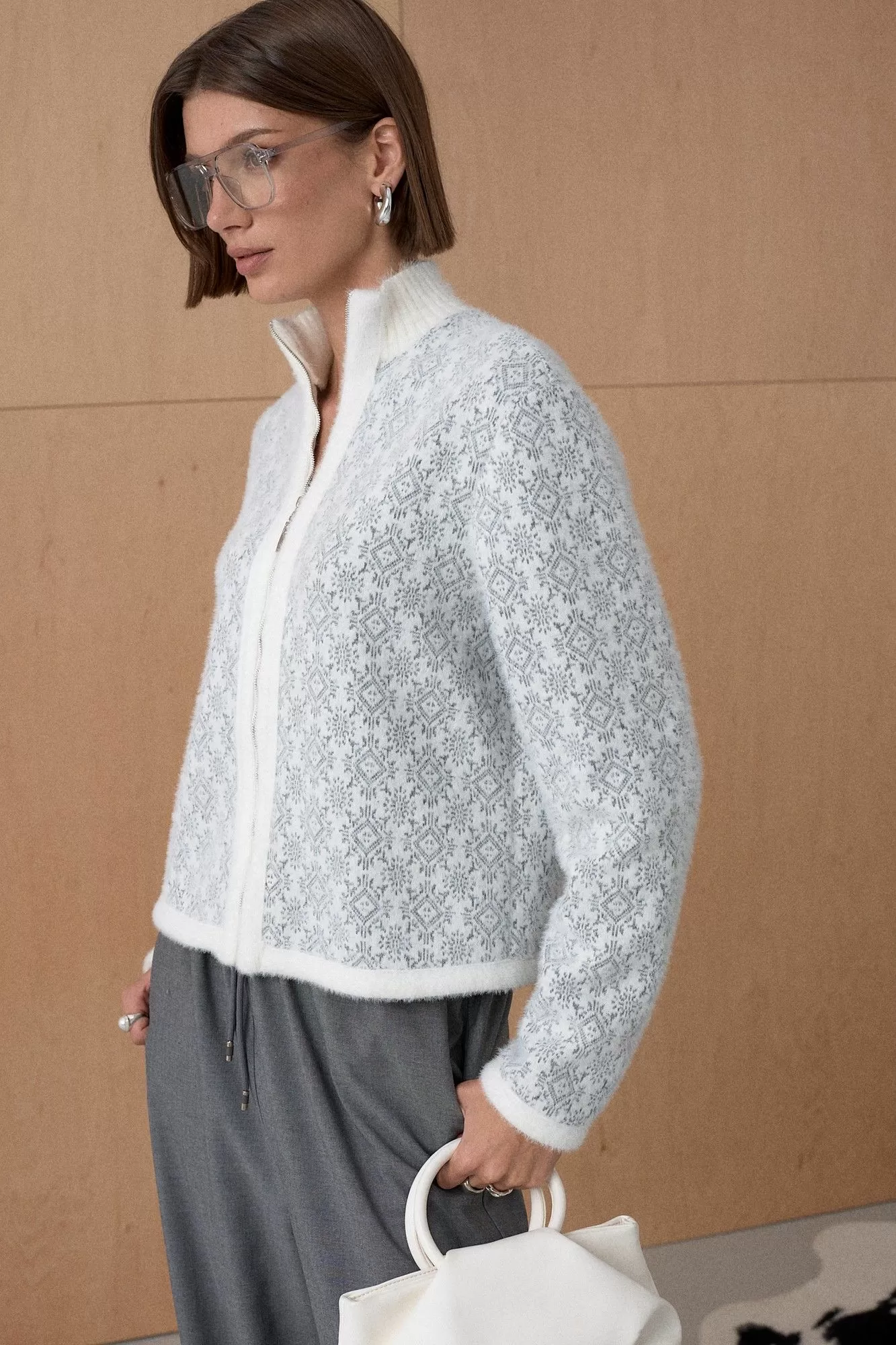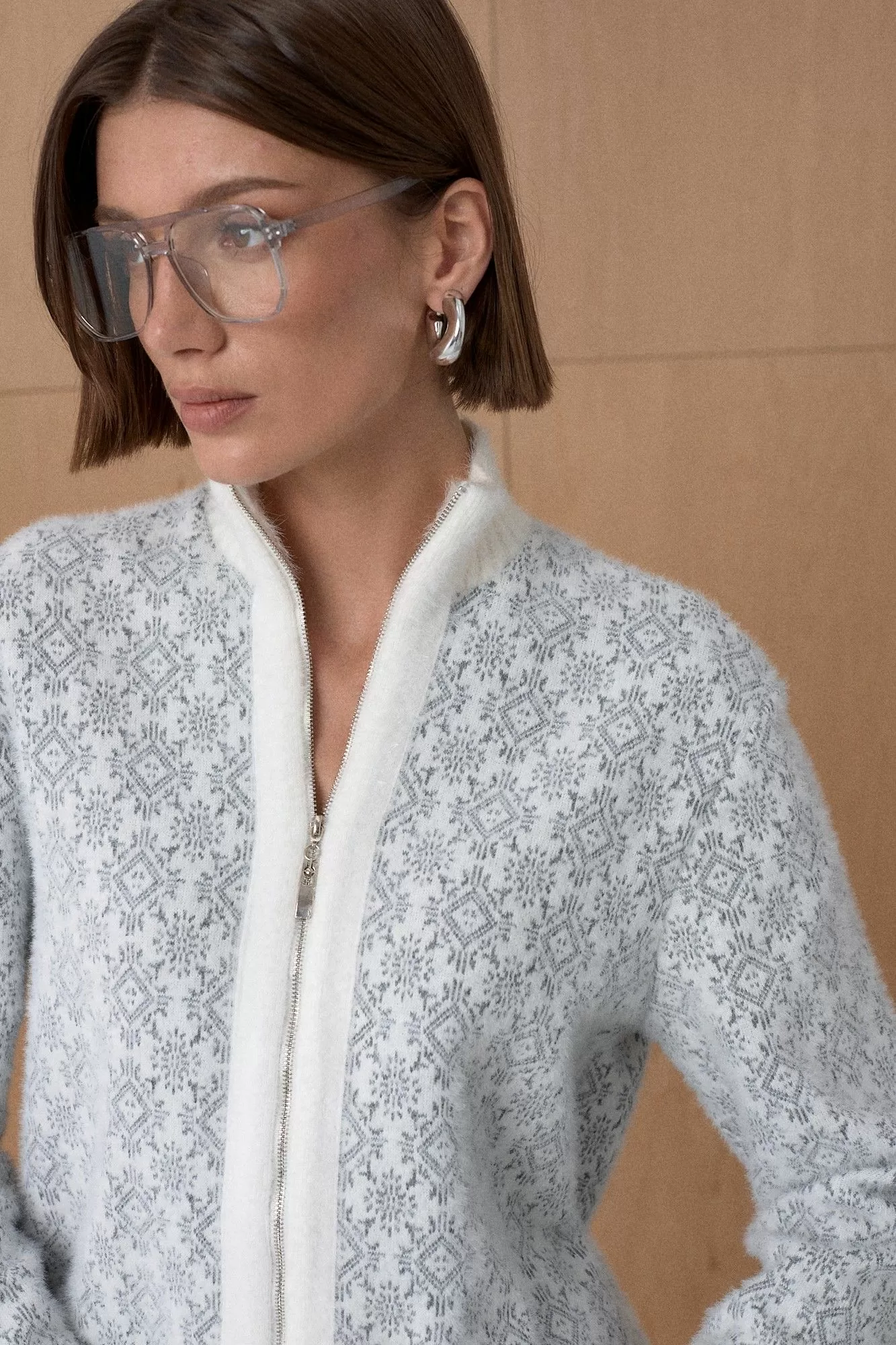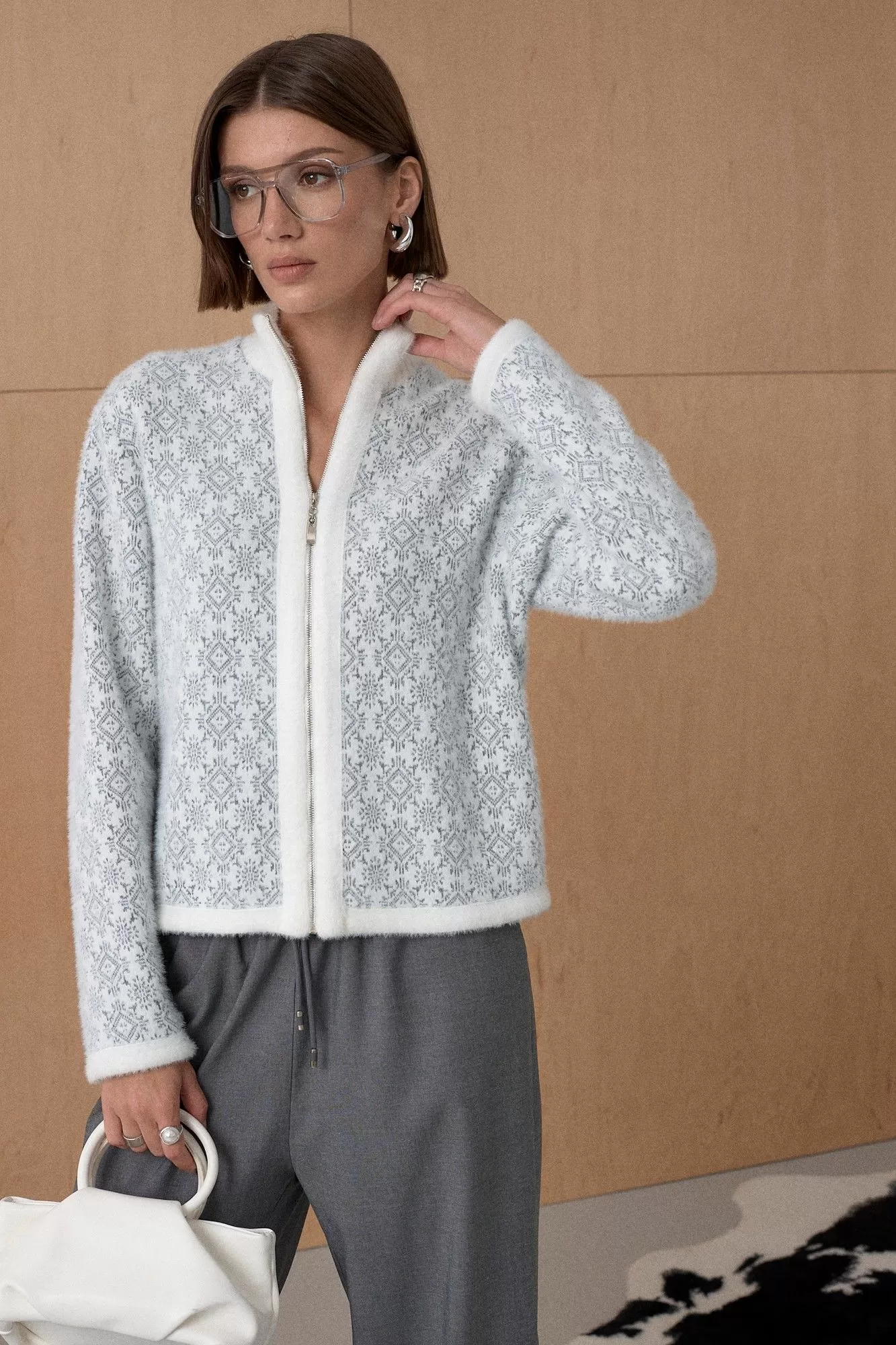 Джемпер из трикотажного полотна с принтом на молнии. Длина от плечевой точки у основая шеи 58 см. Состав 51% нейлон, 45% вискоза, 4% спандекс.