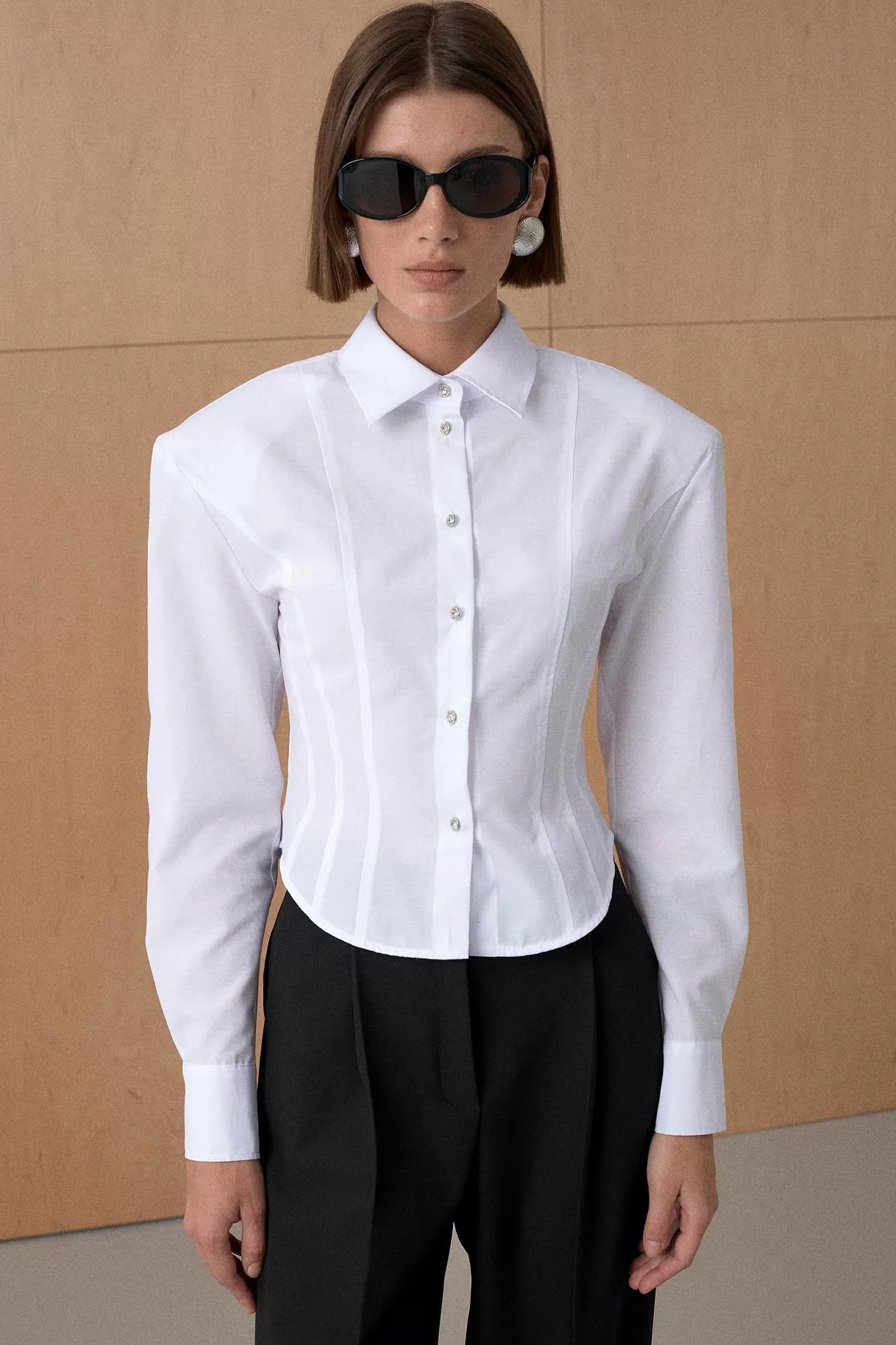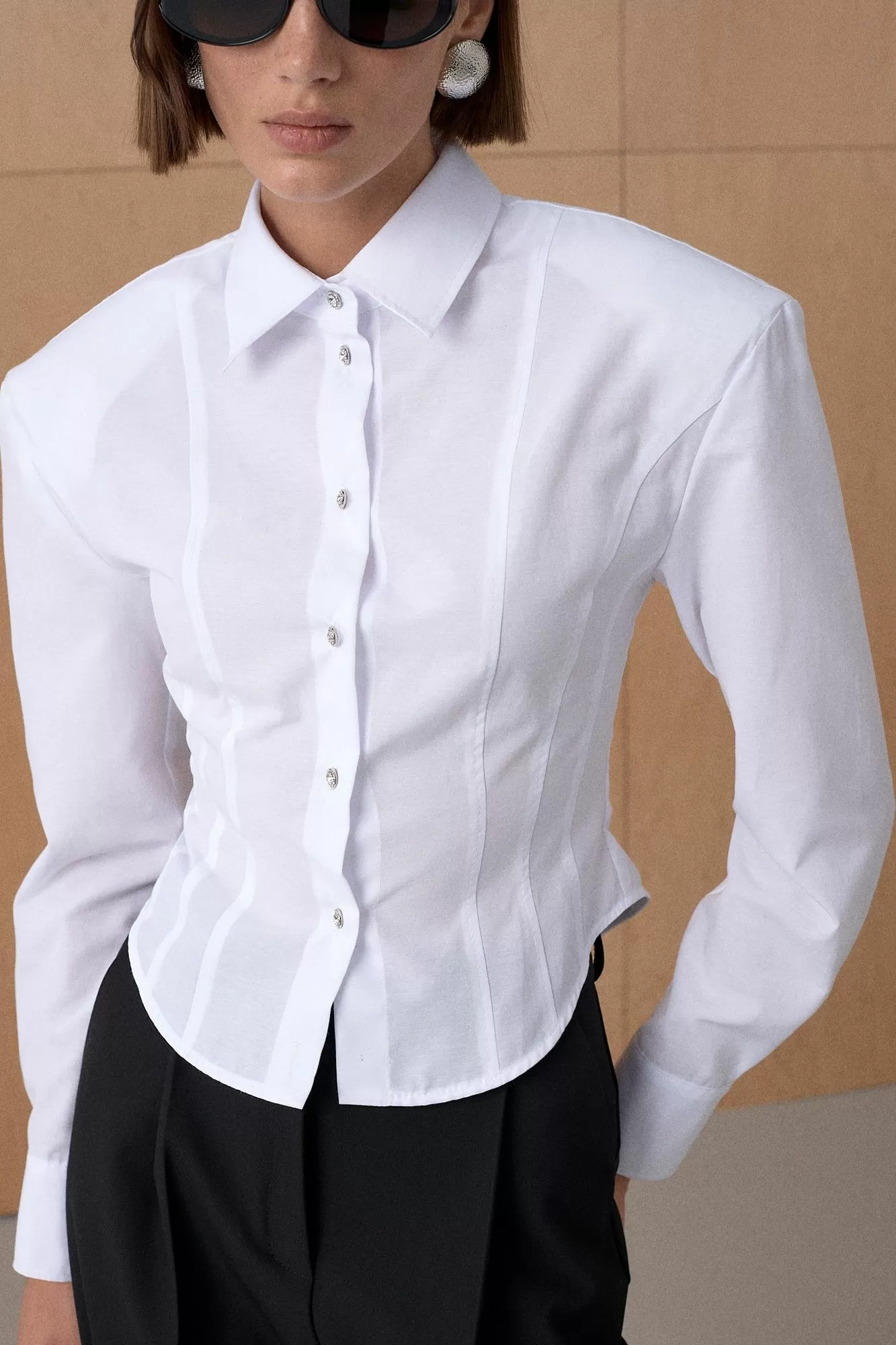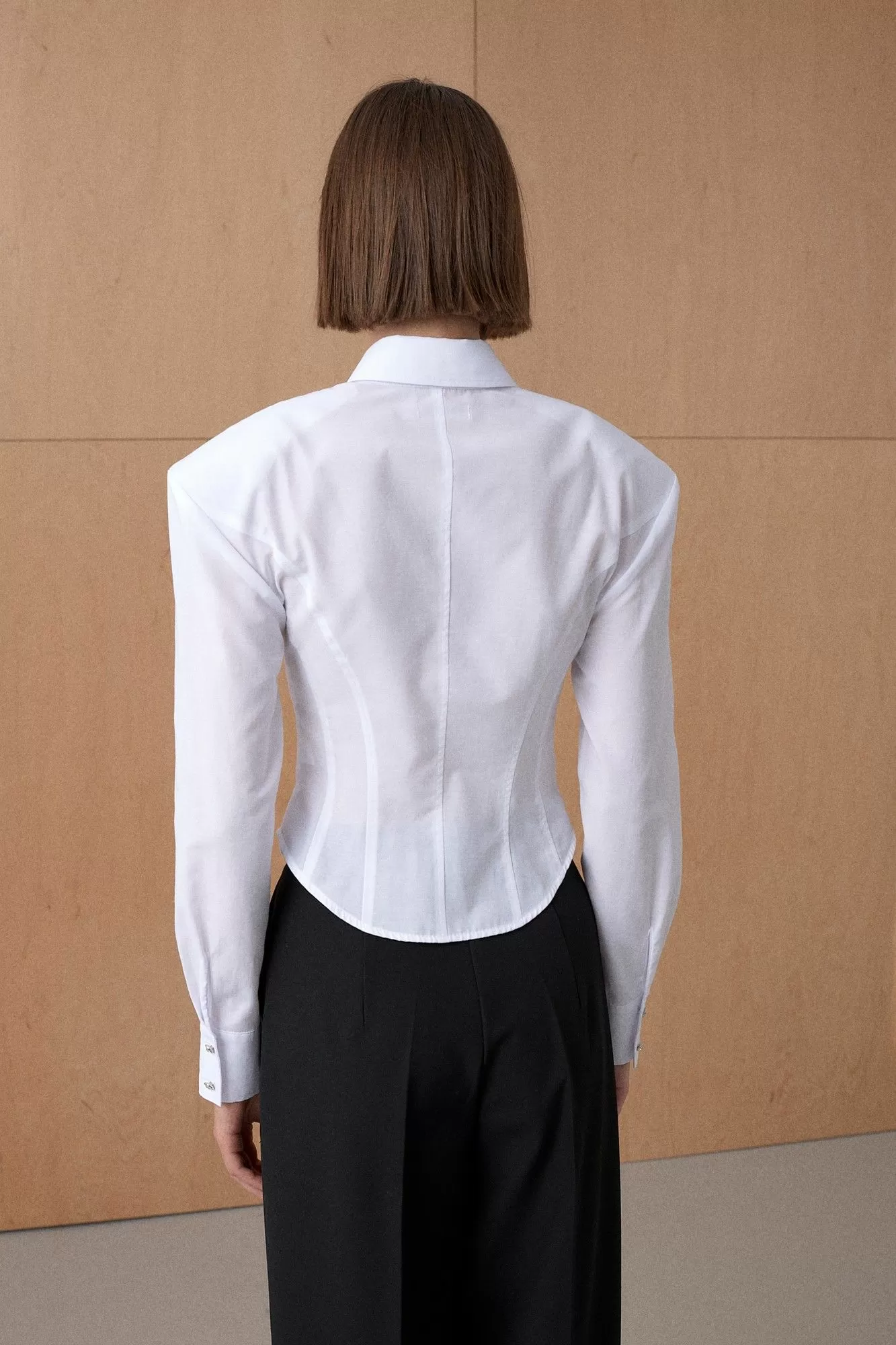 Блуза из хлопка с имитацией корсетной формы по талии. Усиленная и расширенная форма плеча. Длина от плечевой точки у основая шеи 54 см. Состав 66% хлопок, 31% нейлон, 3% спандекс.