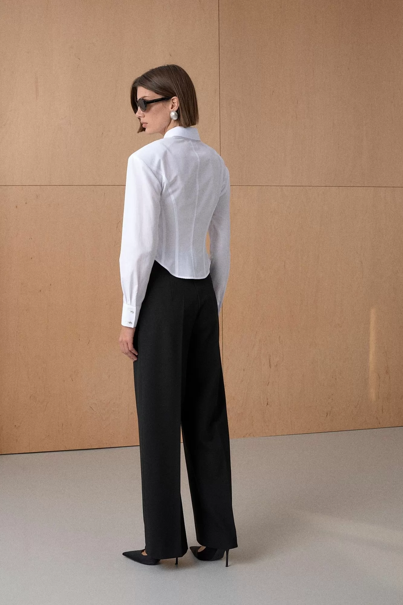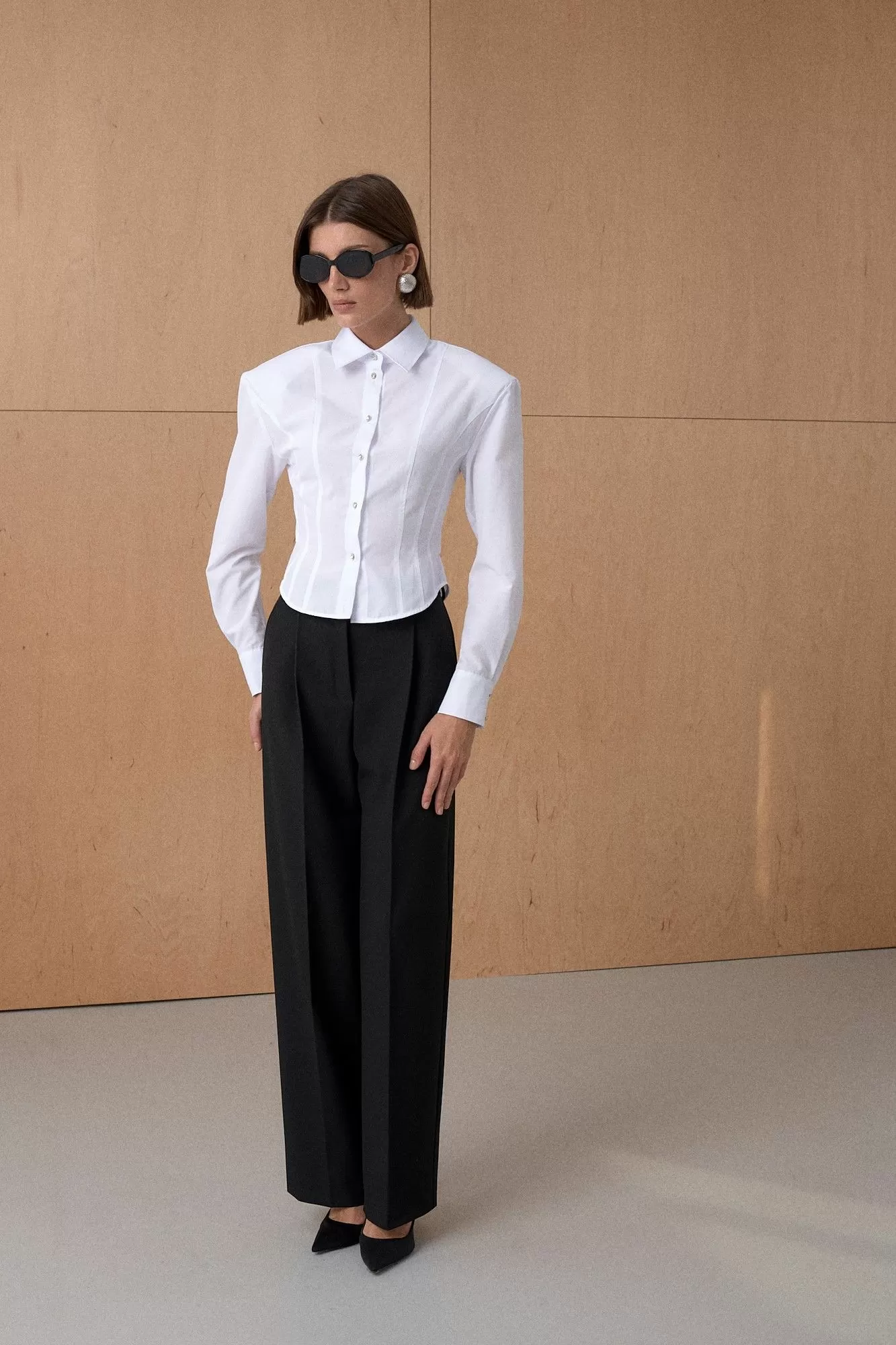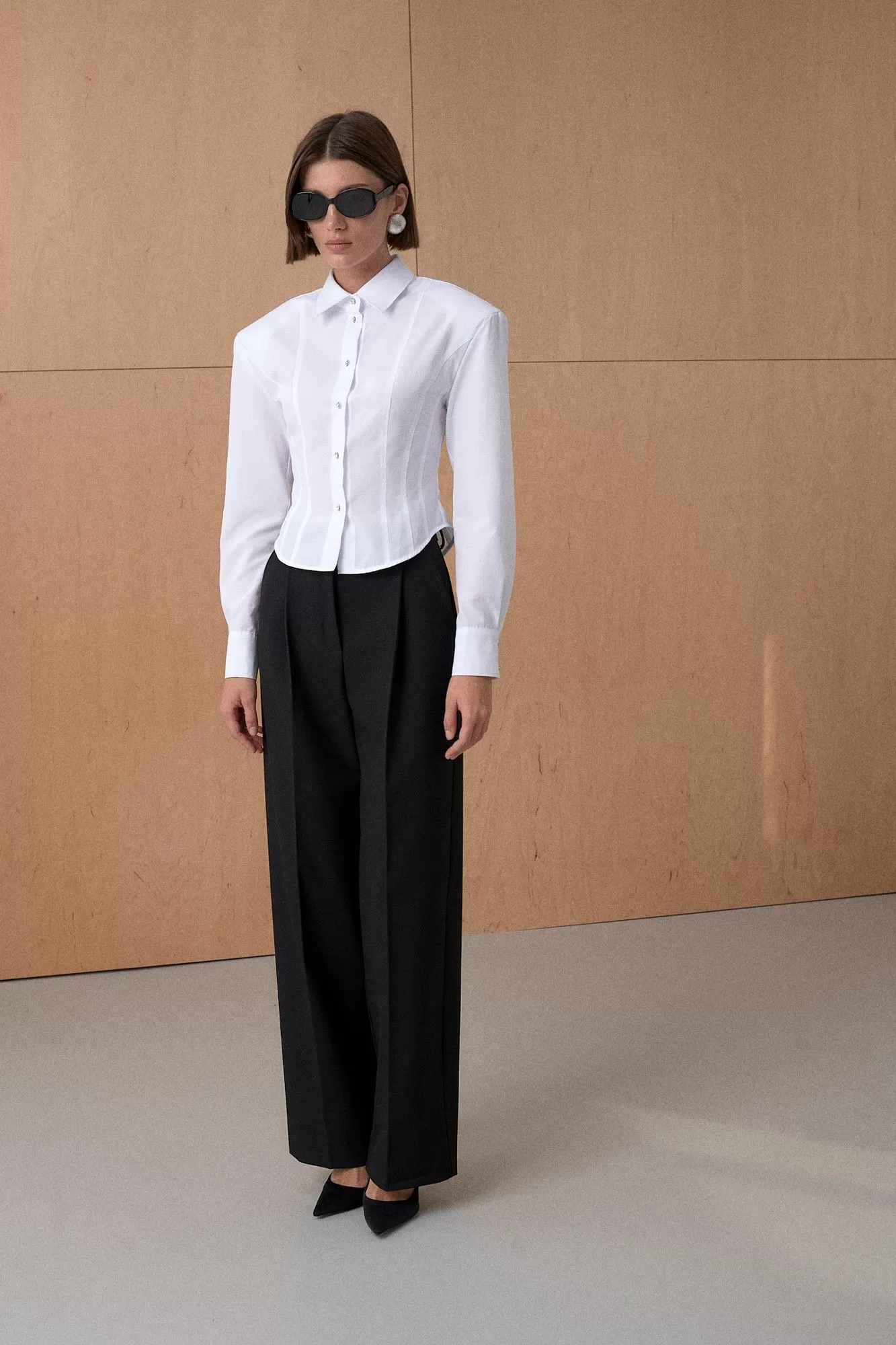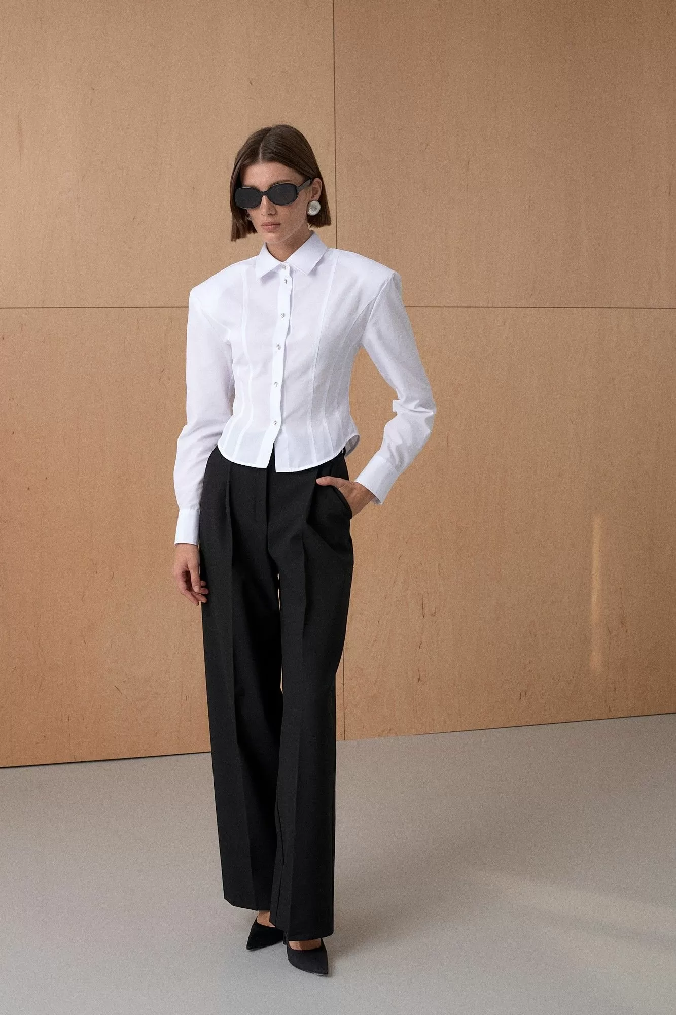 Блуза из хлопка с имитацией корсетной формы по талии. Усиленная и расширенная форма плеча. Длина от плечевой точки у основая шеи 54 см. Состав 66% хлопок, 31% нейлон, 3% спандекс.