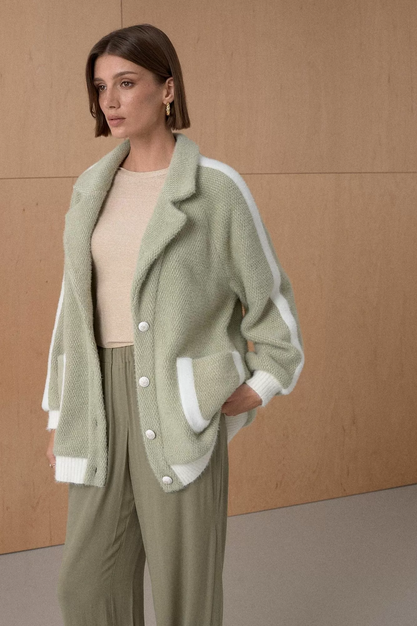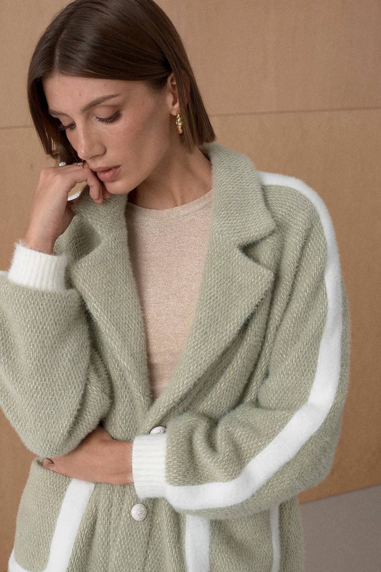 Жакет из твидовой ткани декорирован лентами в виде лампасов. На подкладке. Длина от плечевой точки у основая шеи 76 см. Состав 51% нейлон, 45% вискоза, 4% спандекс.