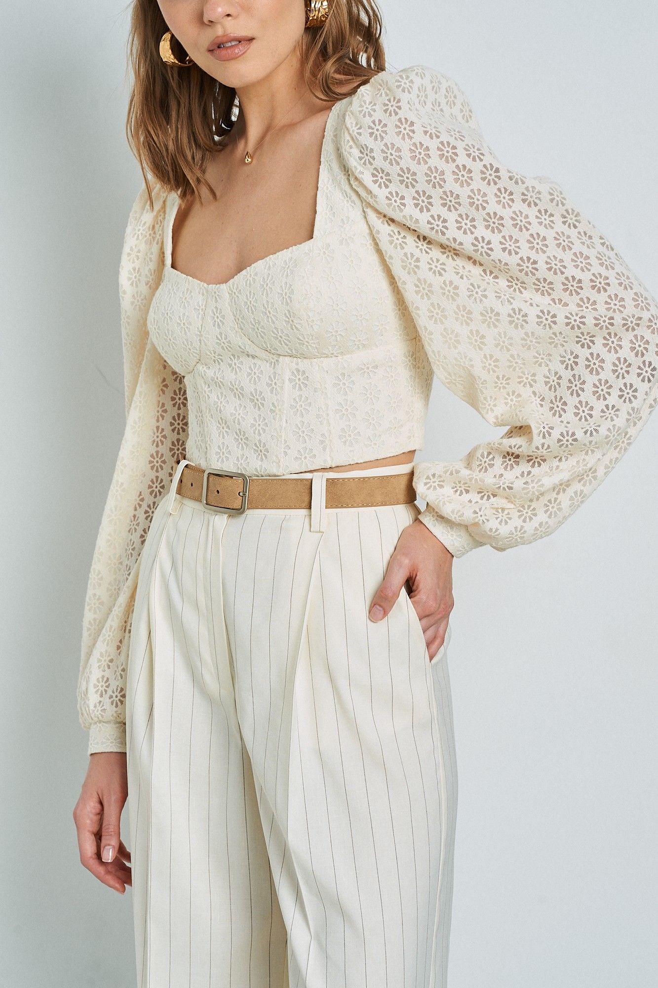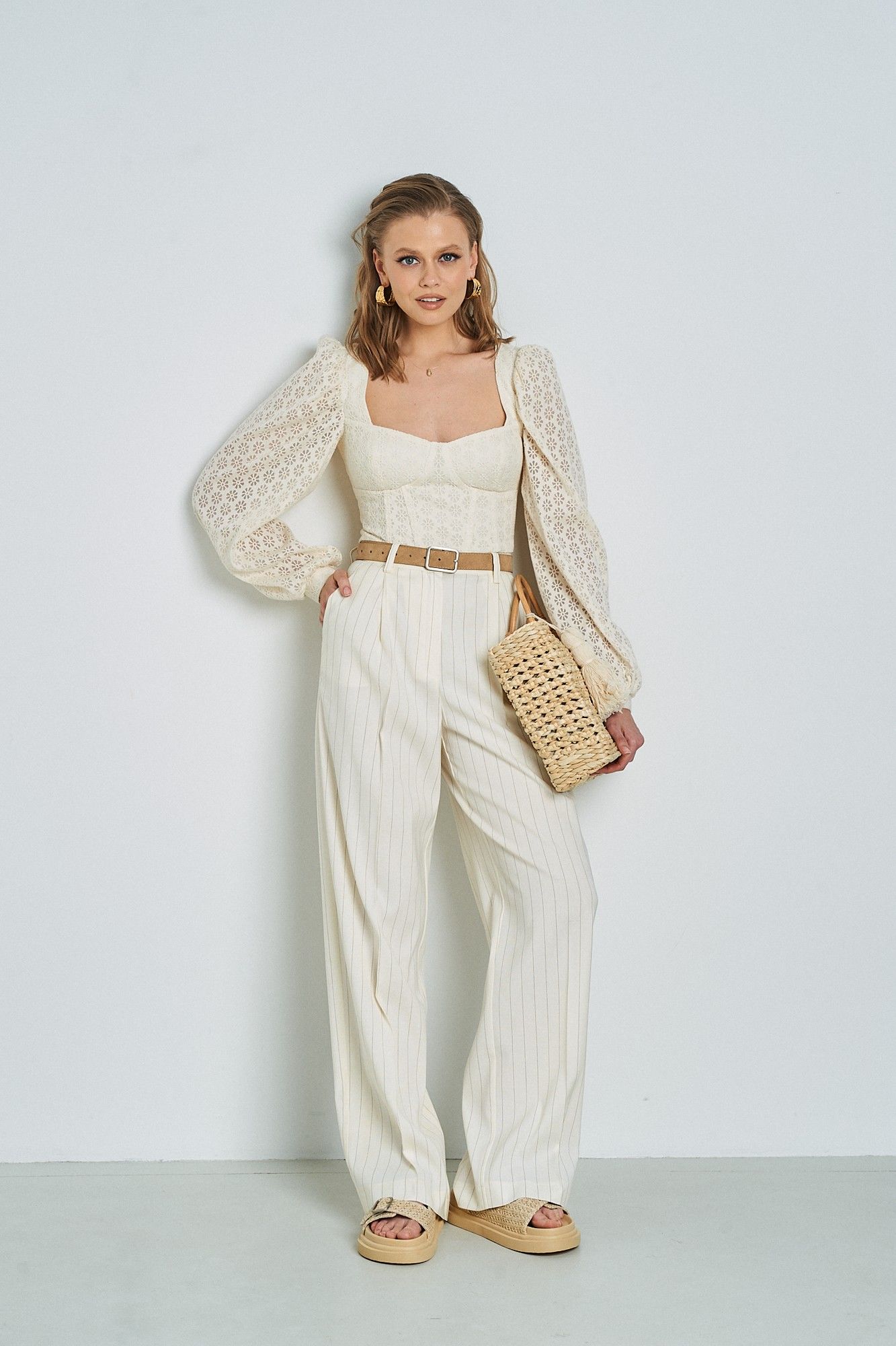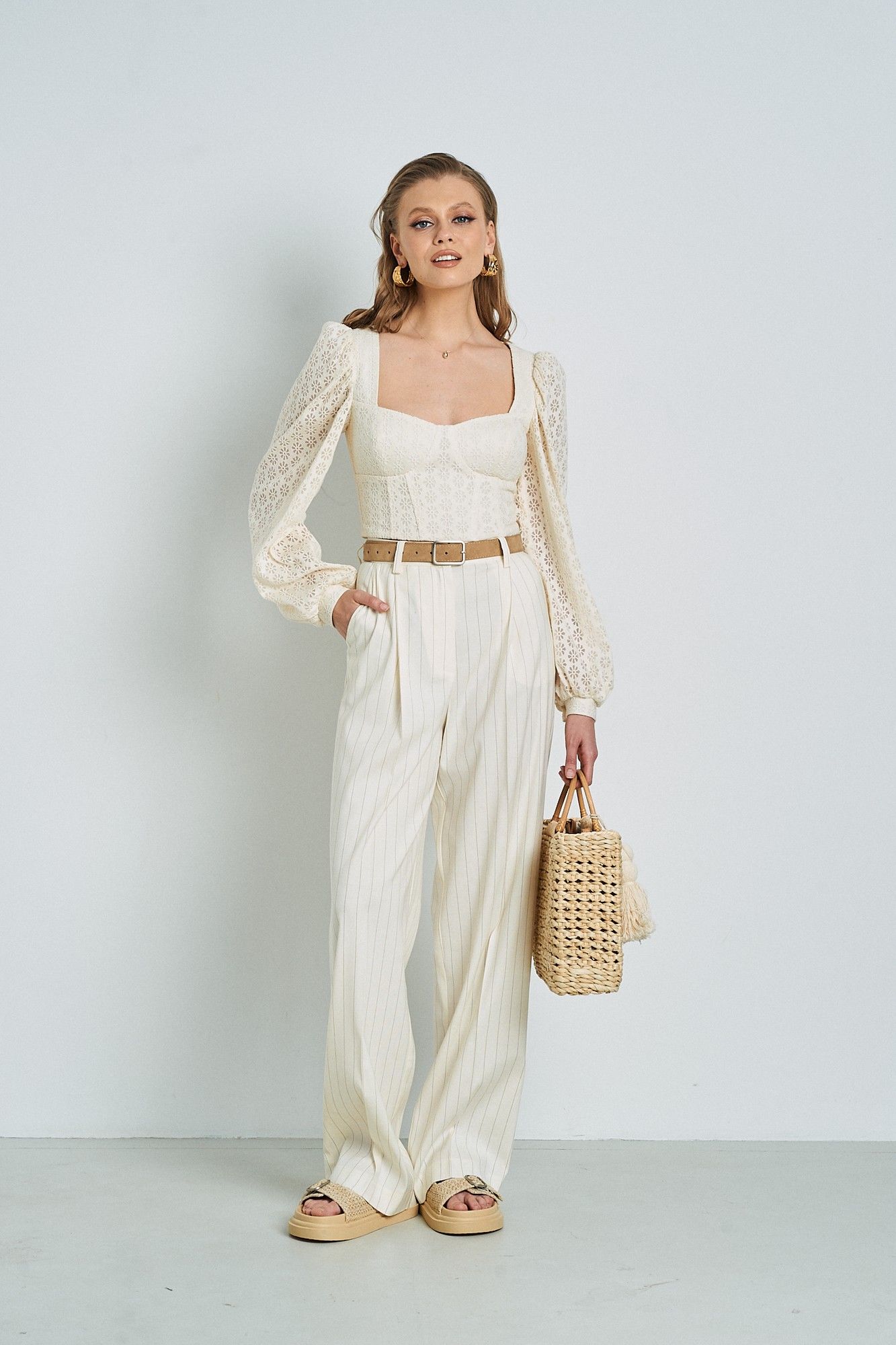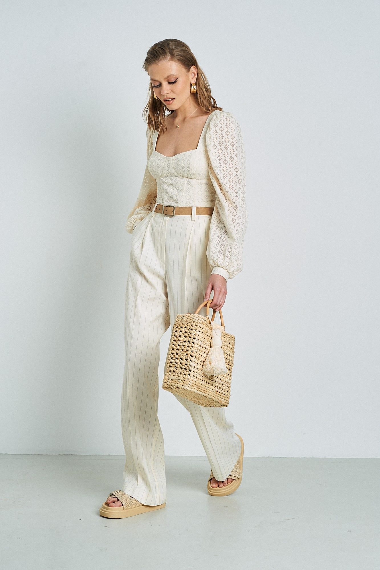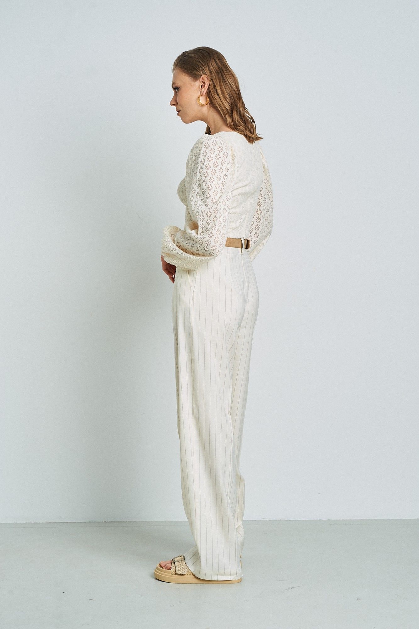 Брюки из мягкой льняной ткани в мелкую полоску прямого силуэта с защипами по талии. Длина брюк 112 см. Состав 30% лен, 70% вискоза.