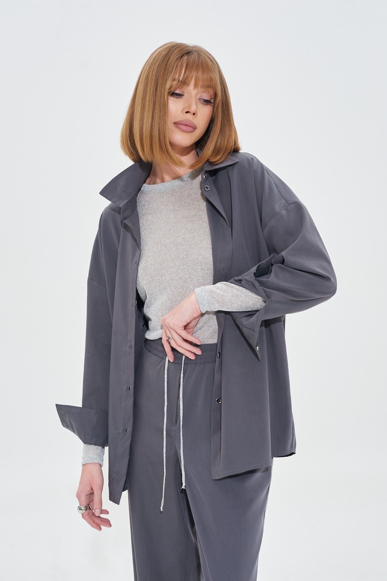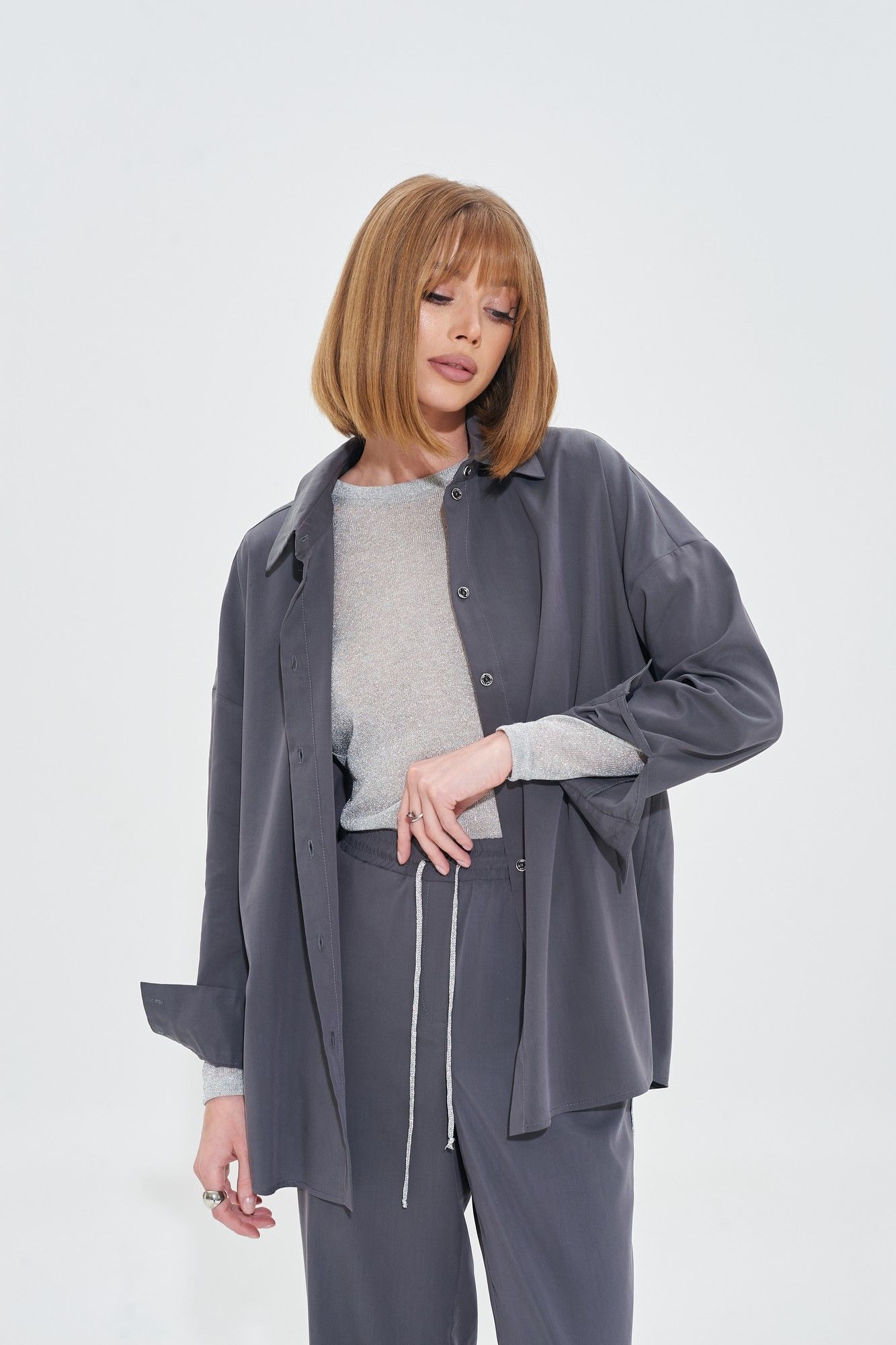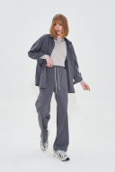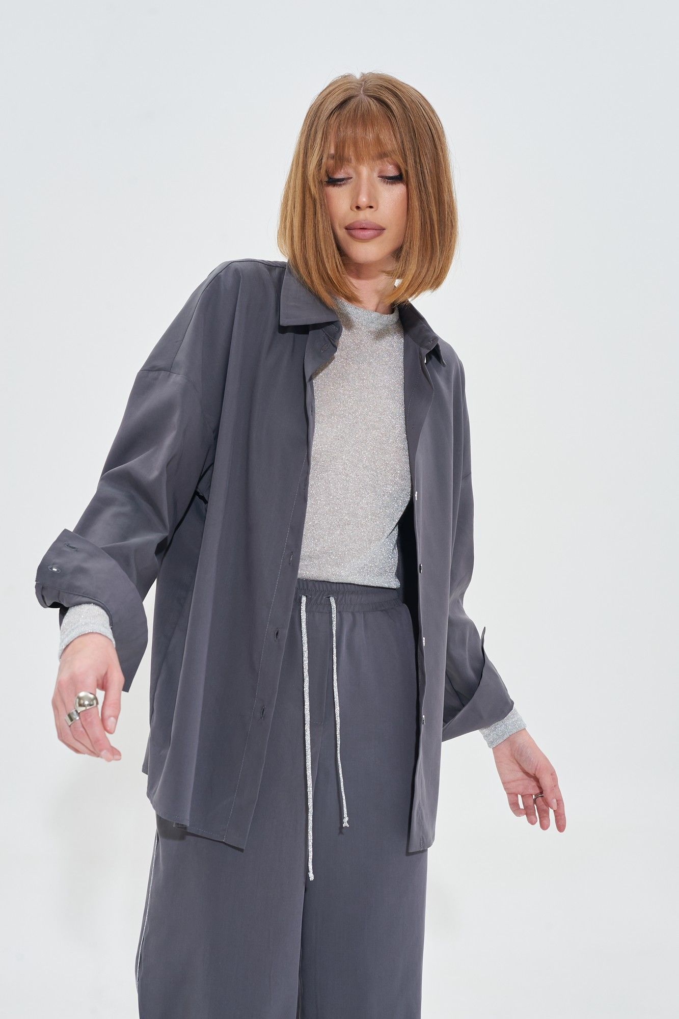 Костюм двойка свободного силуэта. Рубашка с длинным рукавом. Застежка на пуговицы. Брюки на резинке. В боковых швах карманы. Длина рубашки 70 см Длина рукава от воротника 75 см Длина брюк 110 см
