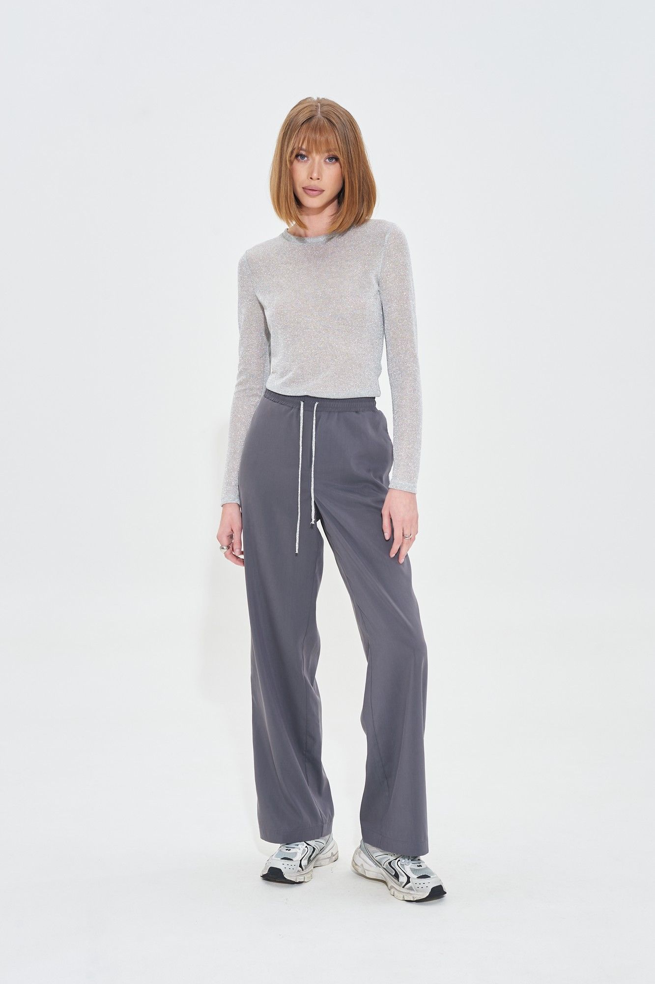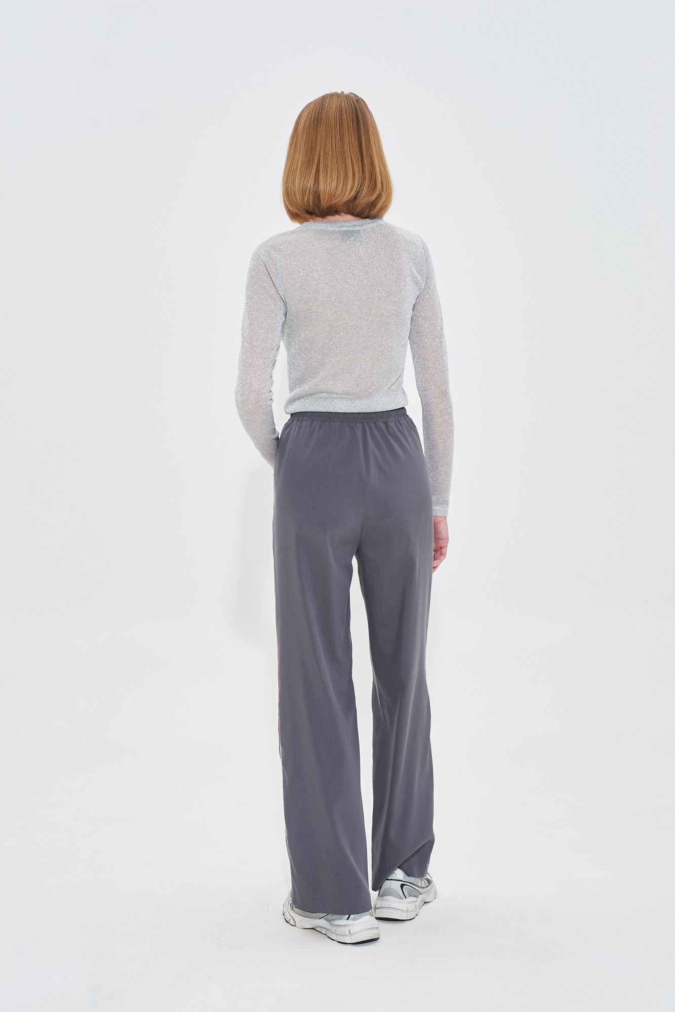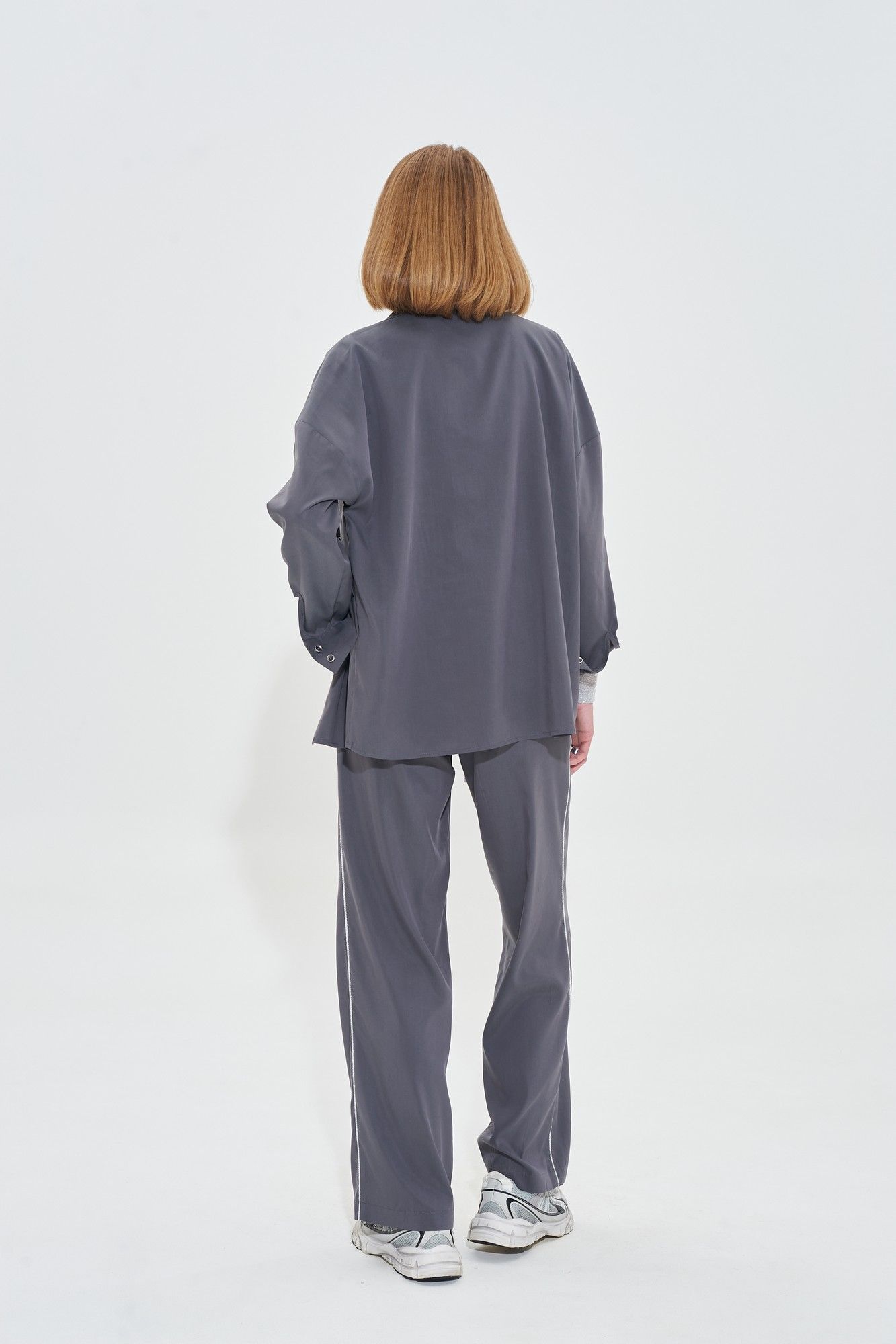 Костюм двойка свободного силуэта. Рубашка с длинным рукавом. Застежка на пуговицы. Брюки на резинке. В боковых швах карманы. Длина рубашки 70 см Длина рукава от воротника 75 см Длина брюк 110 см