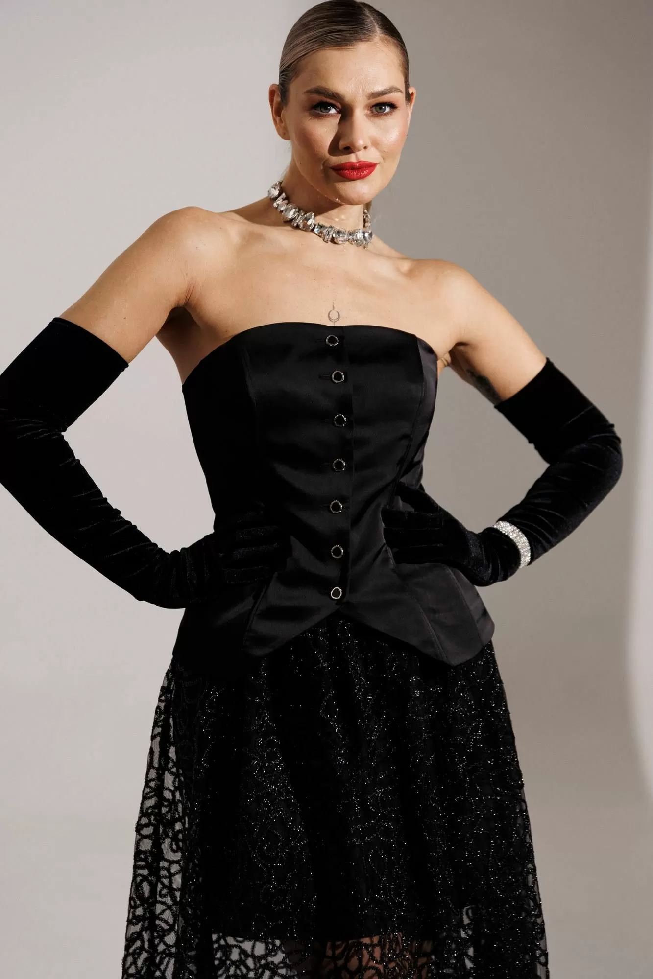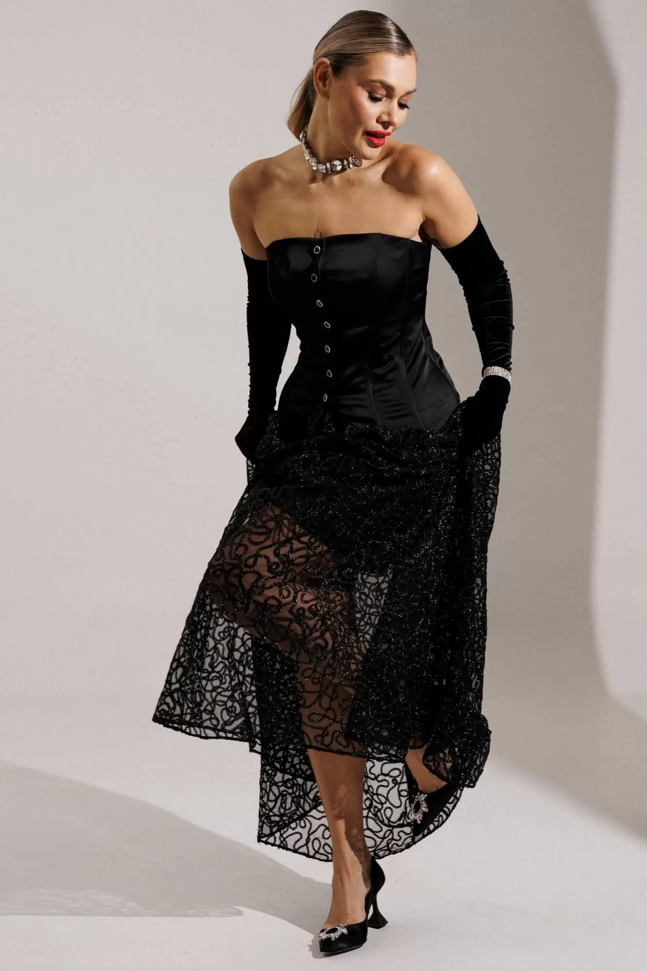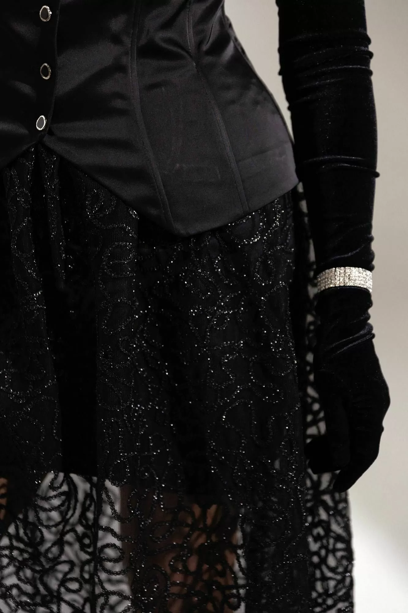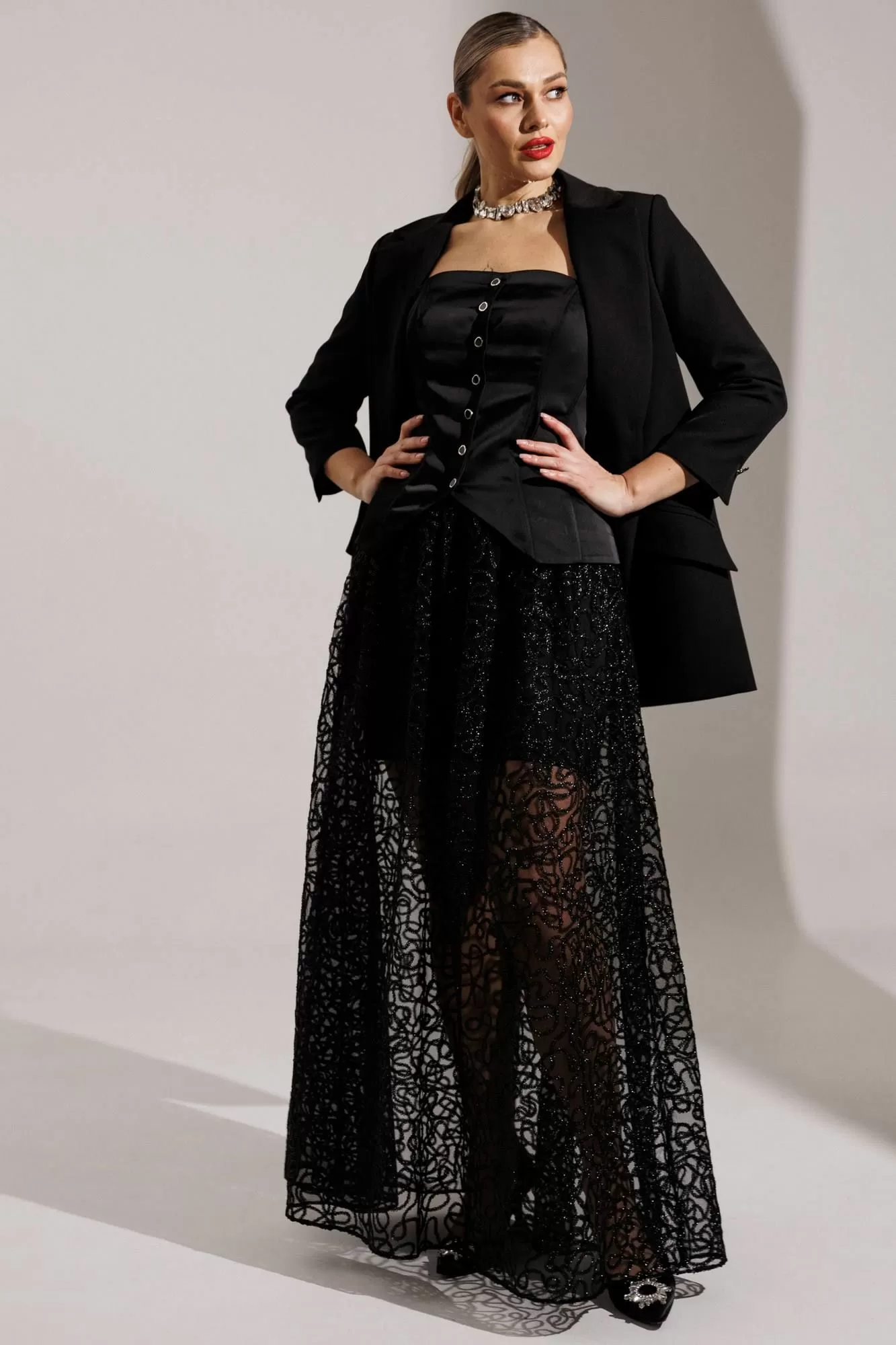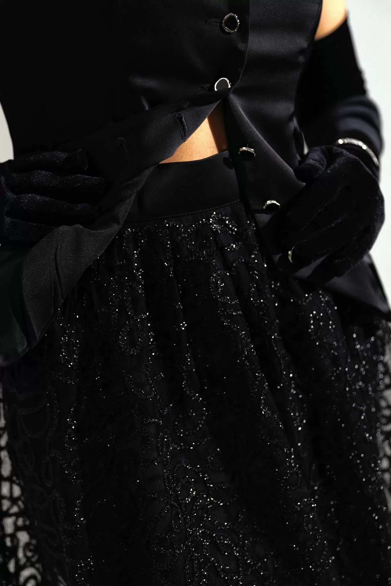 Хотите образ, который соберет все восторженные взгляды? Не ищите дальше! Встречайте главную героиню новогодней ночи! Юбка, которая состоит из двух слоев: нижняя часть зауженная мини, а верхняя — длинная, пышная. Верхний слой выполнен из черной сетки, расшитой декоративной тесьмой. Притачной пояс и молния сзади завершают образ. Вы выглядите безупречно и чувствуете себя уверенно в любом движении! Завершите образ с помощью корсета из нашей новогодней коллекции. В дуэте они раскрываются на все 100%: баланс пышности низа и собранного верха. Ваш готовый билет на самый стильный Новый год!