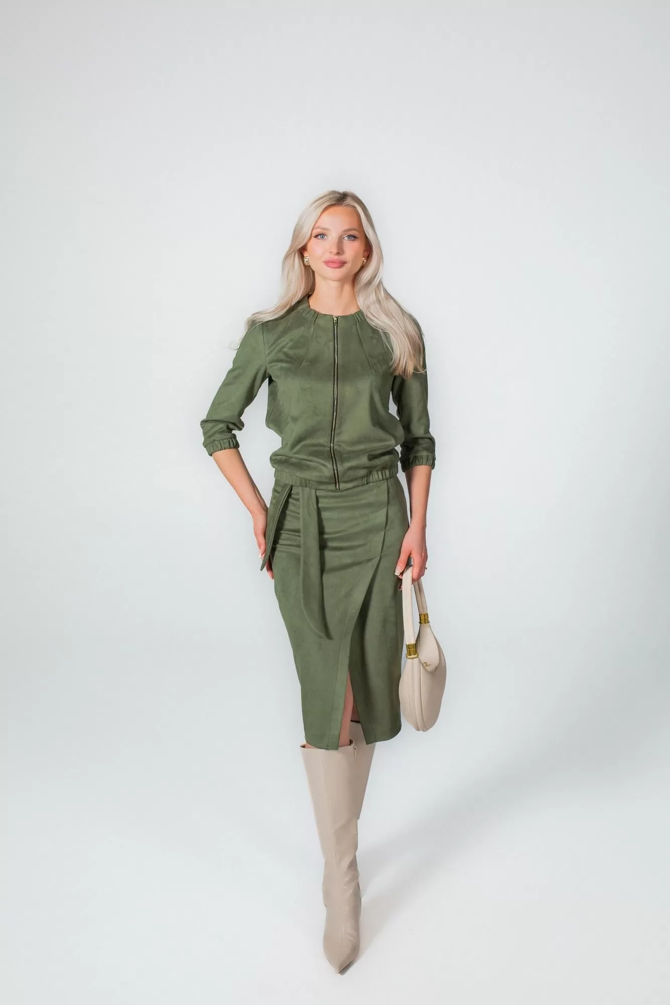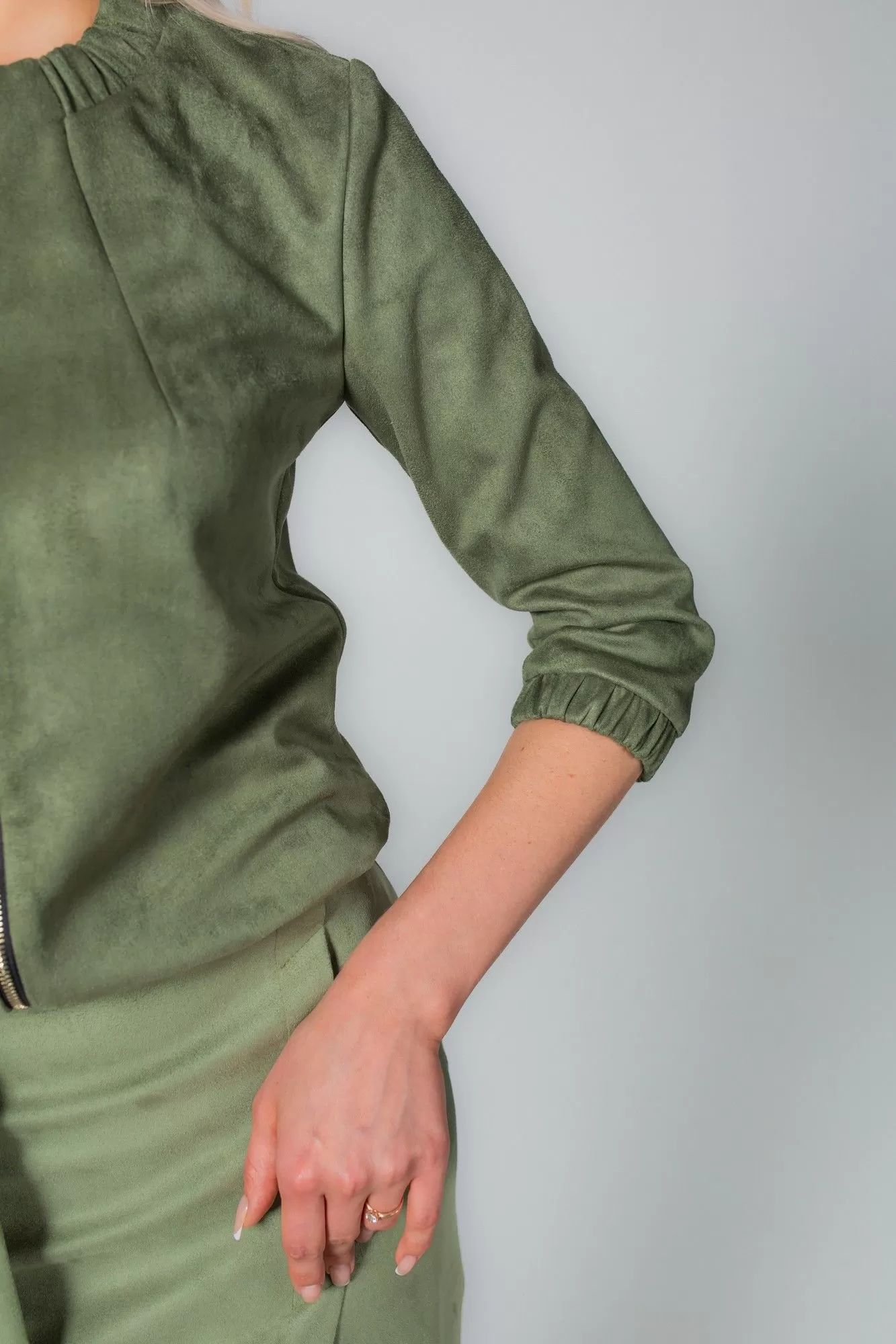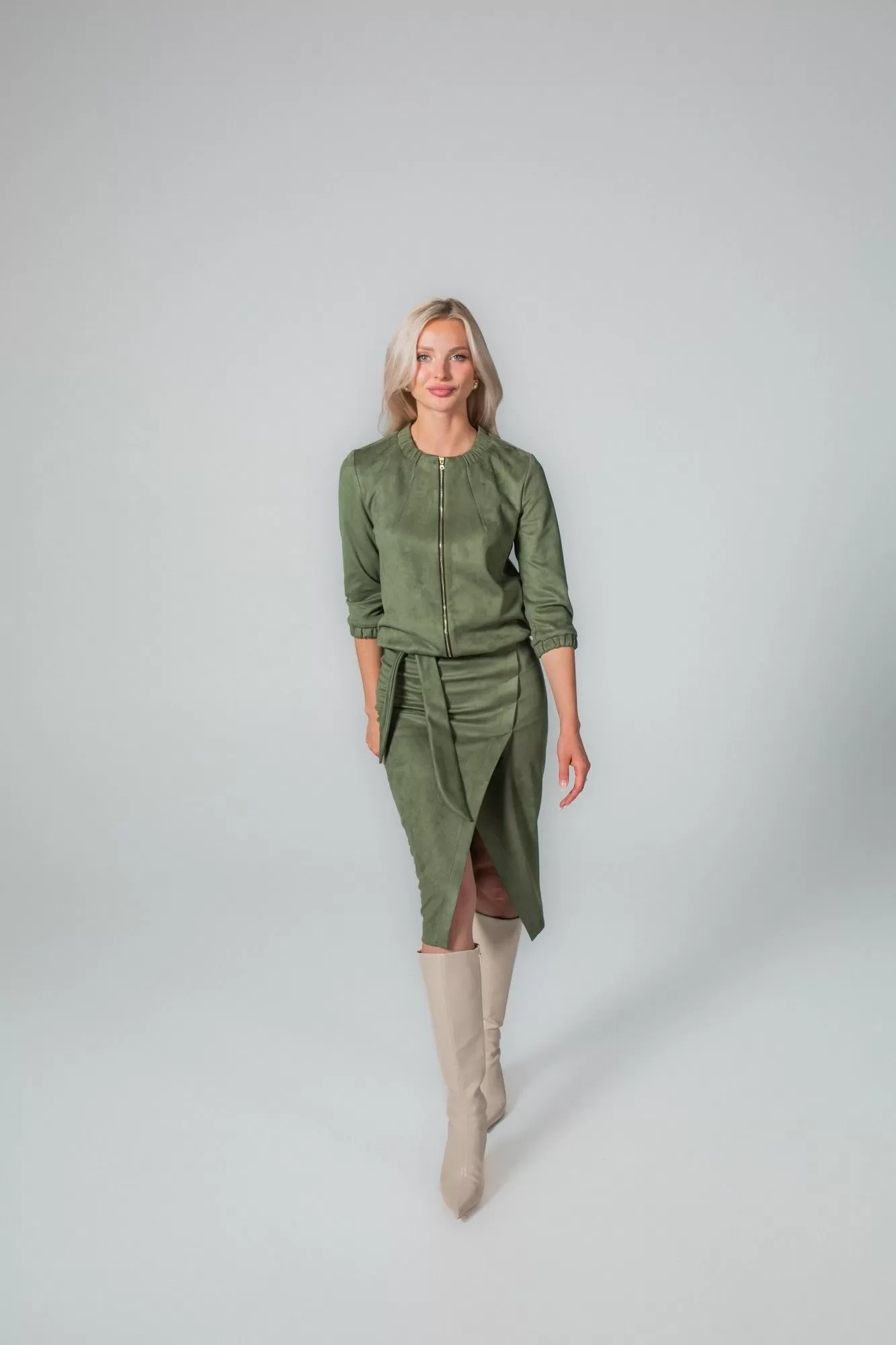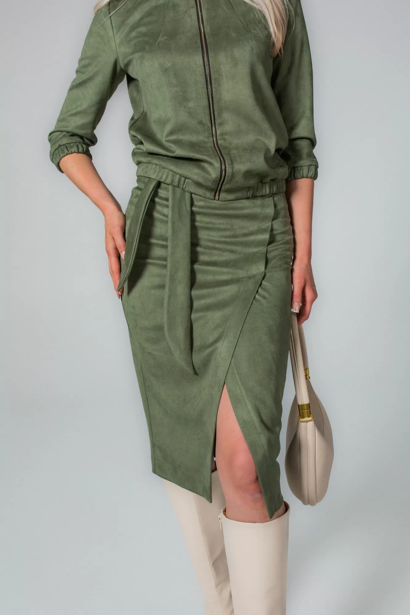 Комплект, состоящий из жакета на молнии и юбки. Выполнен из непрозрачной высококачественной замши на трикотажной основе. Жакет прямого силуэта, по низу манжета с резинкой, по горловине в бейку также втянута резинка. Без подкладки, карманов и воротника. Перед с нагрудными вытачками. Рукав втачной одношовный с манжетой на резинке. Юбка-карандаш длиной чуть ниже колена, без подкладки. По переду имитация запаха. По спинке в среднем шве застежка на потайную молнию. В боковые швы вставлен завязывающийся пояс.