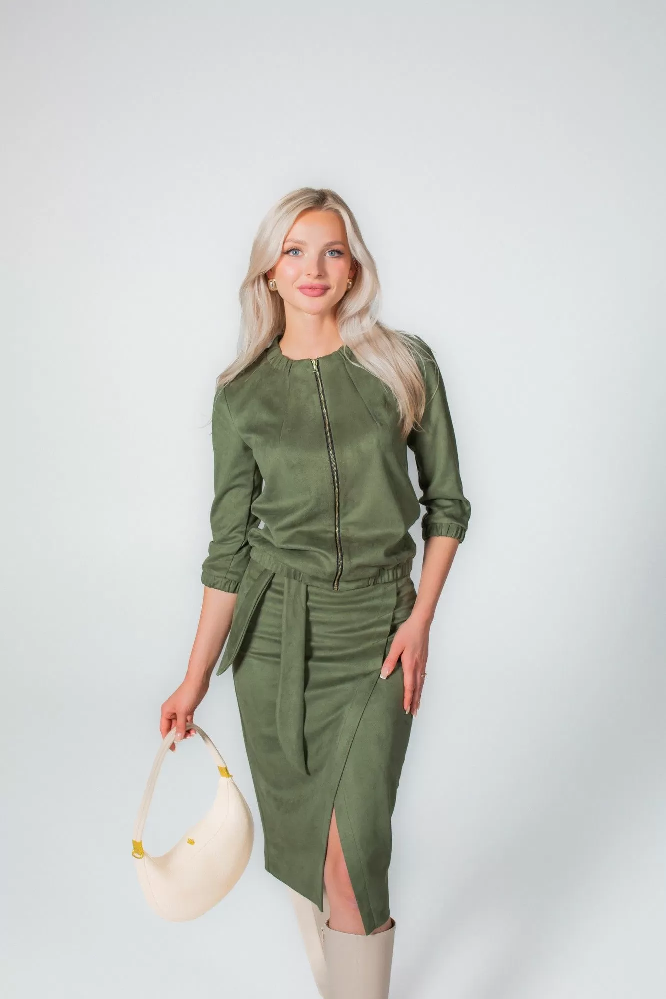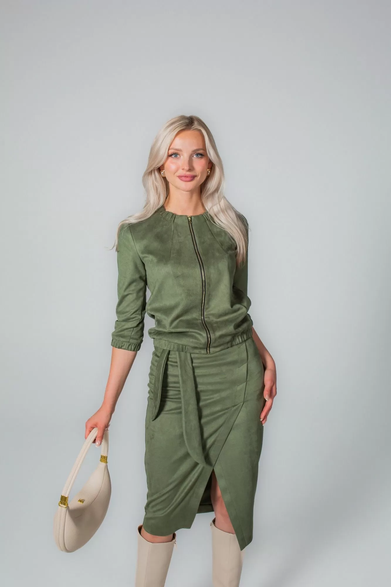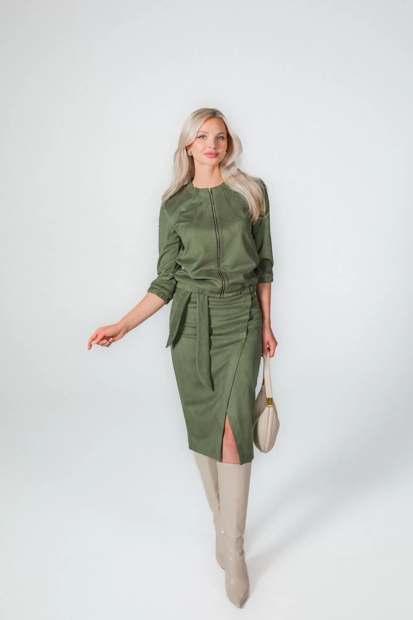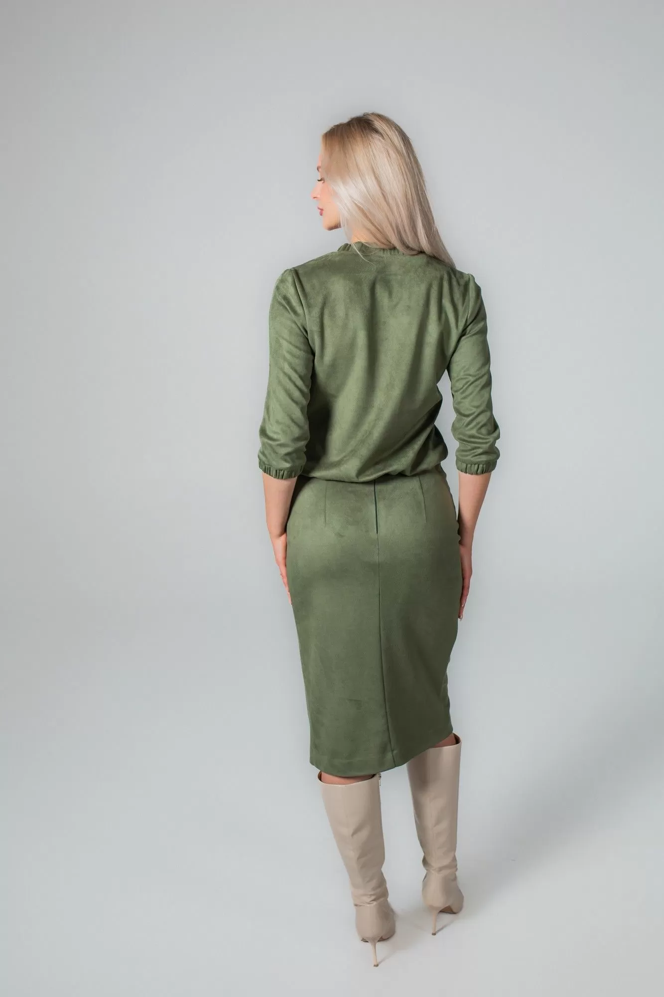 Комплект, состоящий из жакета на молнии и юбки. Выполнен из непрозрачной высококачественной замши на трикотажной основе. Жакет прямого силуэта, по низу манжета с резинкой, по горловине в бейку также втянута резинка. Без подкладки, карманов и воротника. Перед с нагрудными вытачками. Рукав втачной одношовный с манжетой на резинке. Юбка-карандаш длиной чуть ниже колена, без подкладки. По переду имитация запаха. По спинке в среднем шве застежка на потайную молнию. В боковые швы вставлен завязывающийся пояс.