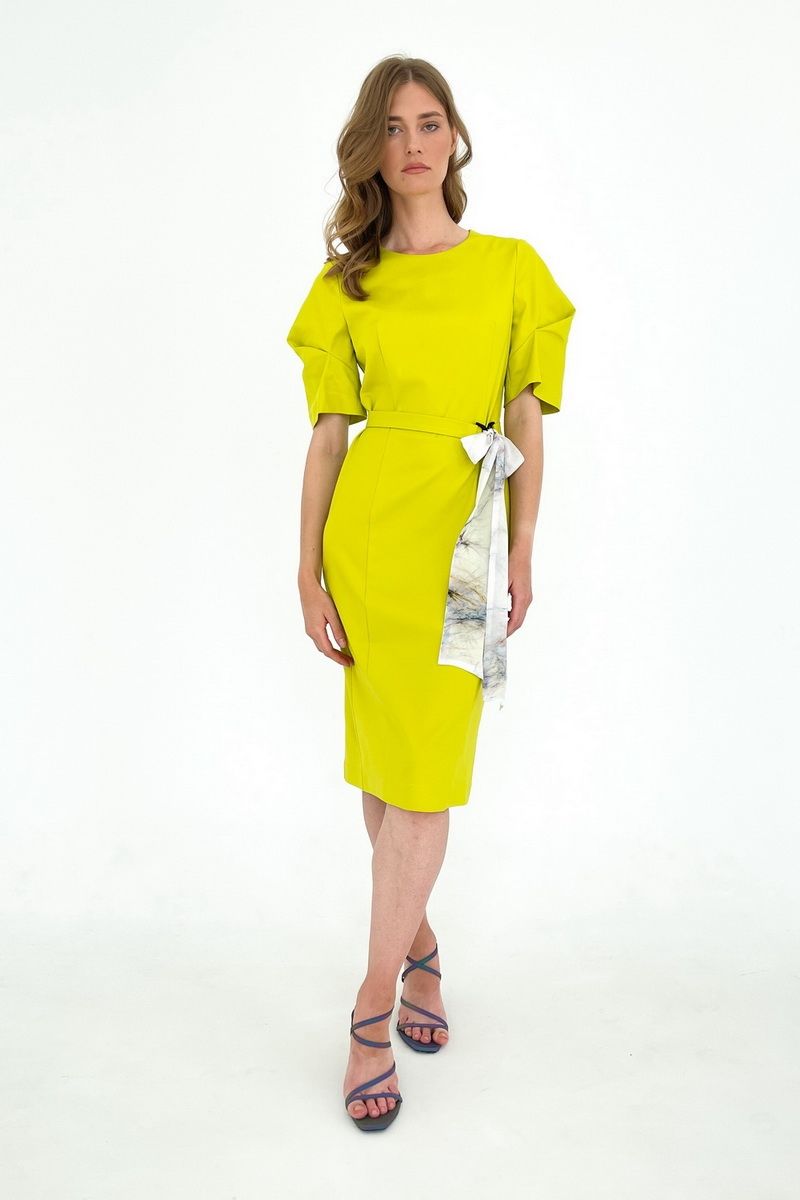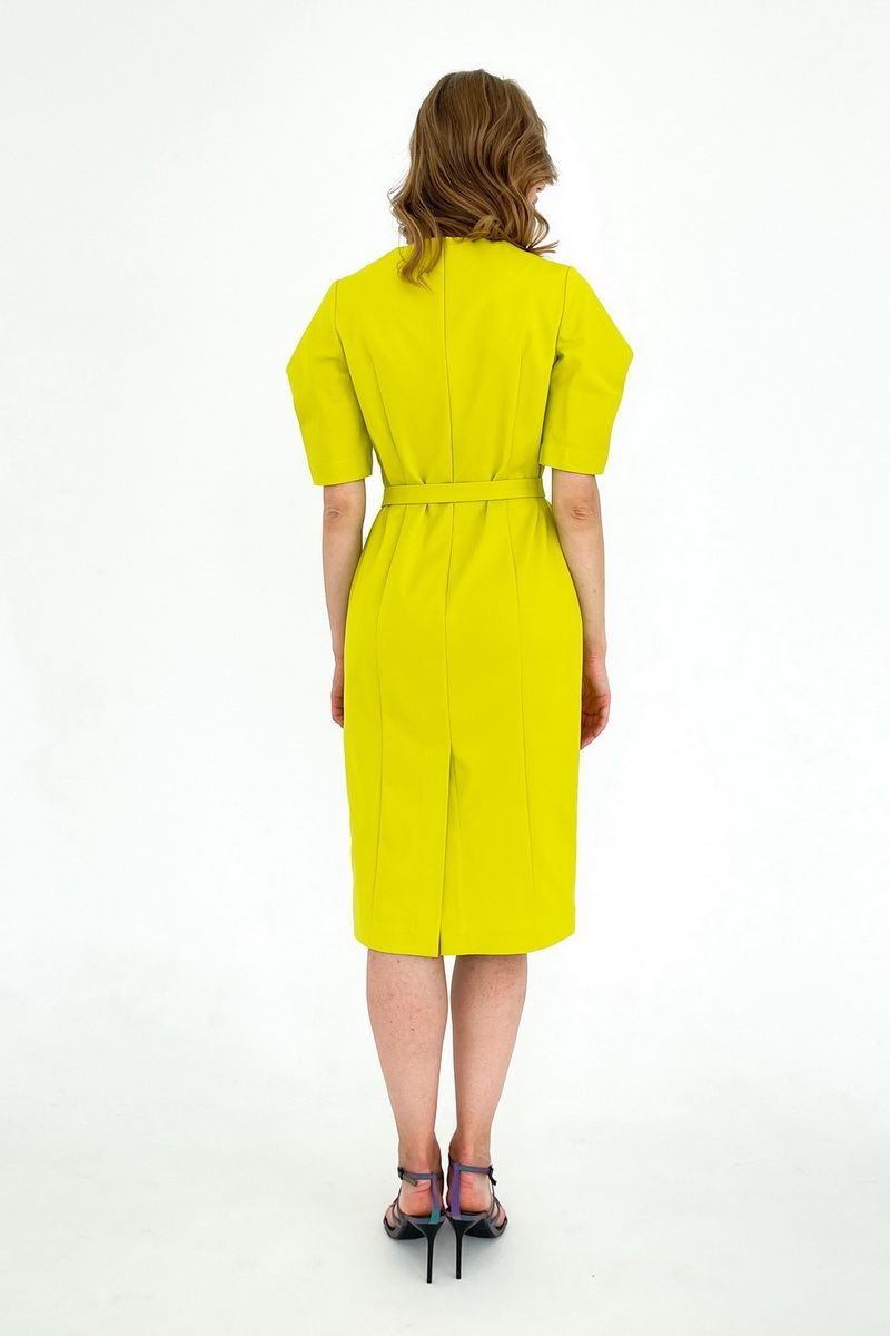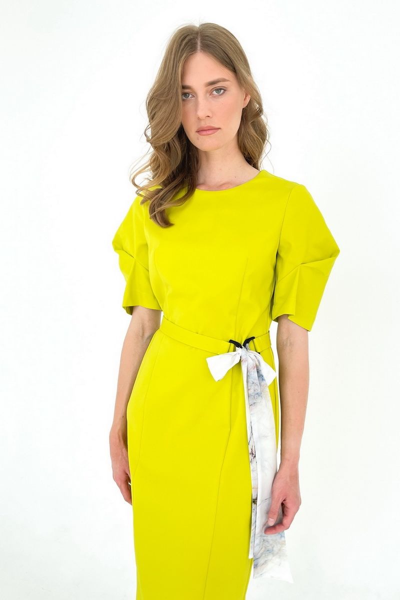 Платье нарядное из однотонного стрейчевого хлопка. Платье прямого силуэта, приталенное, длиной ниже колена. По спинке средний шов с молнией,снизу разрез-шлица. По переду и спинке вертикальные полурельефы,в боковых швах карманы. Рукав короткий с фантазийной складкой по переду. Горловина круглая,обработана обтачкой. Платье без подкладки. Длина по спинке - р.36 106 см, р.38 106 см, р 40 106 см, р. 42 106 см, р. 44 106 см. р 46 106 см.Длина Рукава - р.36 33см, р.38 33см, р.40 33см, р 42 33см, р 44 33см, р.46 33см