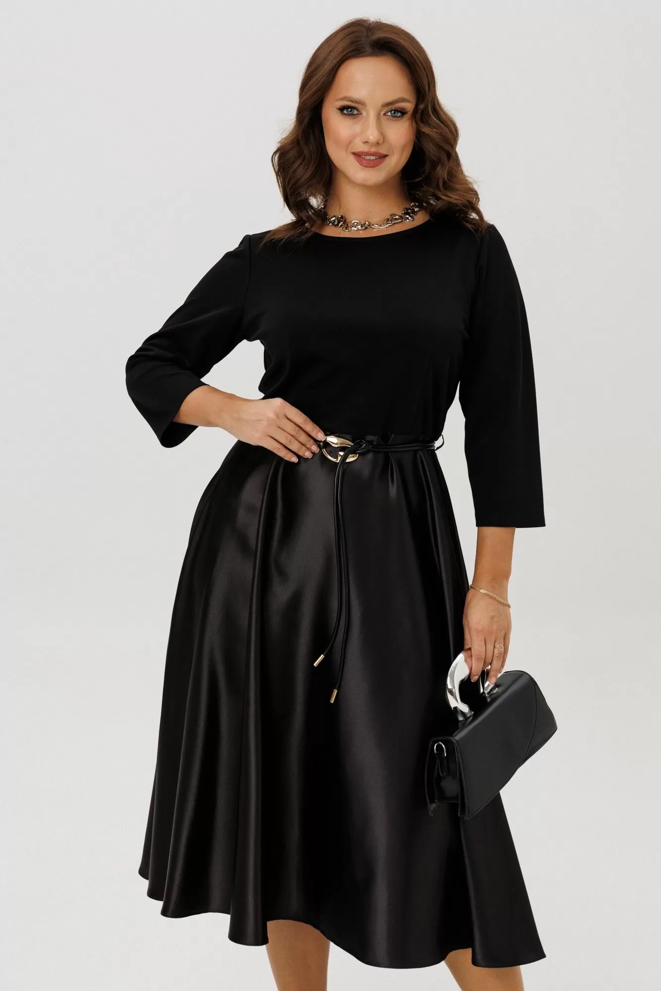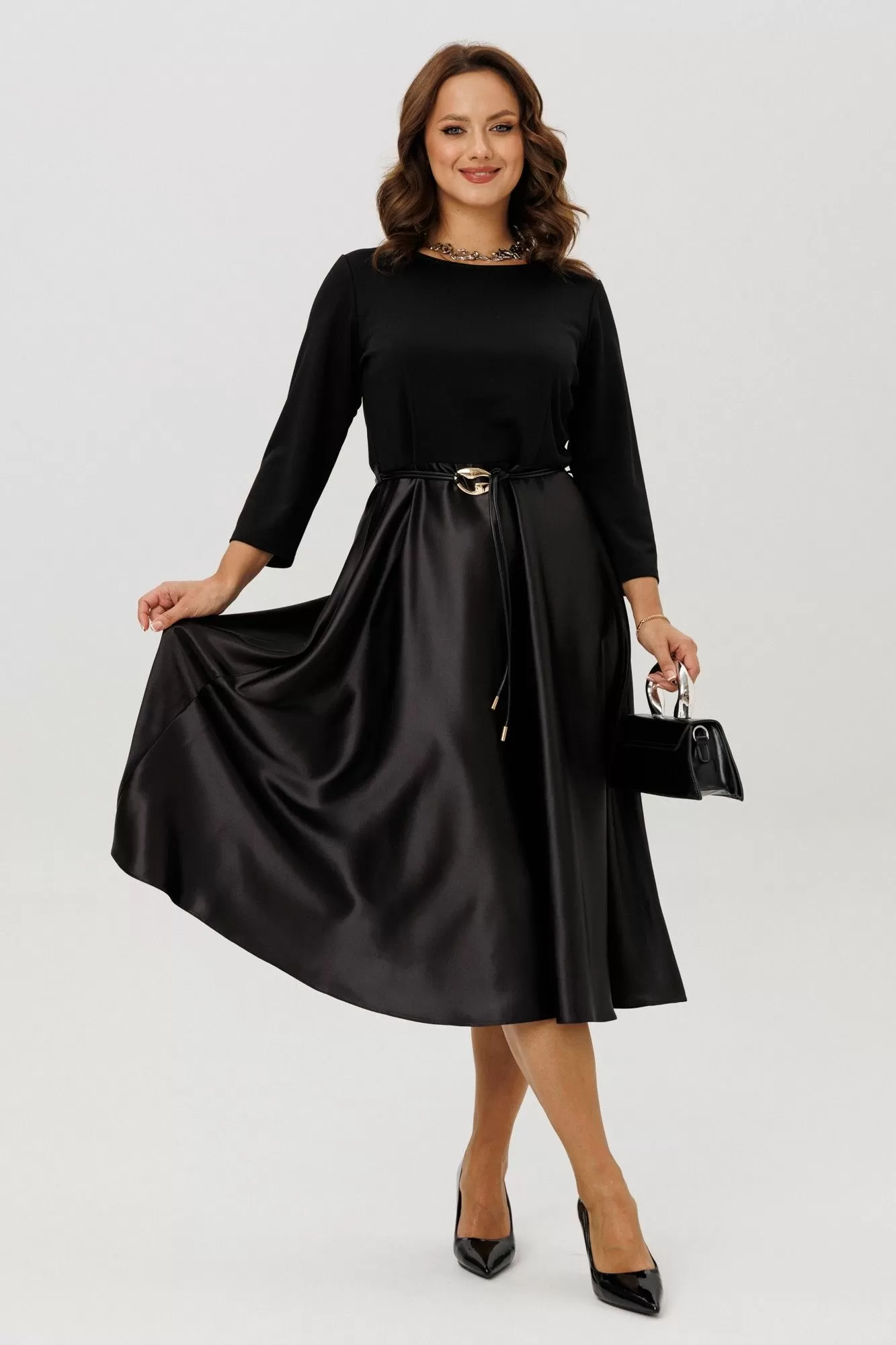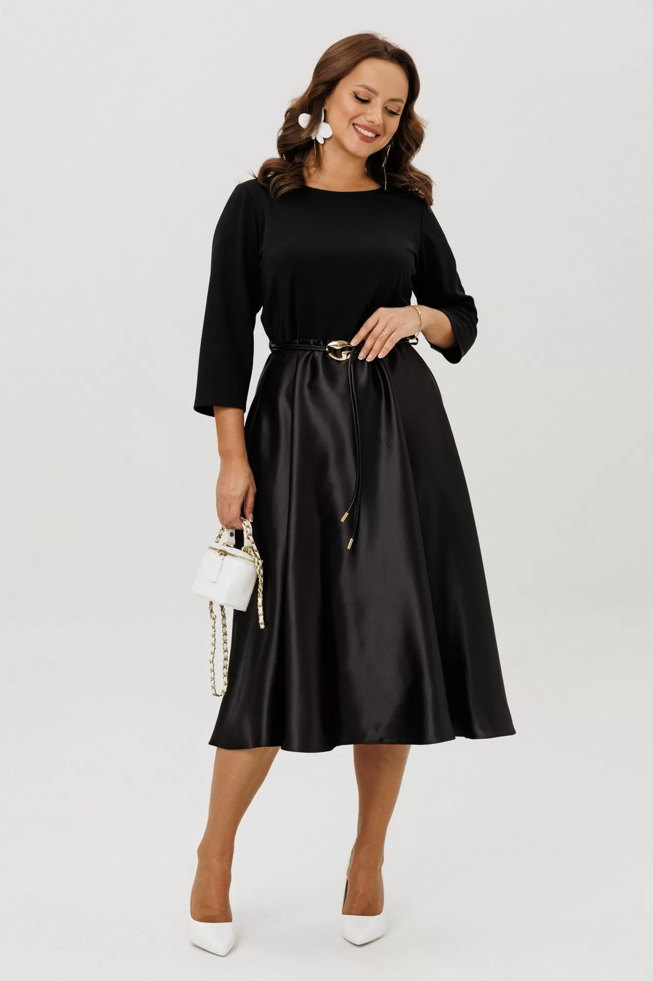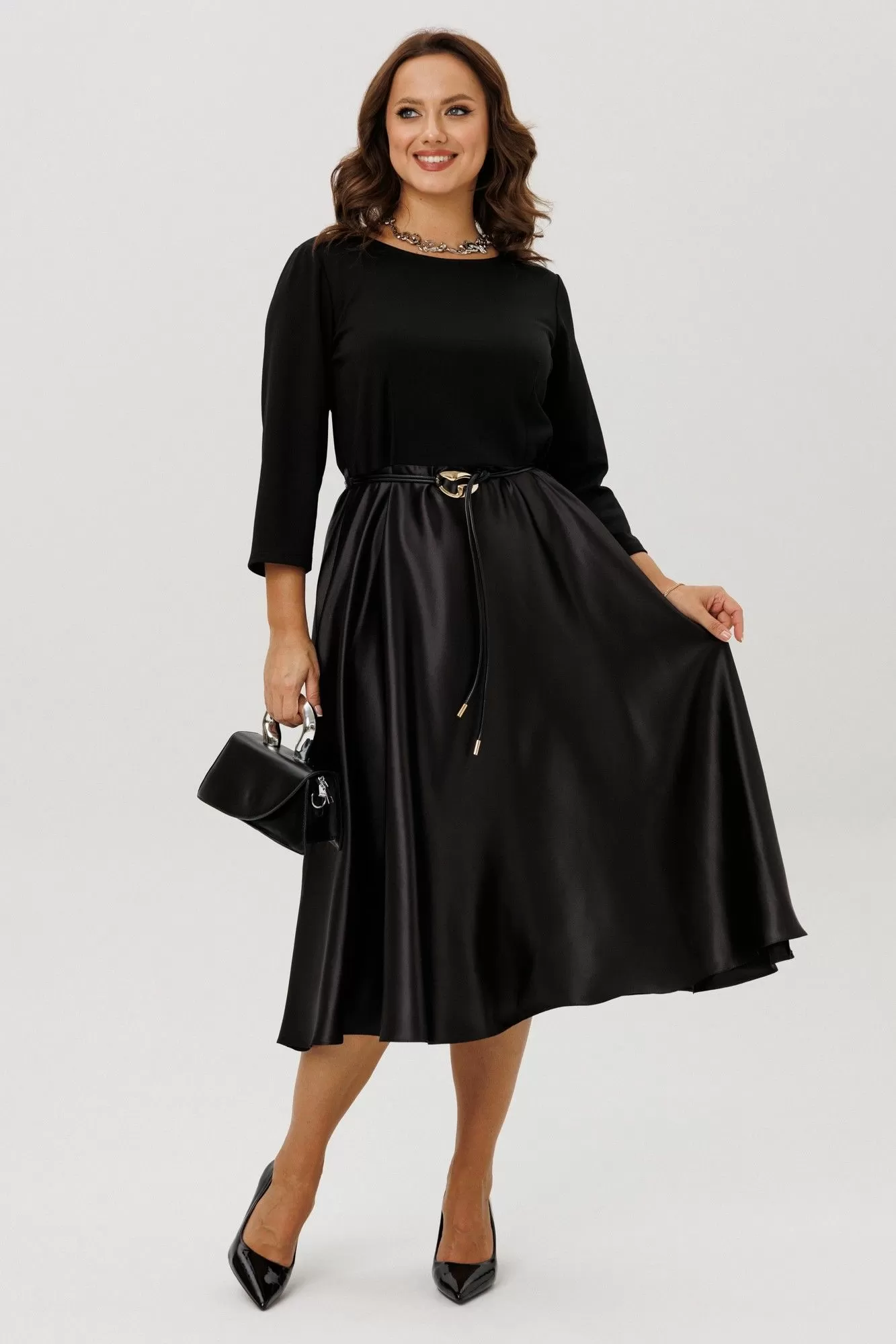 Нарядное женское платье отрезное по линии талии. Верхняя часть выполнена из трикотажного полотна (тянется), нижняя часть из плательного шелка «Армани» (немного тянется). По лифу переда – талиевые вытачки. По лифу спинки средний шов. Горловина округлой формы, обработана окантовкой. Рукава втачные, одношовные, по низу обработаны окантовкой. Нижняя часть платья – «полусолнце» по спинке со средним швом. Платье без подкладки и без застежки. В комплекте пояс. (При массовом производстве пояс может отличаться от фото. Если принципиально- уточняйте какой пояс в наличии.)