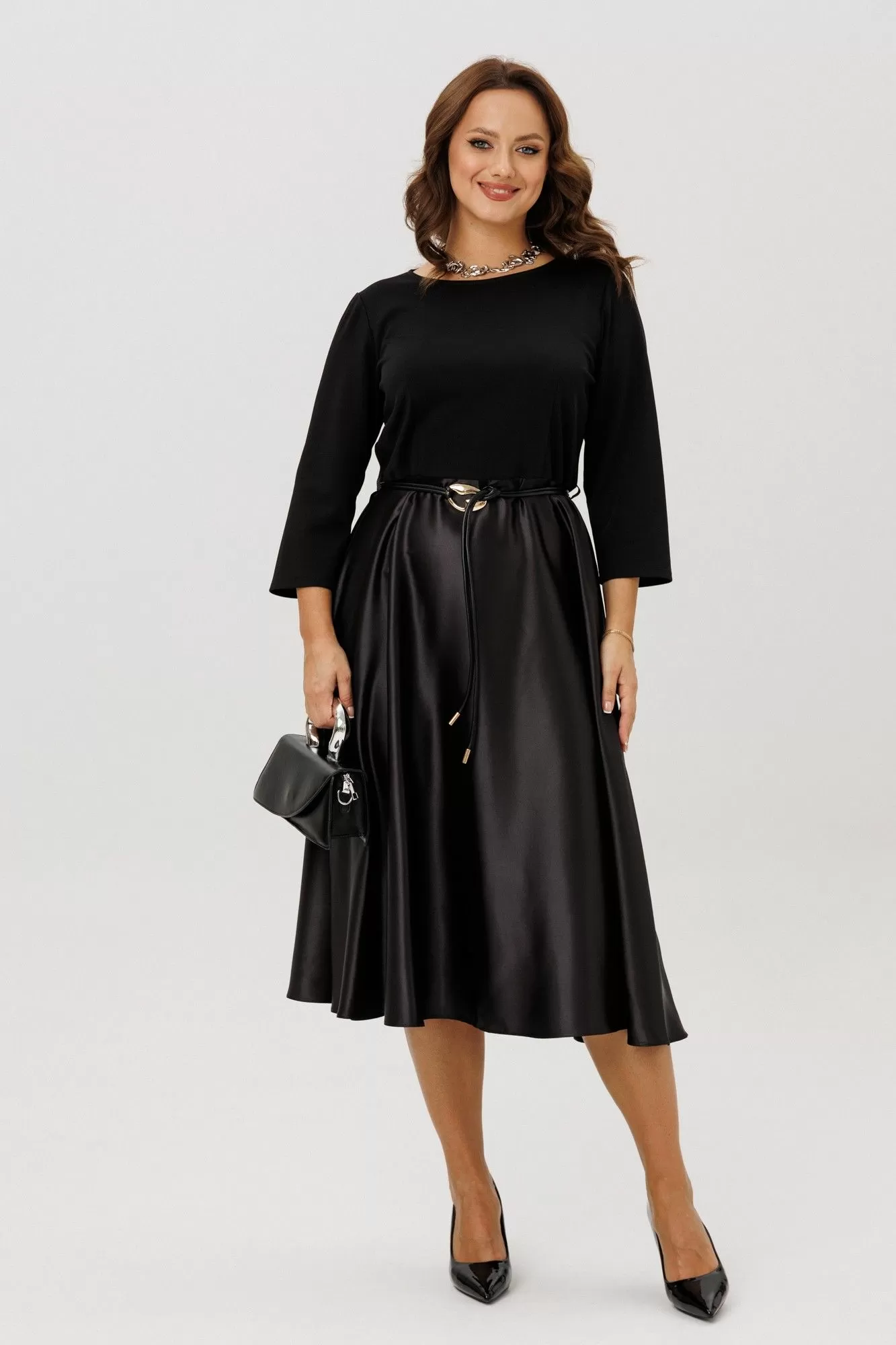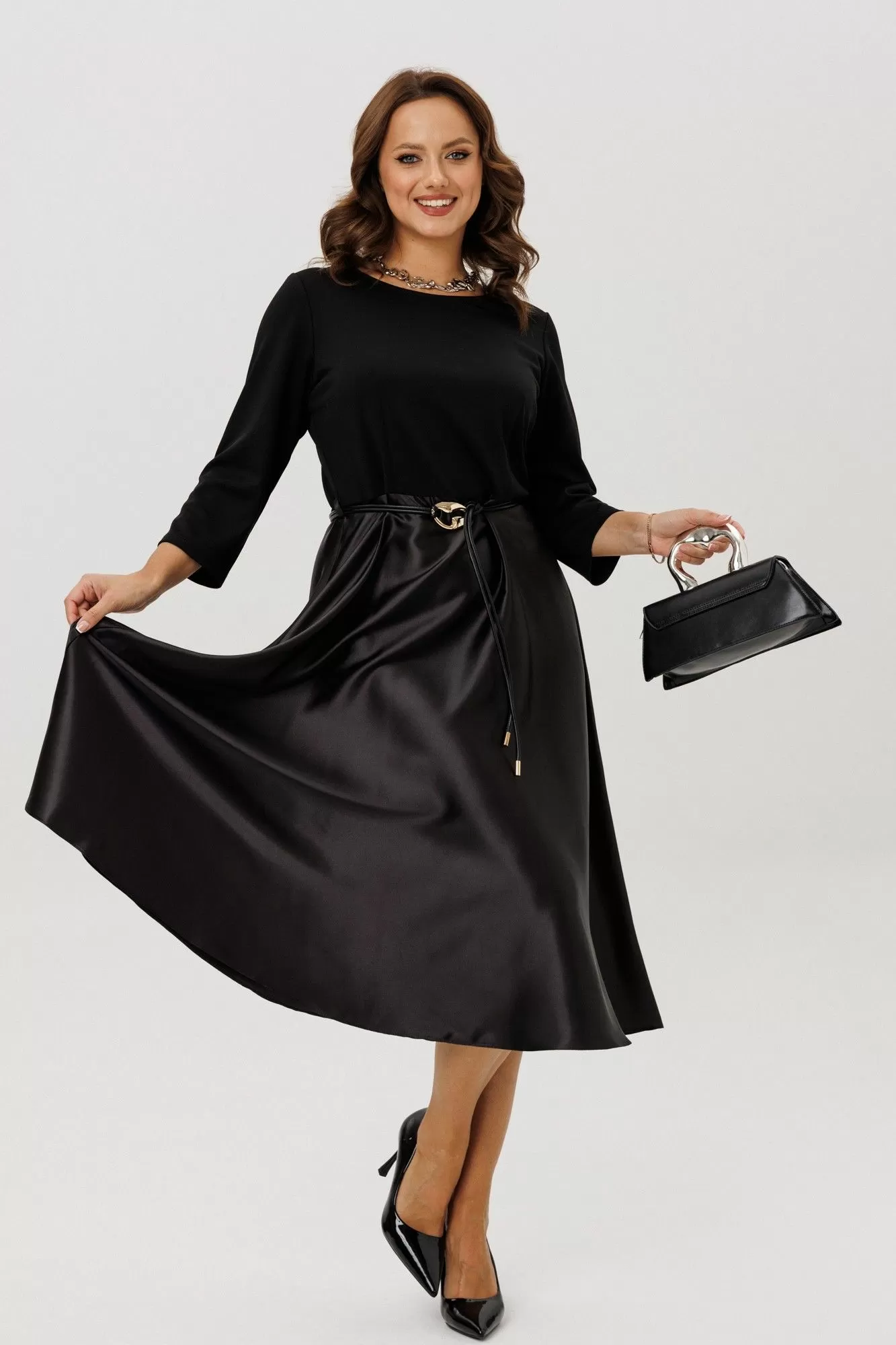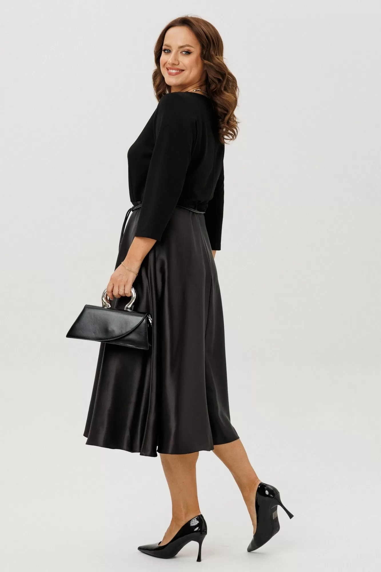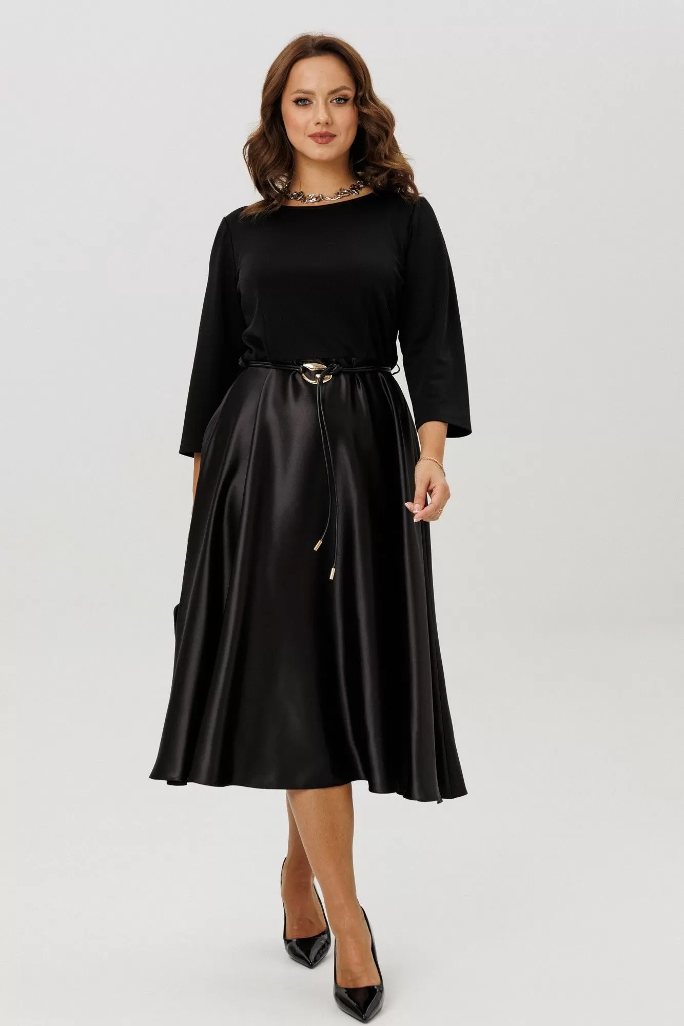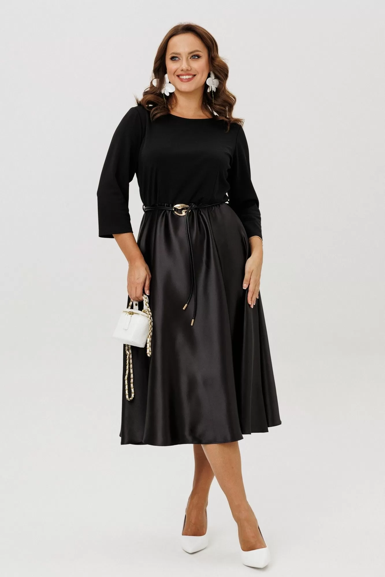 Нарядное женское платье отрезное по линии талии. Верхняя часть выполнена из трикотажного полотна (тянется), нижняя часть из плательного шелка «Армани» (немного тянется). По лифу переда – талиевые вытачки. По лифу спинки средний шов. Горловина округлой формы, обработана окантовкой. Рукава втачные, одношовные, по низу обработаны окантовкой. Нижняя часть платья – «полусолнце» по спинке со средним швом. Платье без подкладки и без застежки. В комплекте пояс. (При массовом производстве пояс может отличаться от фото. Если принципиально- уточняйте какой пояс в наличии.)