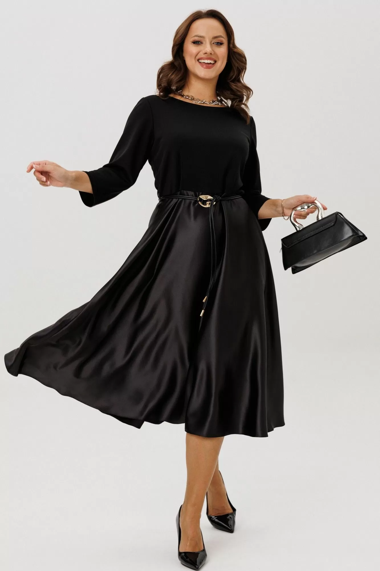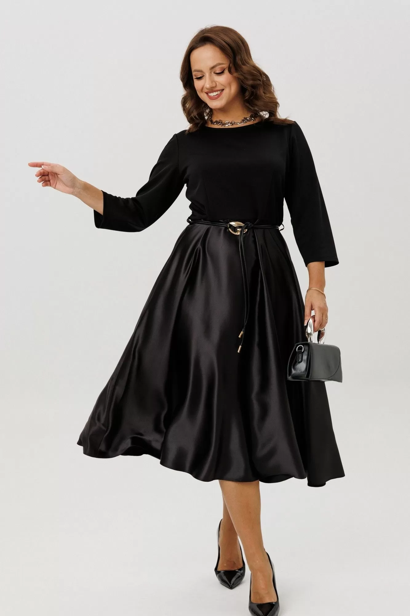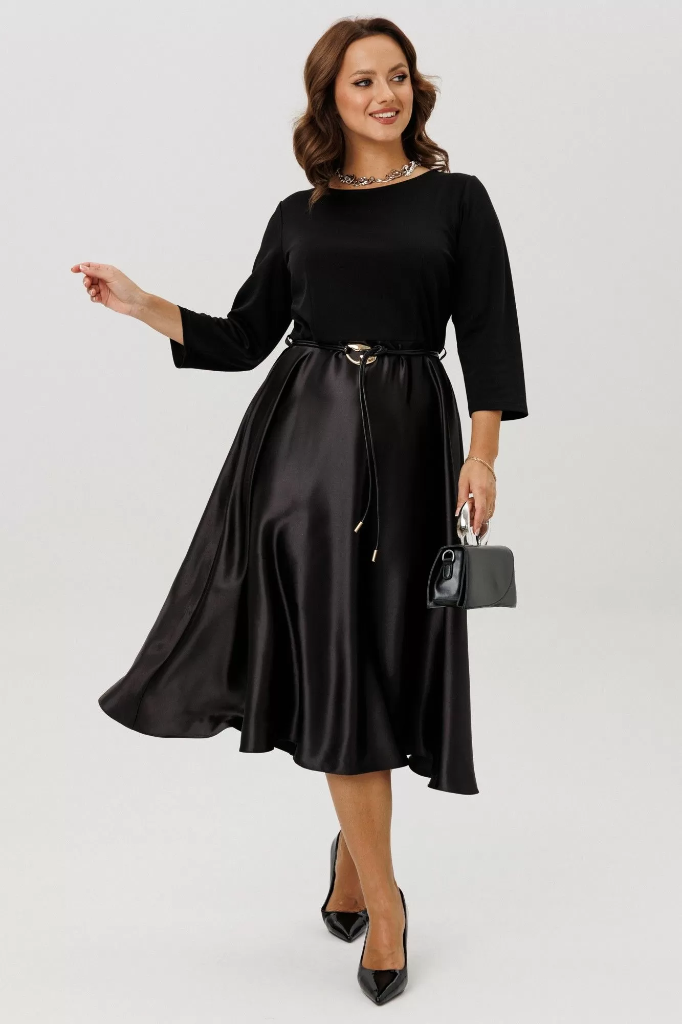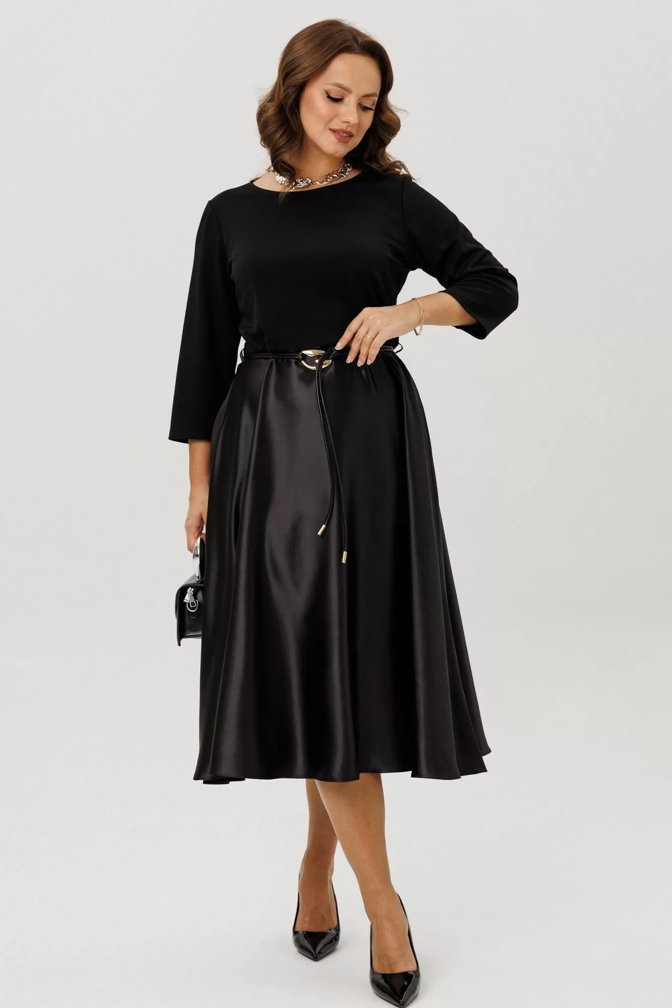 Нарядное женское платье отрезное по линии талии. Верхняя часть выполнена из трикотажного полотна (тянется), нижняя часть из плательного шелка «Армани» (немного тянется). По лифу переда – талиевые вытачки. По лифу спинки средний шов. Горловина округлой формы, обработана окантовкой. Рукава втачные, одношовные, по низу обработаны окантовкой. Нижняя часть платья – «полусолнце» по спинке со средним швом. Платье без подкладки и без застежки. В комплекте пояс. (При массовом производстве пояс может отличаться от фото. Если принципиально- уточняйте какой пояс в наличии.)