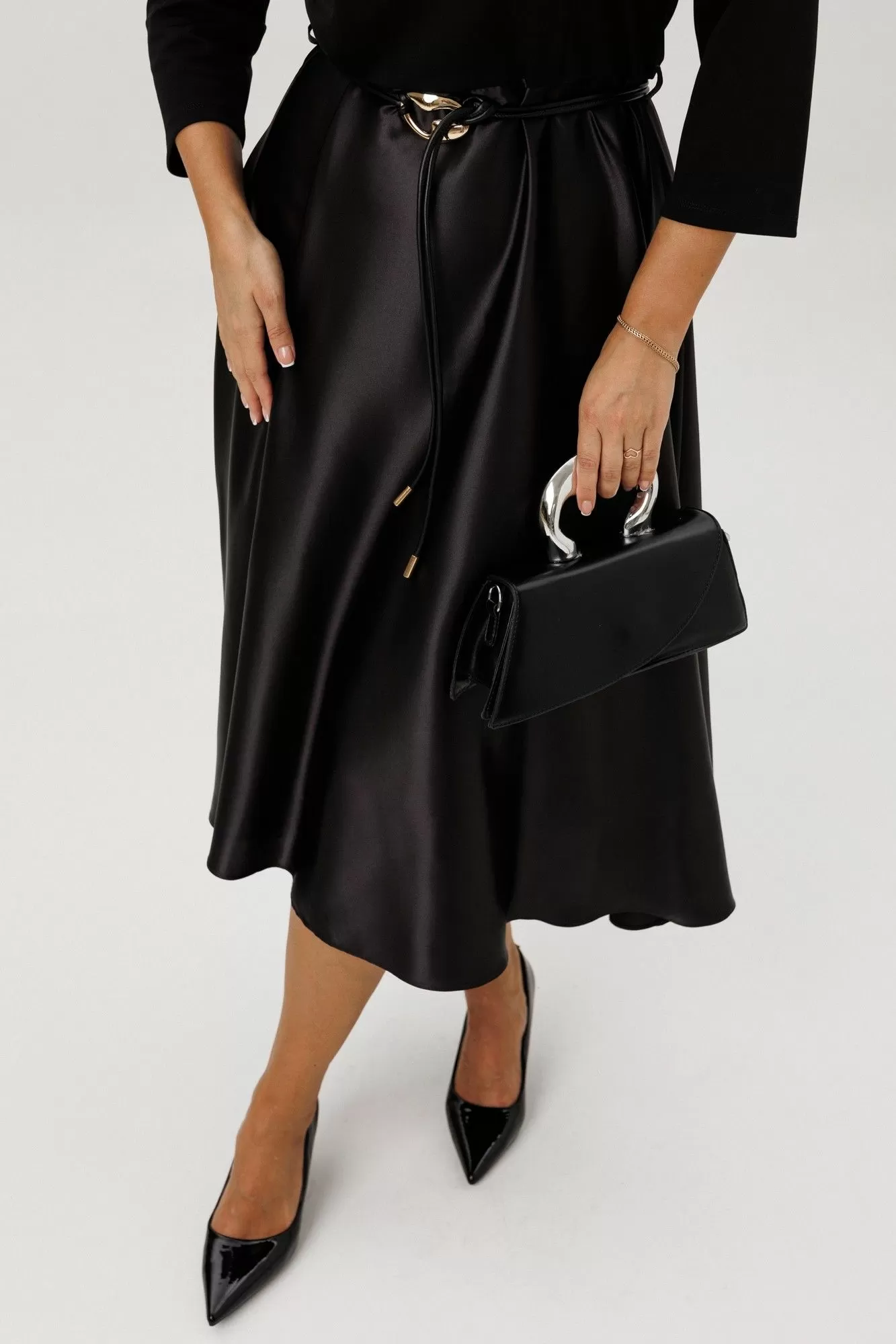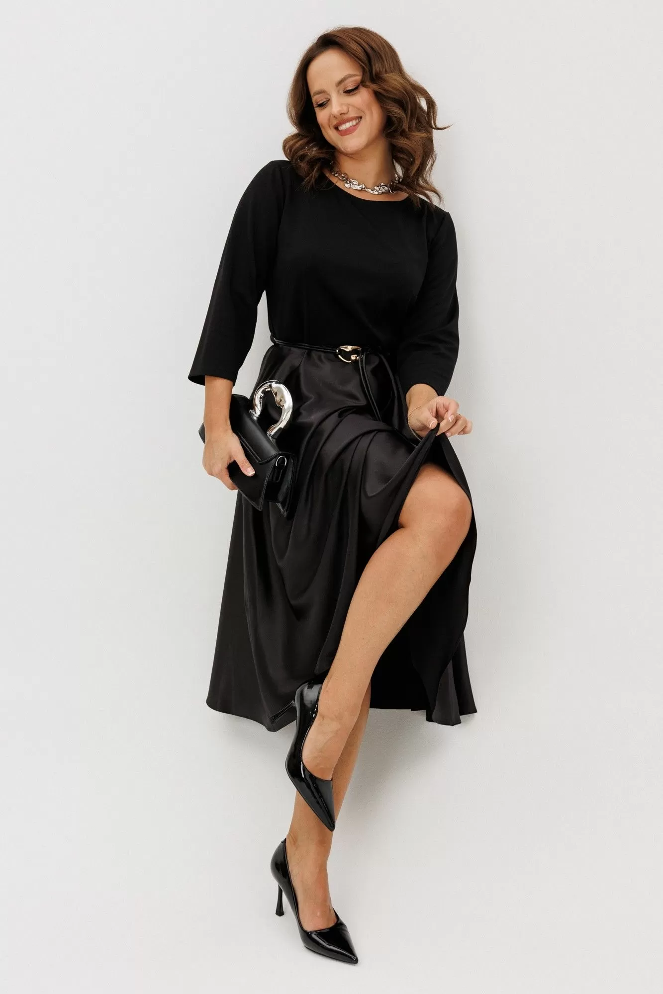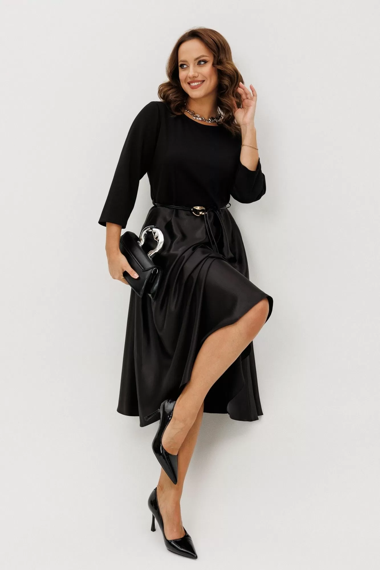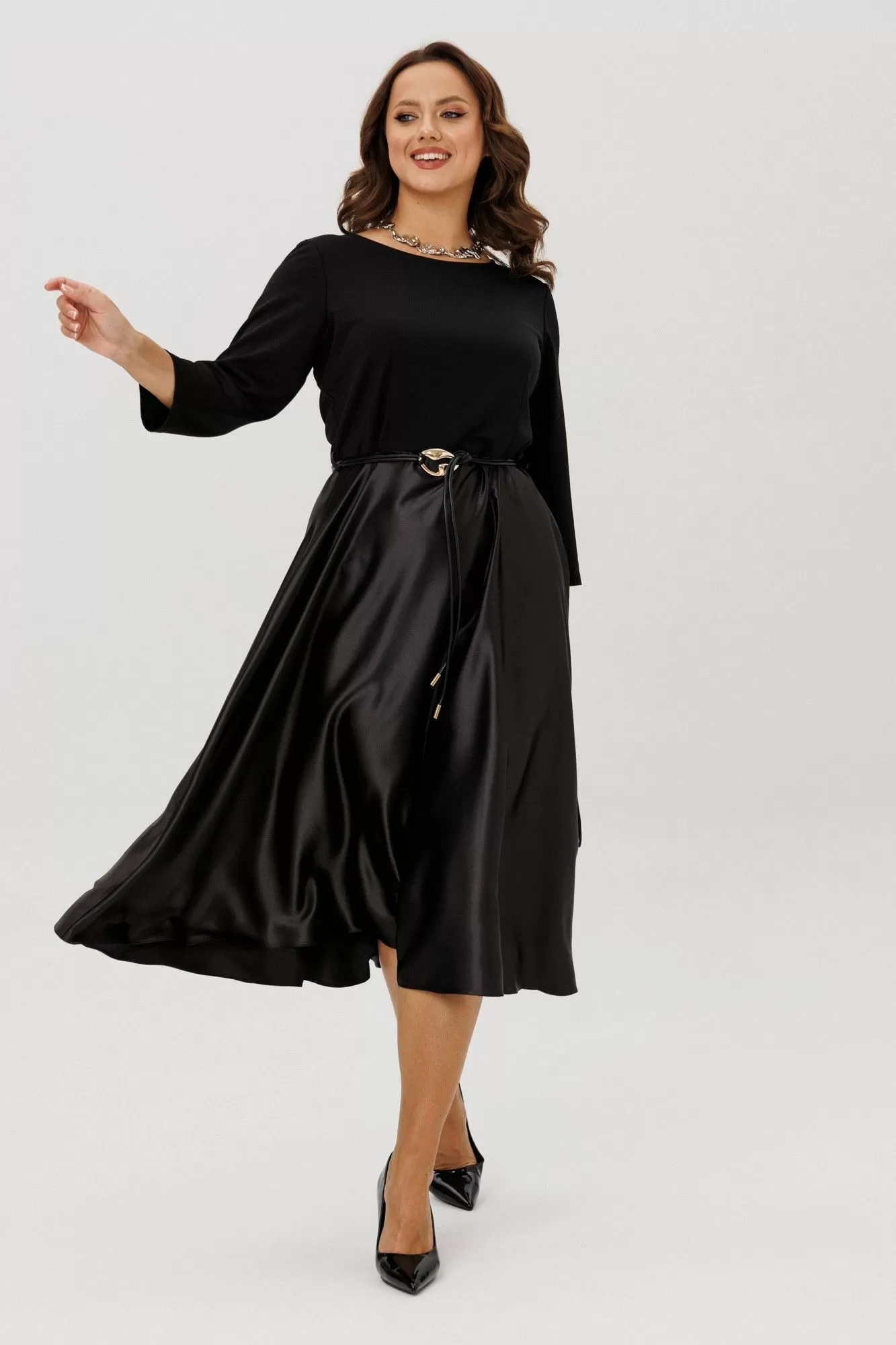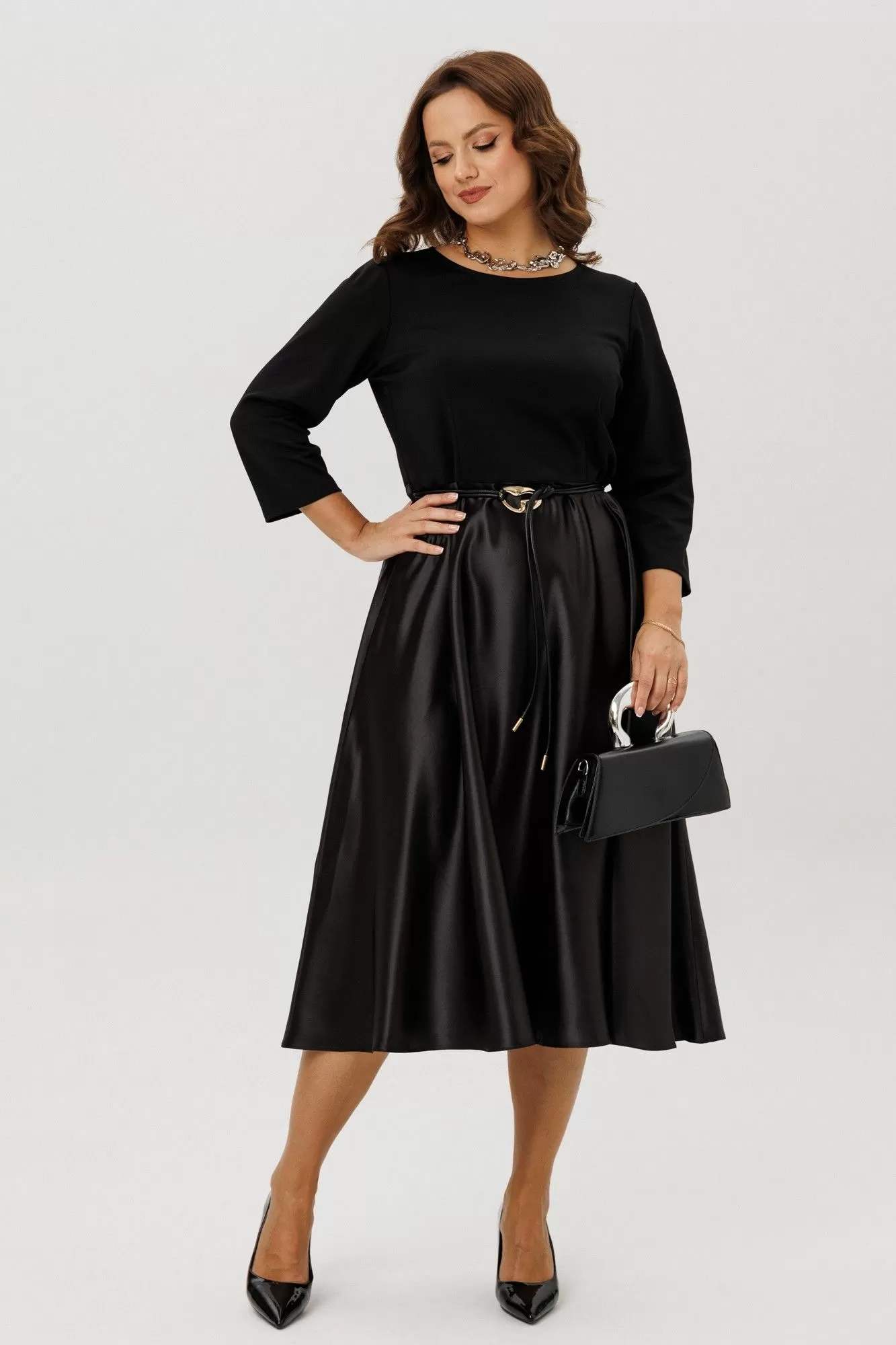 Нарядное женское платье отрезное по линии талии. Верхняя часть выполнена из трикотажного полотна (тянется), нижняя часть из плательного шелка «Армани» (немного тянется). По лифу переда – талиевые вытачки. По лифу спинки средний шов. Горловина округлой формы, обработана окантовкой. Рукава втачные, одношовные, по низу обработаны окантовкой. Нижняя часть платья – «полусолнце» по спинке со средним швом. Платье без подкладки и без застежки. В комплекте пояс. (При массовом производстве пояс может отличаться от фото. Если принципиально- уточняйте какой пояс в наличии.)