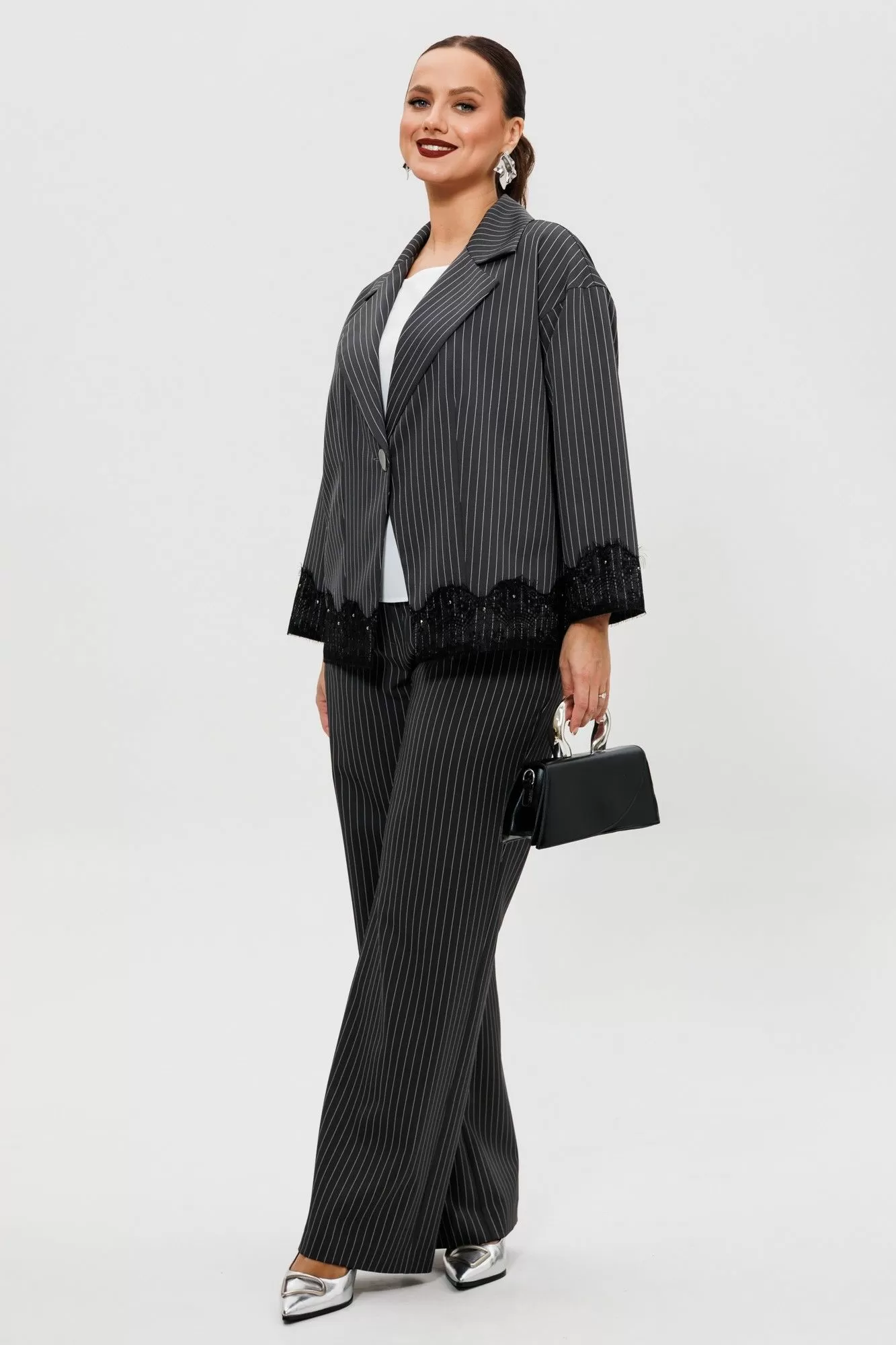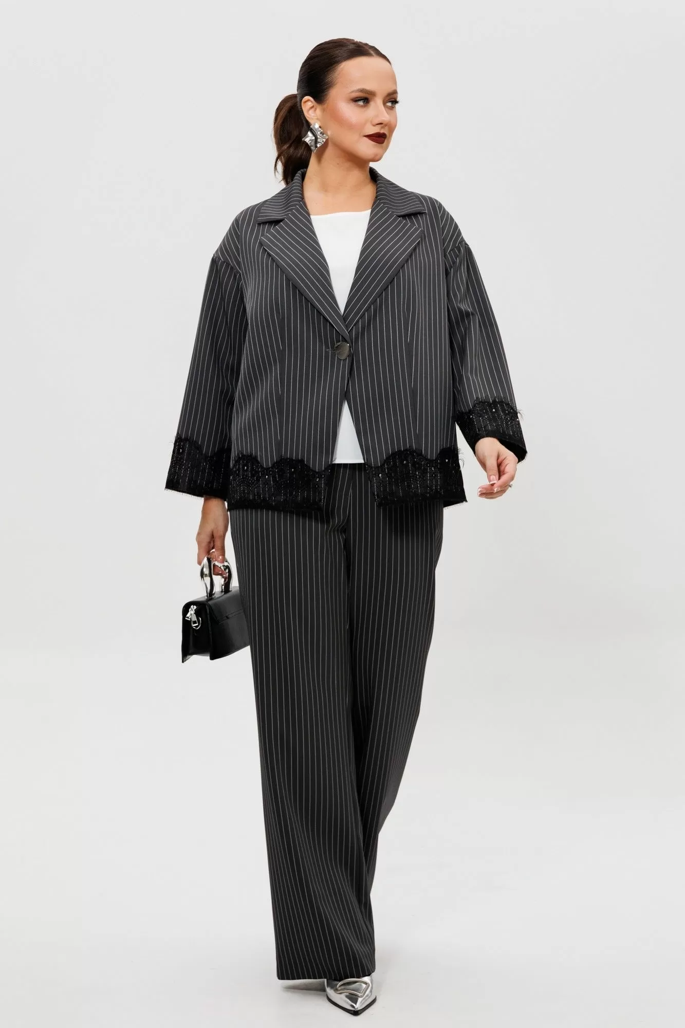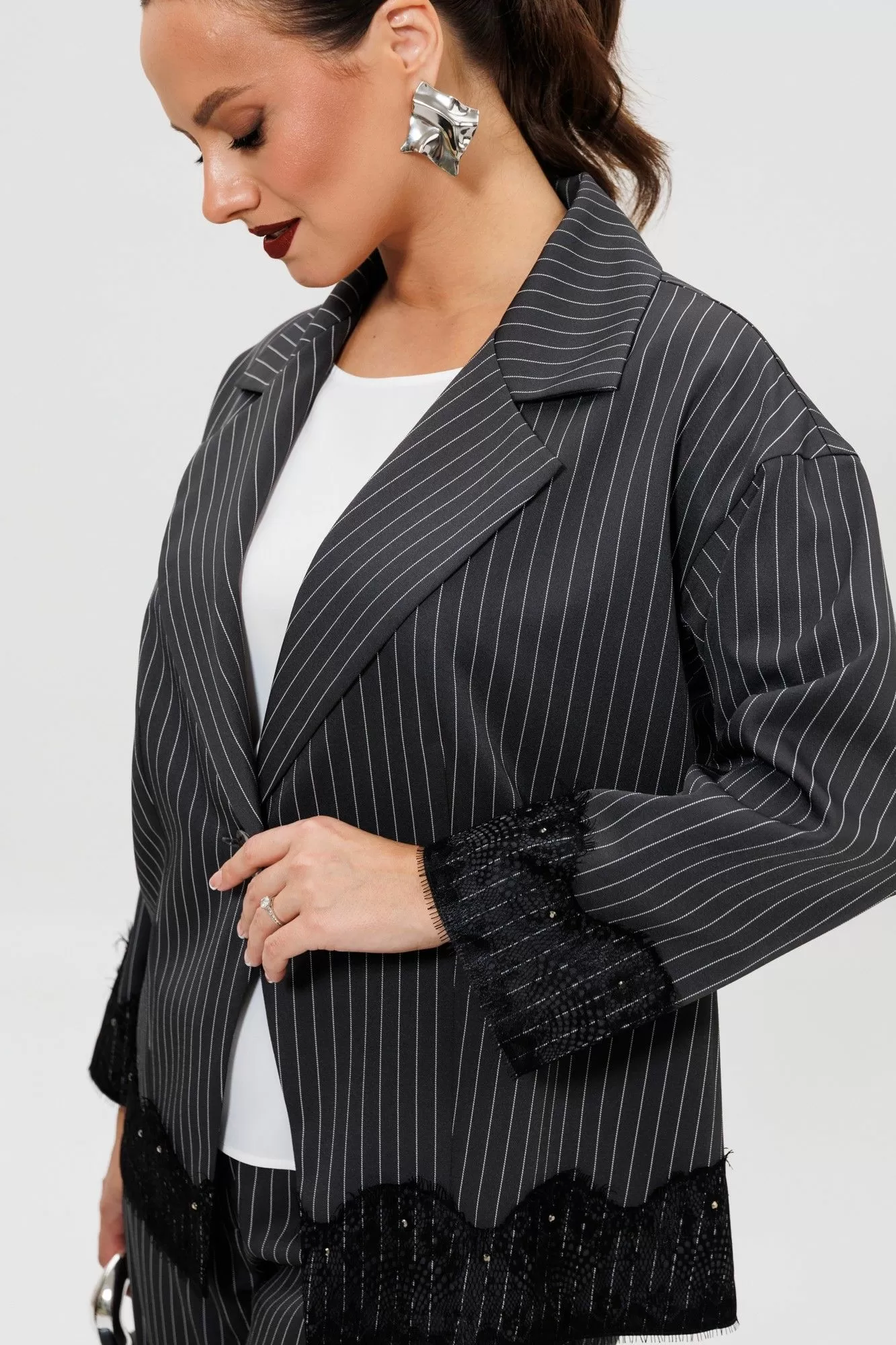 Жакет прямого силуэта со спущенной линией плеча, выполнен из костюмной ткани в тонкую полоску (чуть тянется). По переду нагрудная вытачка, центральная застежка на одну петлю и пуговицу. Горловина оформлена воротником пиджачного типа с лацканом. Спинка со средним швом. Рукава одношовные, длиной 7/8. Жакет без подкладки. Жакет декорирован по низу и по низу рукавов французским кружевом со стразами.