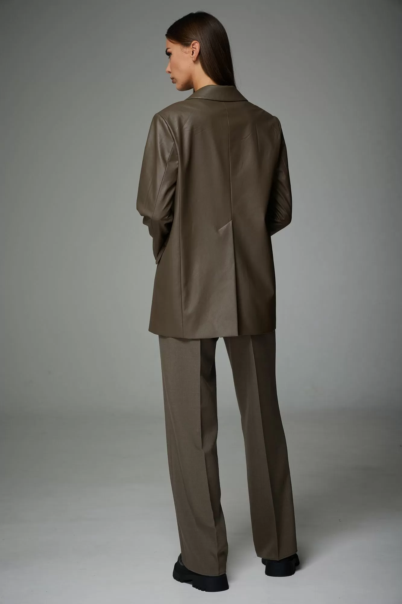 Комплект, состоящий из жакета и брюк, втачного покроя, свободного силуэта. Выполнен из двух видов ткани.