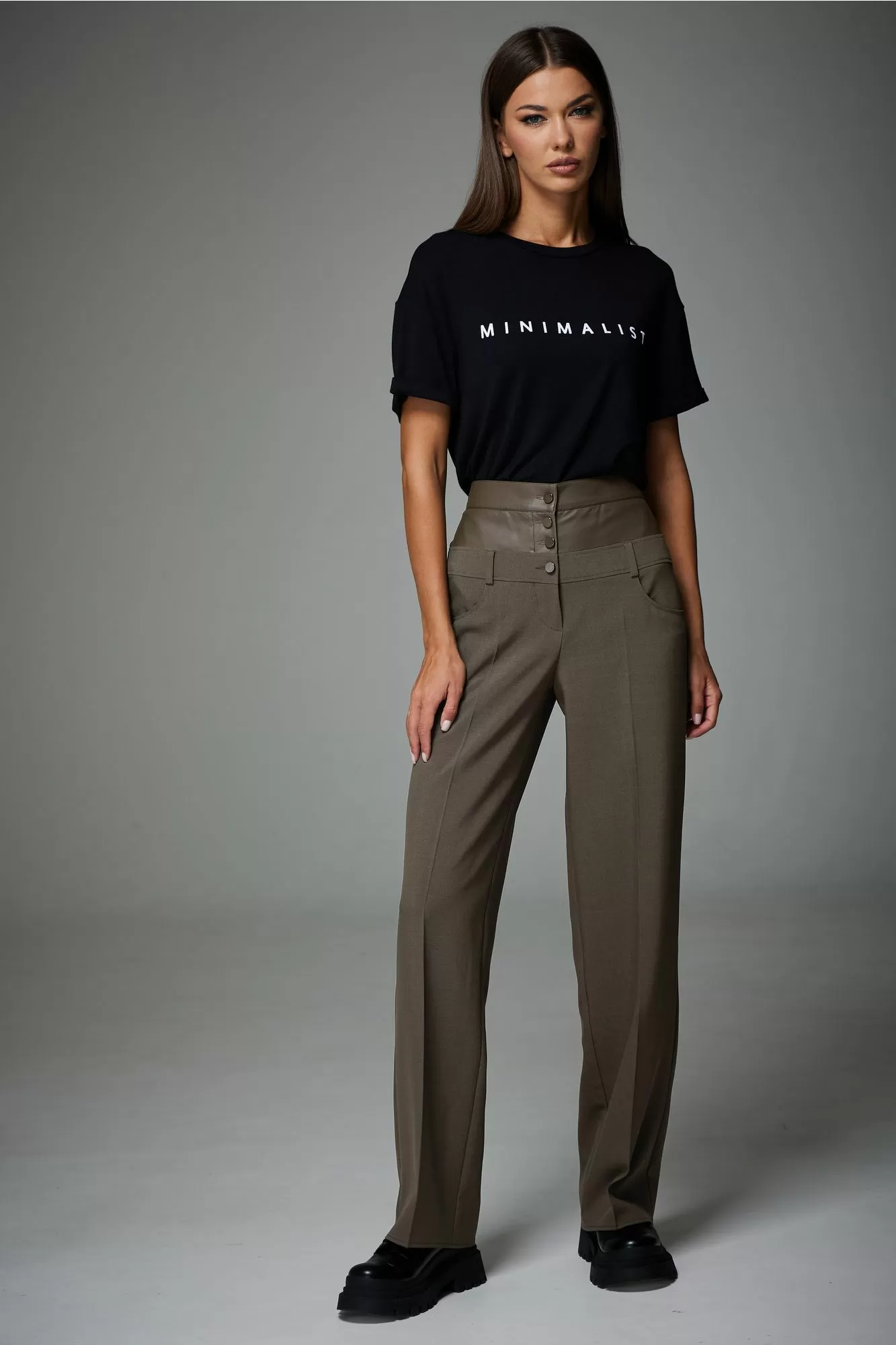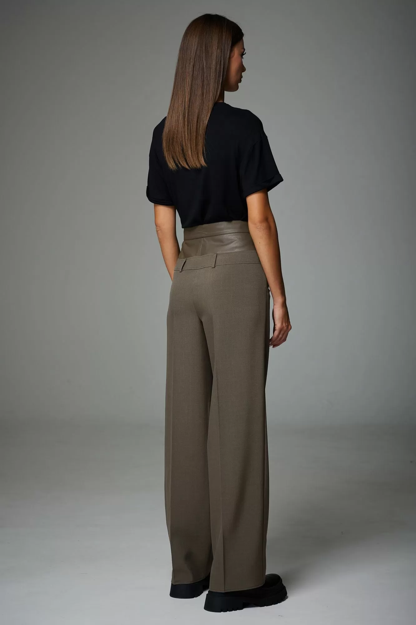 Брюки комбинированные из двух видов тканей, прямой формы, в области талии и бедер облегающие. В брюках заутюжены стрелки. Кокетка передней и задней половинки выполнены в тон основной ткани, пояс выполнен из экокожи. На передних половинках выполнены застежка на петли и пуговицы на гульфик. Нижний пояс в брюках выполнен из основной ткани, на поясе расположены шлевки. В боковых швах расположены карманы закругленной формы.