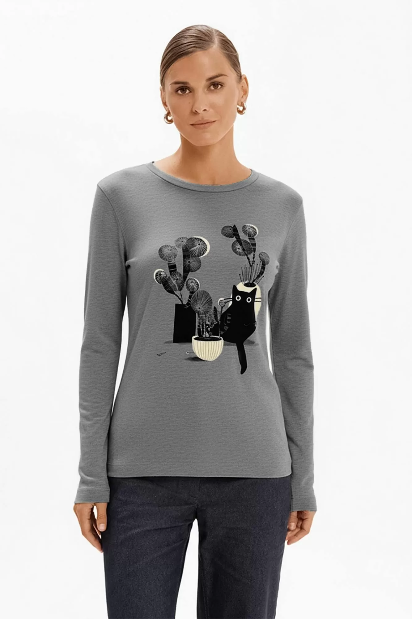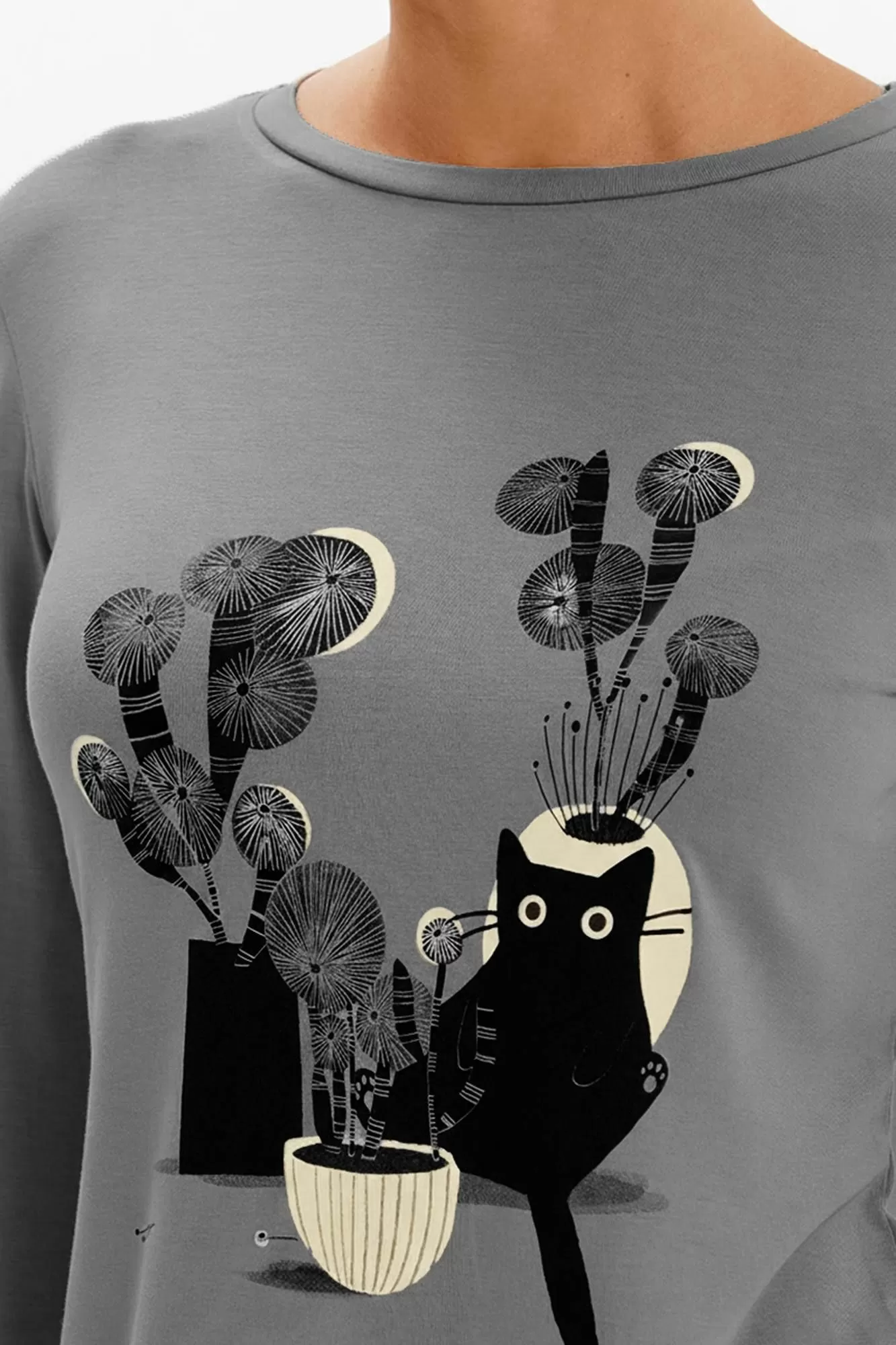 Универсальный серый лонгслив с графичным принтом — это must-have для тех, кто ценит лаконичность с изюминкой. Спокойный серый цвет служит элегантным фоном для очаровательного кота и ботанических элементов, делая образ одновременно сдержанным и выразительным. Прямой силуэт легко вписывается в любой гардероб, становясь основой для множества стильных комбинаций. Наденьте его под пиджак для создания умного кэжуал-образа или сочетайте с объёмной курткой и джинсами для прогулки. Эта модель — прекрасный способ добавить в свой стиль лёгкую, ненавязчивую историю, полную уюта и charm. С любовью и заботой о Вас, команда брендов NELVA и FRIDAY by NELVA!