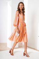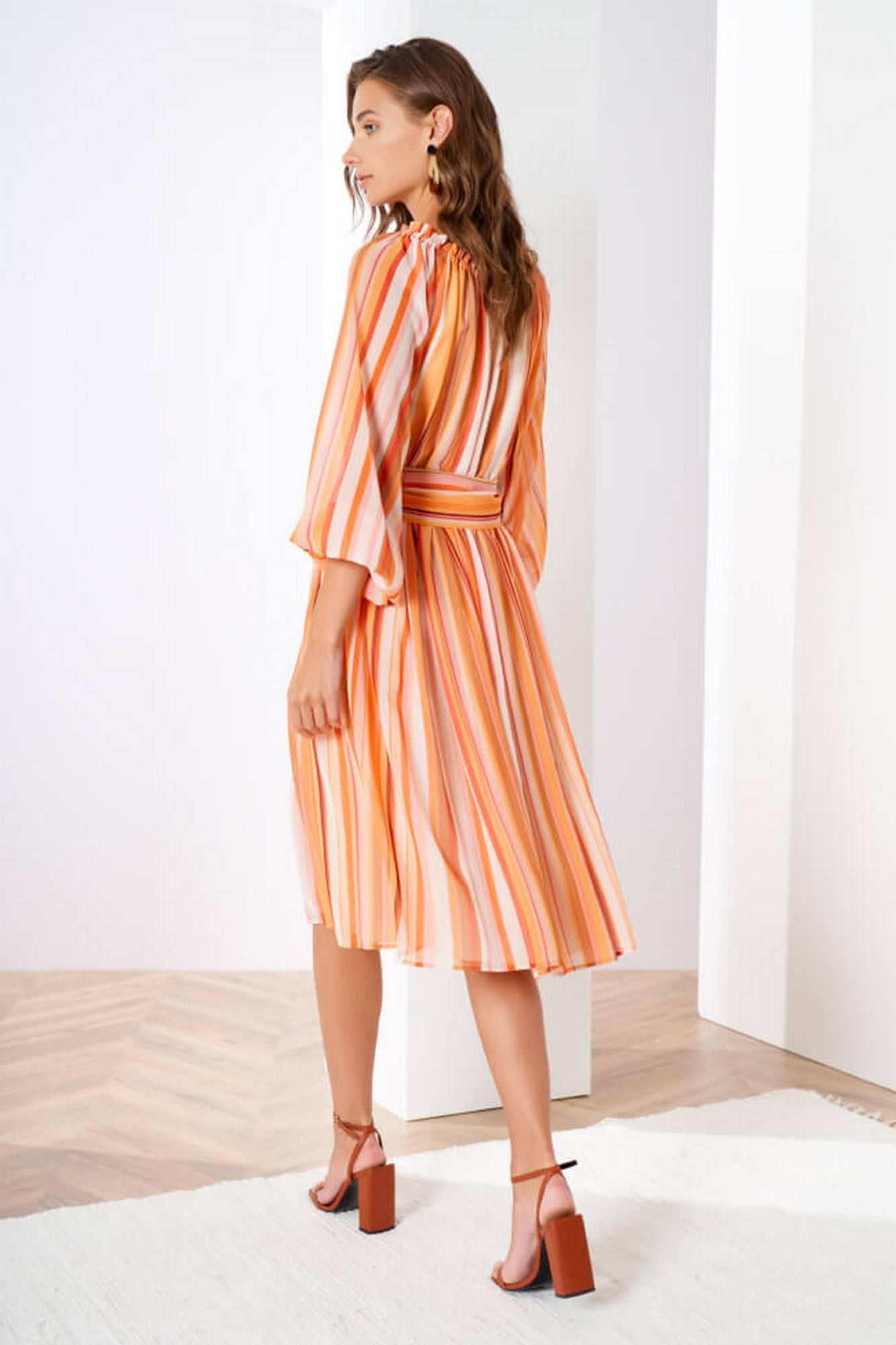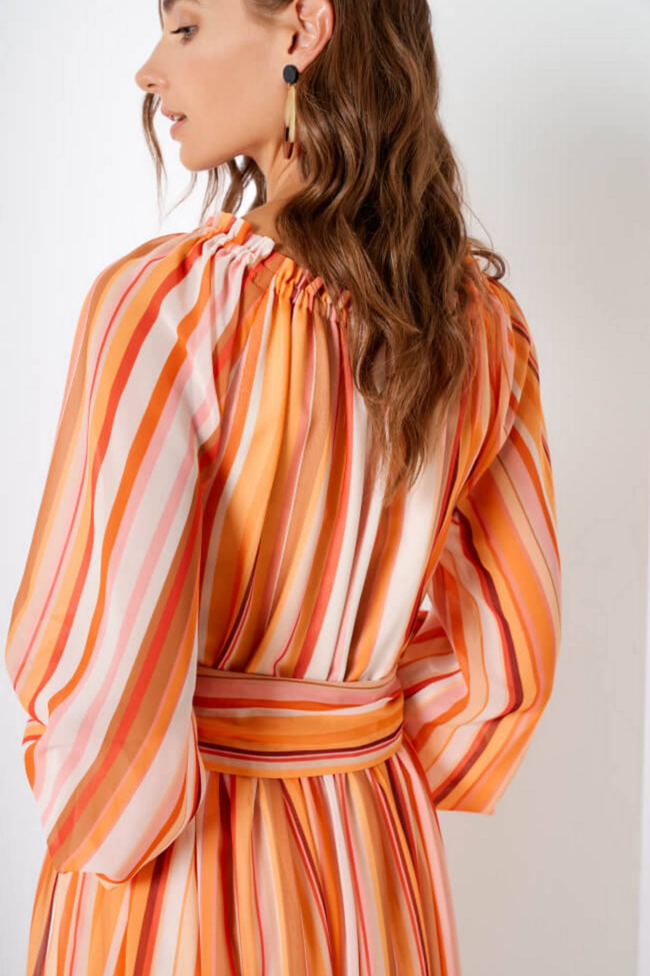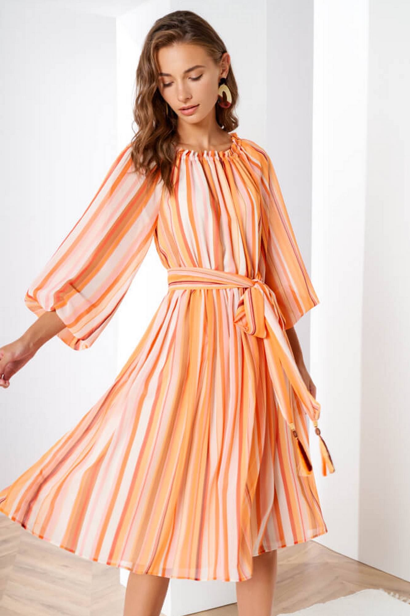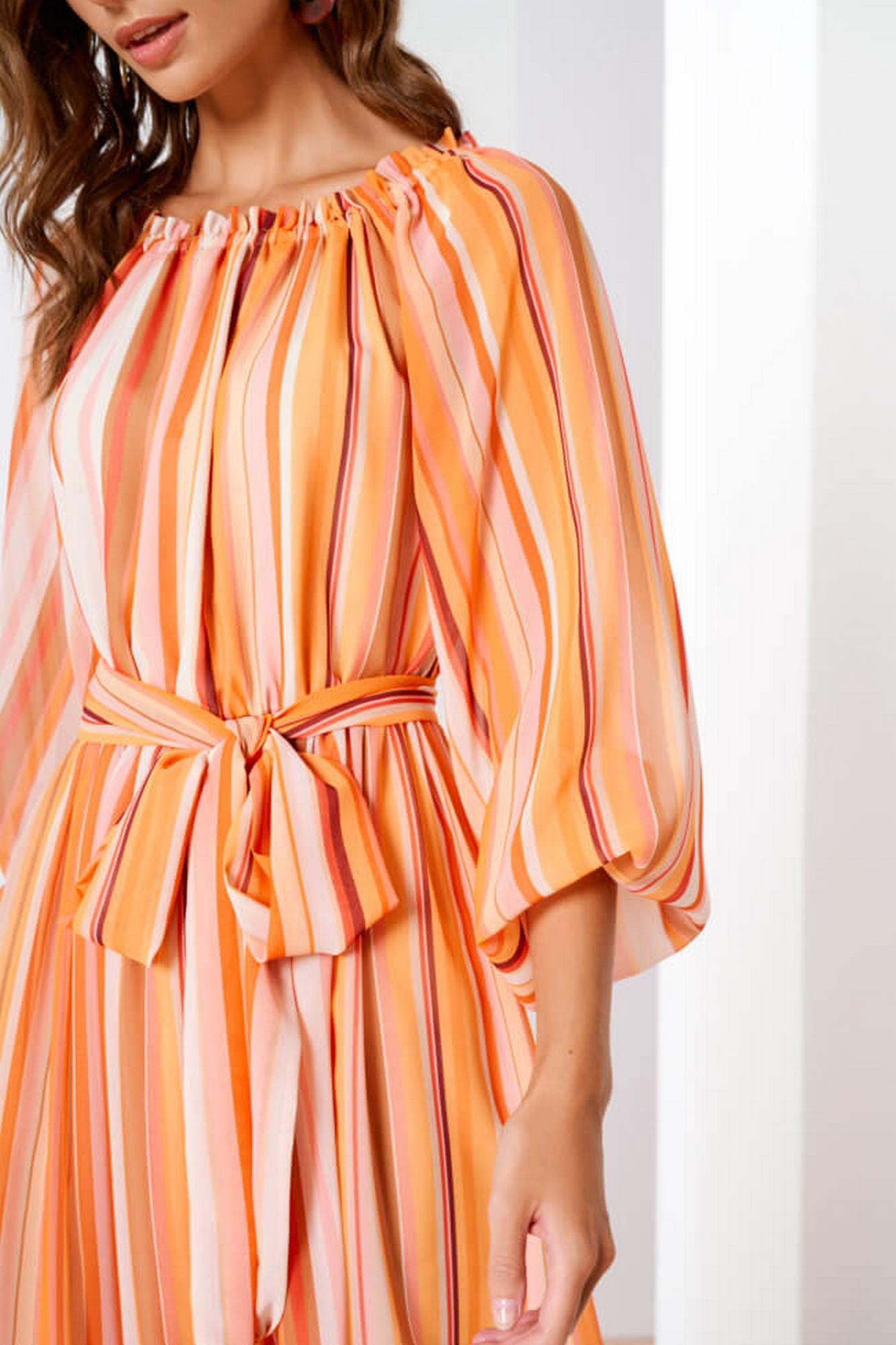 Платье женское от бренда NELVA - это идеальный выбор для женщин, ценящих комфорт и стиль. Данная модель выполнена из летящего шифонового полотна. Платье приталенного силуэта на подкладке. Особенностью изделия является широкий овальный вырез горловины, сосборенный на резинку, что позволяет спускать его на плечи. Рукава реглан, сосборены по низу на резинку, с небольшой рюшей. Платье имеет отрезную линию талии, сосборенную на резинку, что позволяет не стеснять движения, скрывать недостатки и подчеркнуть достоинства фигуры. Дополняется модель широким поясом-лентой из основного полотна, с декоративными зажимами, бусинами и кистями-подвесками на концах. Платье будет оптимальным выбором для любого возраста и комплекции. Универсальный дизайн позволяет создавать стильные образы для отдыха, романтических встреч, рабочих будней и учебы.