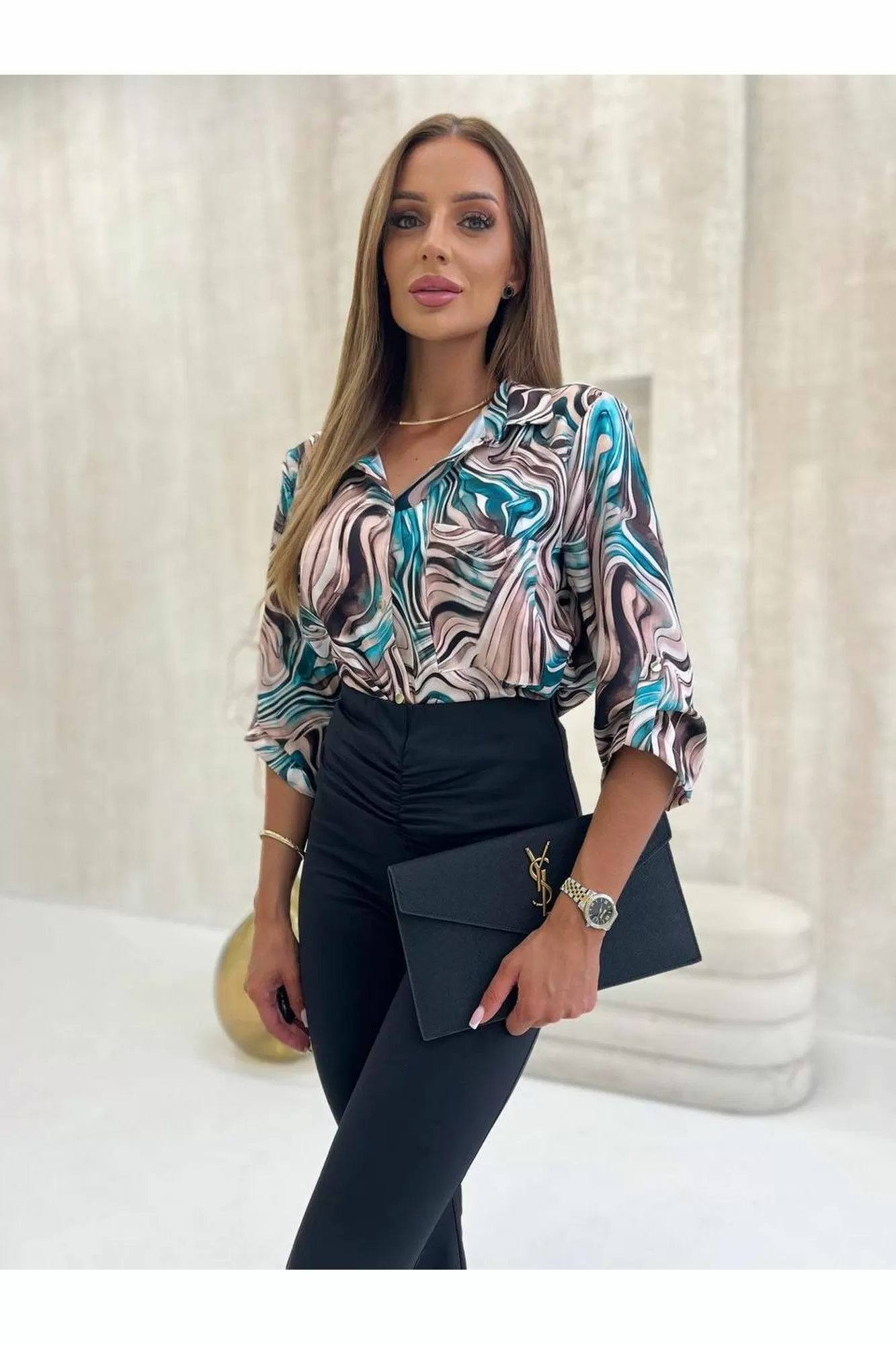 Блузка женская классическая свободная. Выполнена из приятного материала. Прямого свободного силуэта. Воротник рубашечного типа отложной. Рукава втачные 3/4 с манжетой и петлей и пуговицей, с возможностью регулировки. Застегивается на петли и пуговицы спереди на планке. Низ блузки асимметричный. Сзади слегка длиннее переда. Подходит как рубашка строгая на работу или прогулку. Отличный вариант для лета или весны. Параметры модели талия-68, бедра- 94, бюст-88, рост 172cm.