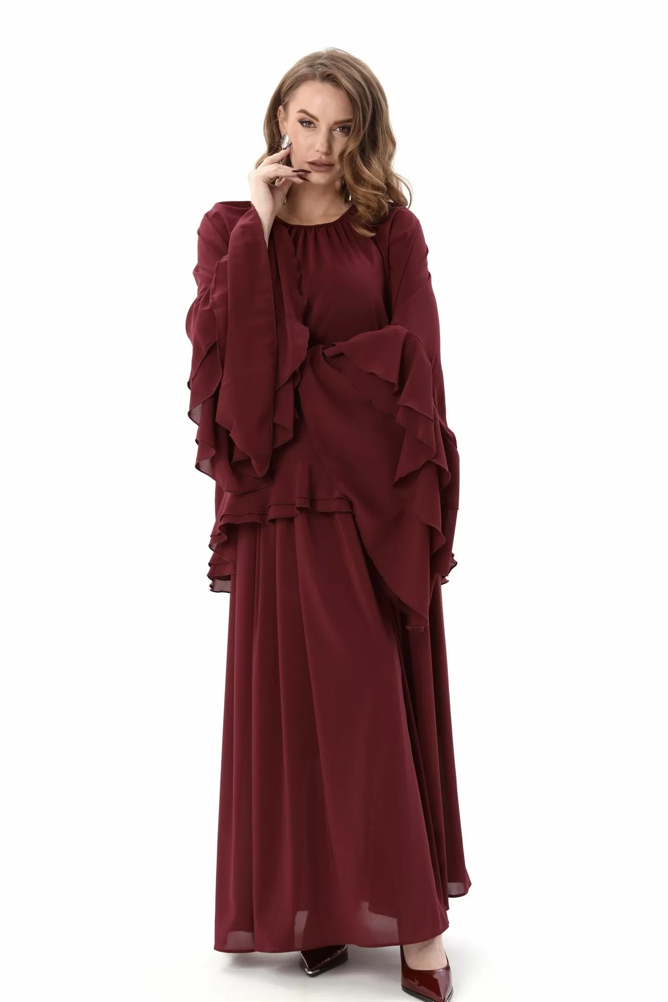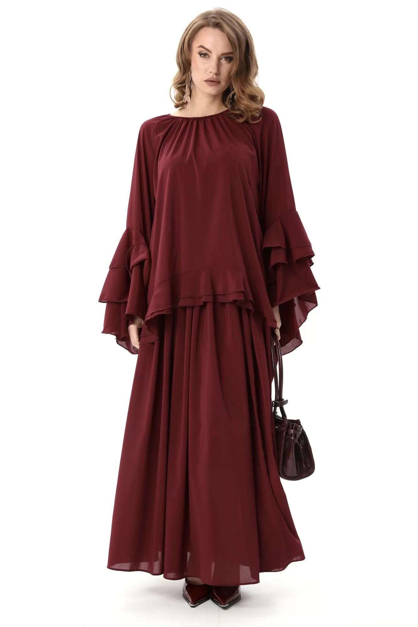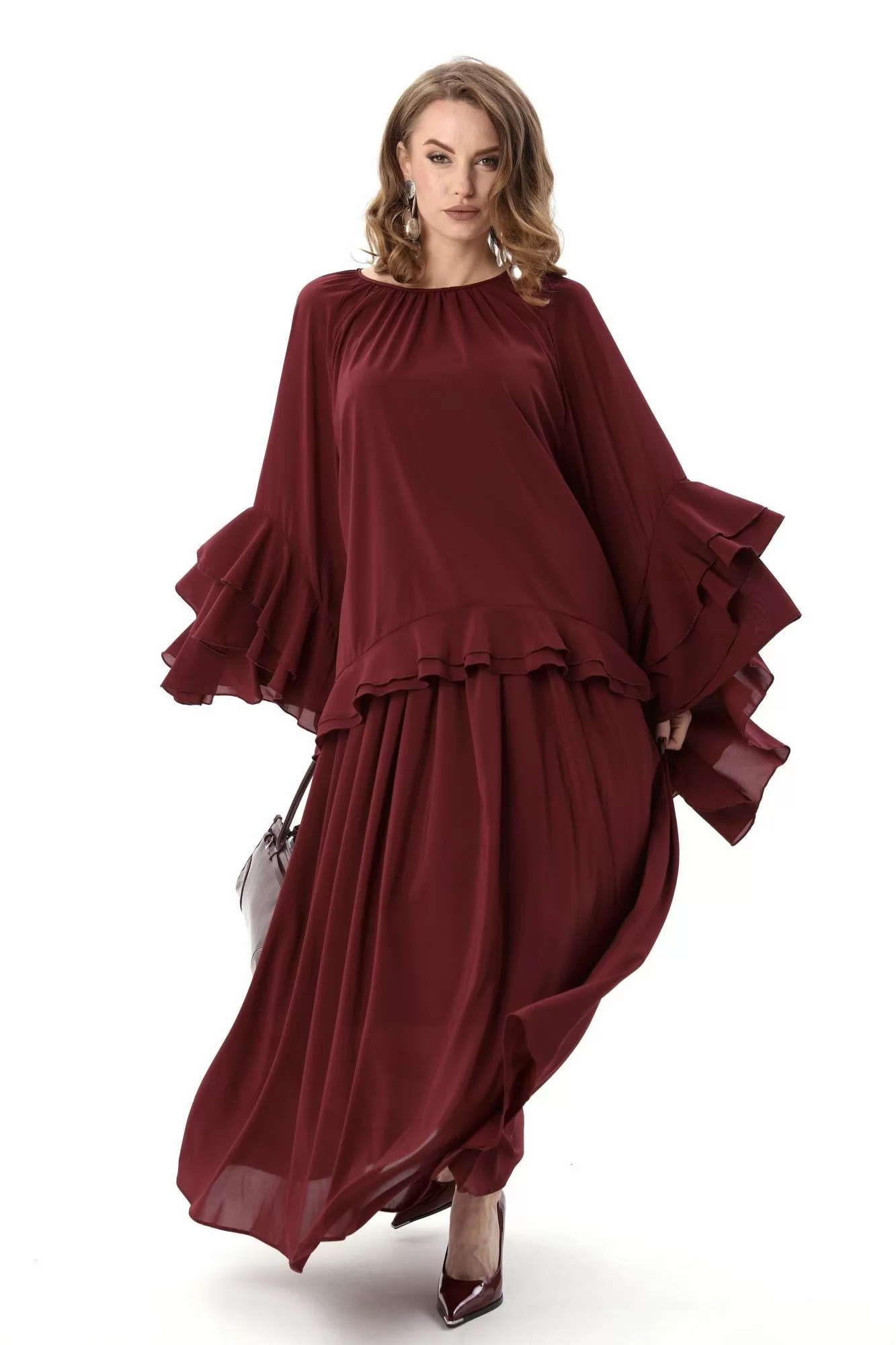 Костюм трехпредметный: состоит из блузы, юбки и комбинации. Блуза свободного силуэта с присборенной горловиной, обработанной бейкой. Спинка со средним швом, переходящим в разрез. Рукава реглан с асимметричными воланами. Юбка макси расширенного силуэта на резинке. Нижний край блузы с двойным воланом. Нижнее платье комбинация на регулируемых бретелях.