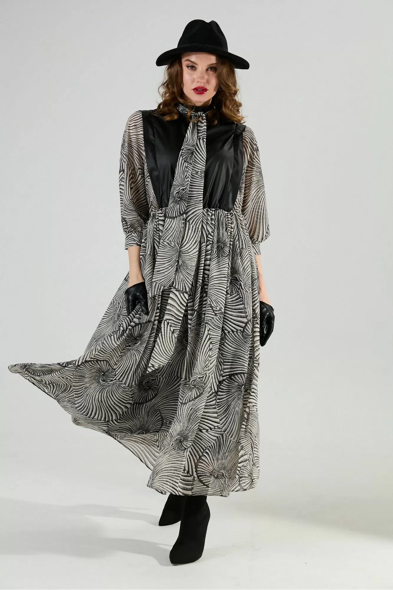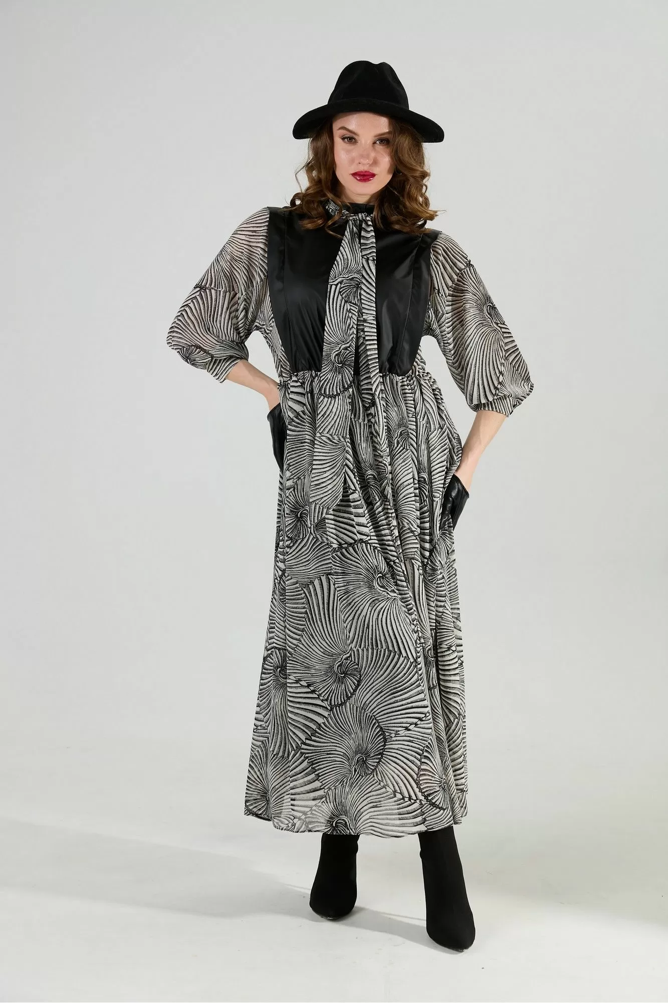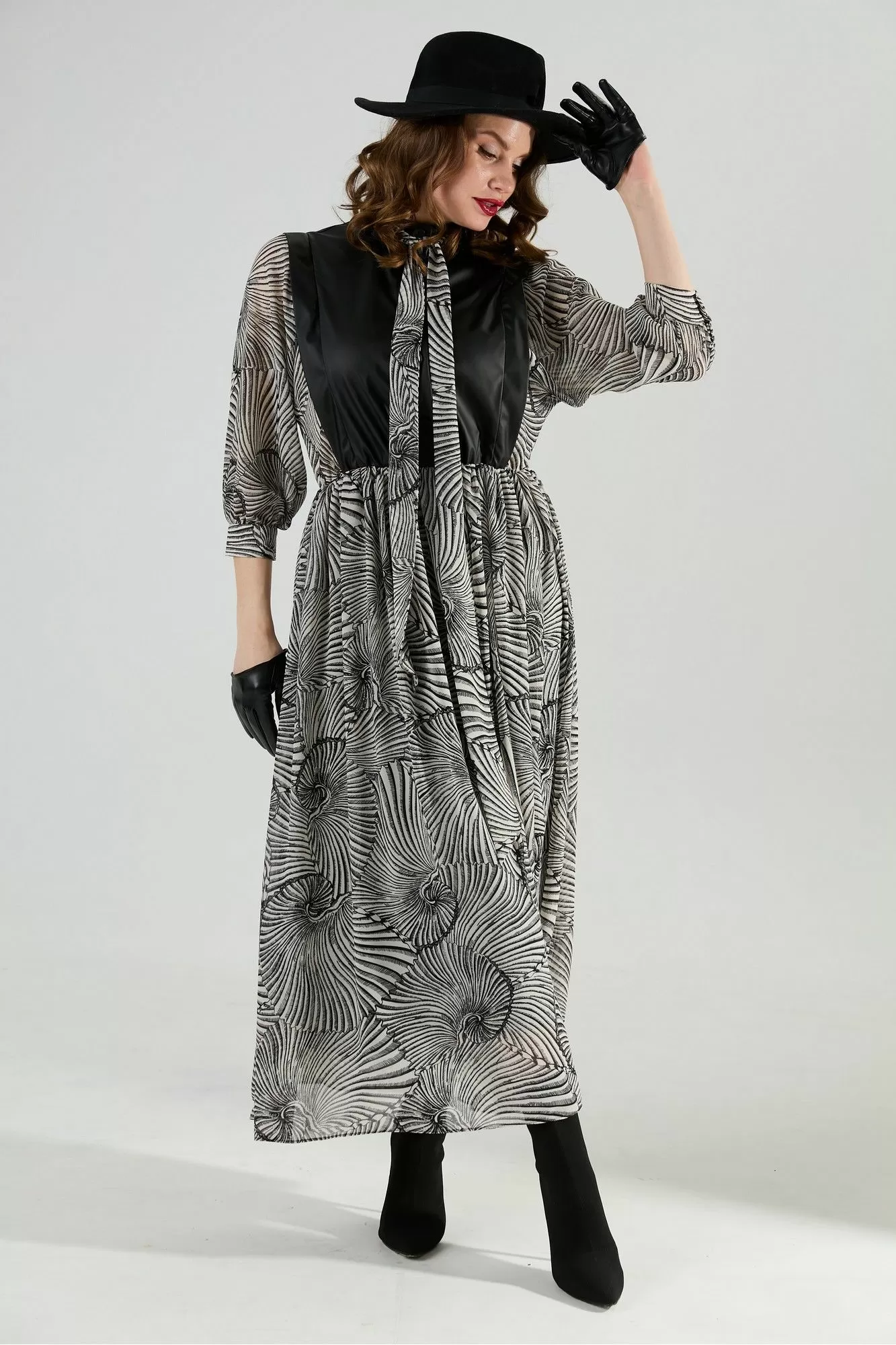 Платье комбинированное длиной макси, отрезное по линии талии с цельнокроеными рукавами. Застежка центральная с цельнокроеными планками на петли и пуговицы. Верхние части переда и спинки с вертикальными рельефами, начинающимися от линии плеча. Бантовая складка расположена по центру, боковые складки направлены от центра изделия в сторону бокового шва. Рукав цельнокроеный с боковыми частями переда и спинки с углубленной до линии талии проймой. По центру оката рукава сборка. Нижний срез рукава обработан притачной манжетой. Застежка манжеты на петли и пуговицы. Платье по линии талии собрано на резинку. Горловина изделия круглой формы, обработана воротником-стойкой, с застежкой на петли и пуговицы. Платье дополнено съёмным бантом. Бант съёмный, продевается в шлевки, расположенные на воротнике-стойке.