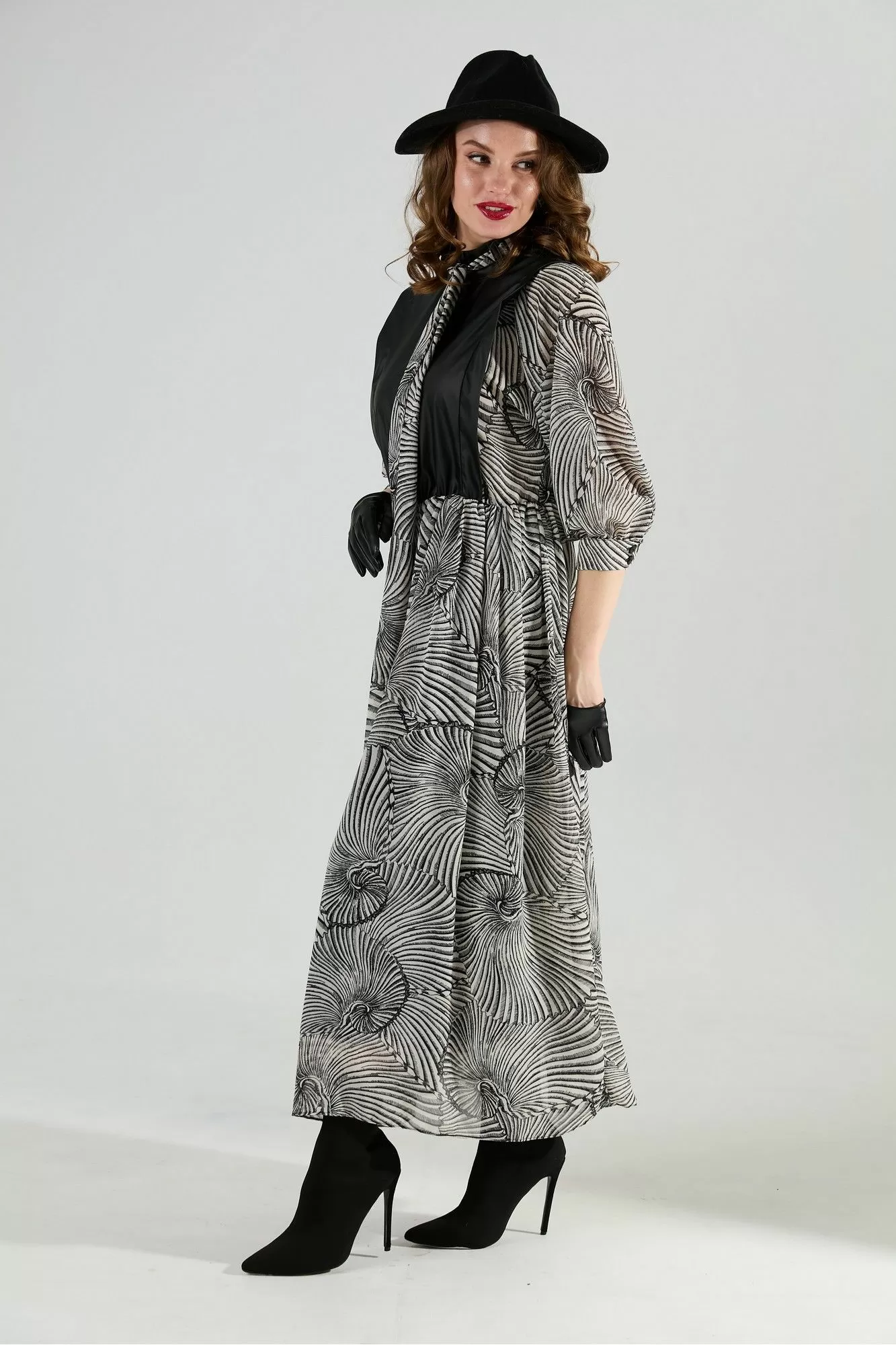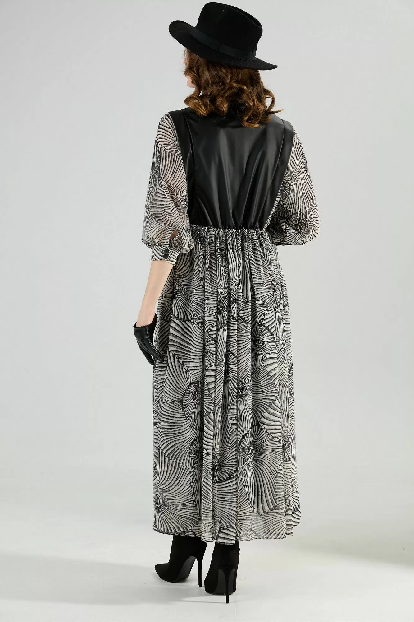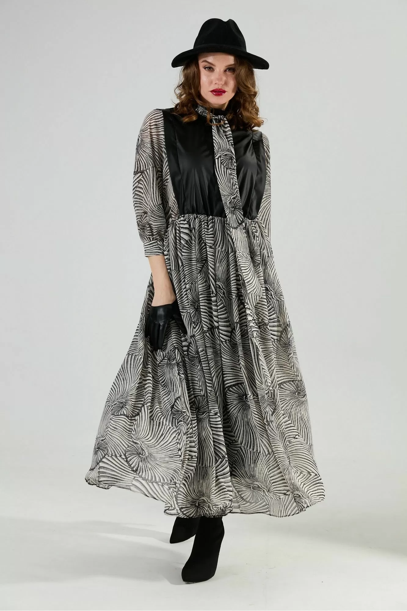 Платье комбинированное длиной макси, отрезное по линии талии с цельнокроеными рукавами. Застежка центральная с цельнокроеными планками на петли и пуговицы. Верхние части переда и спинки с вертикальными рельефами, начинающимися от линии плеча. Бантовая складка расположена по центру, боковые складки направлены от центра изделия в сторону бокового шва. Рукав цельнокроеный с боковыми частями переда и спинки с углубленной до линии талии проймой. По центру оката рукава сборка. Нижний срез рукава обработан притачной манжетой. Застежка манжеты на петли и пуговицы. Платье по линии талии собрано на резинку. Горловина изделия круглой формы, обработана воротником-стойкой, с застежкой на петли и пуговицы. Платье дополнено съёмным бантом. Бант съёмный, продевается в шлевки, расположенные на воротнике-стойке.