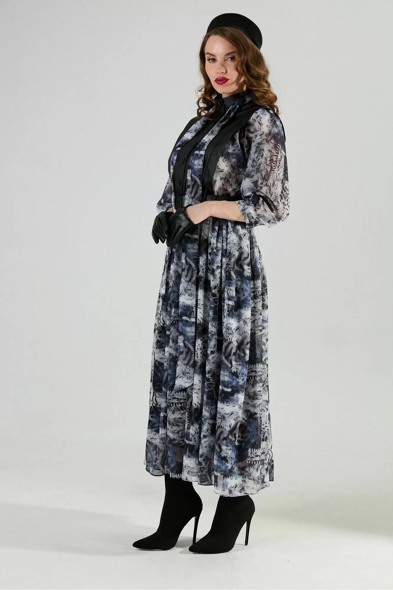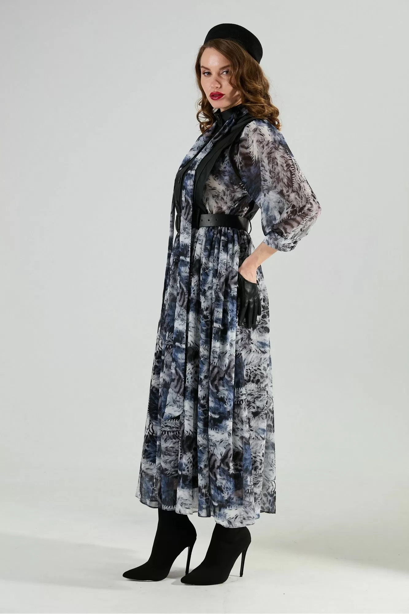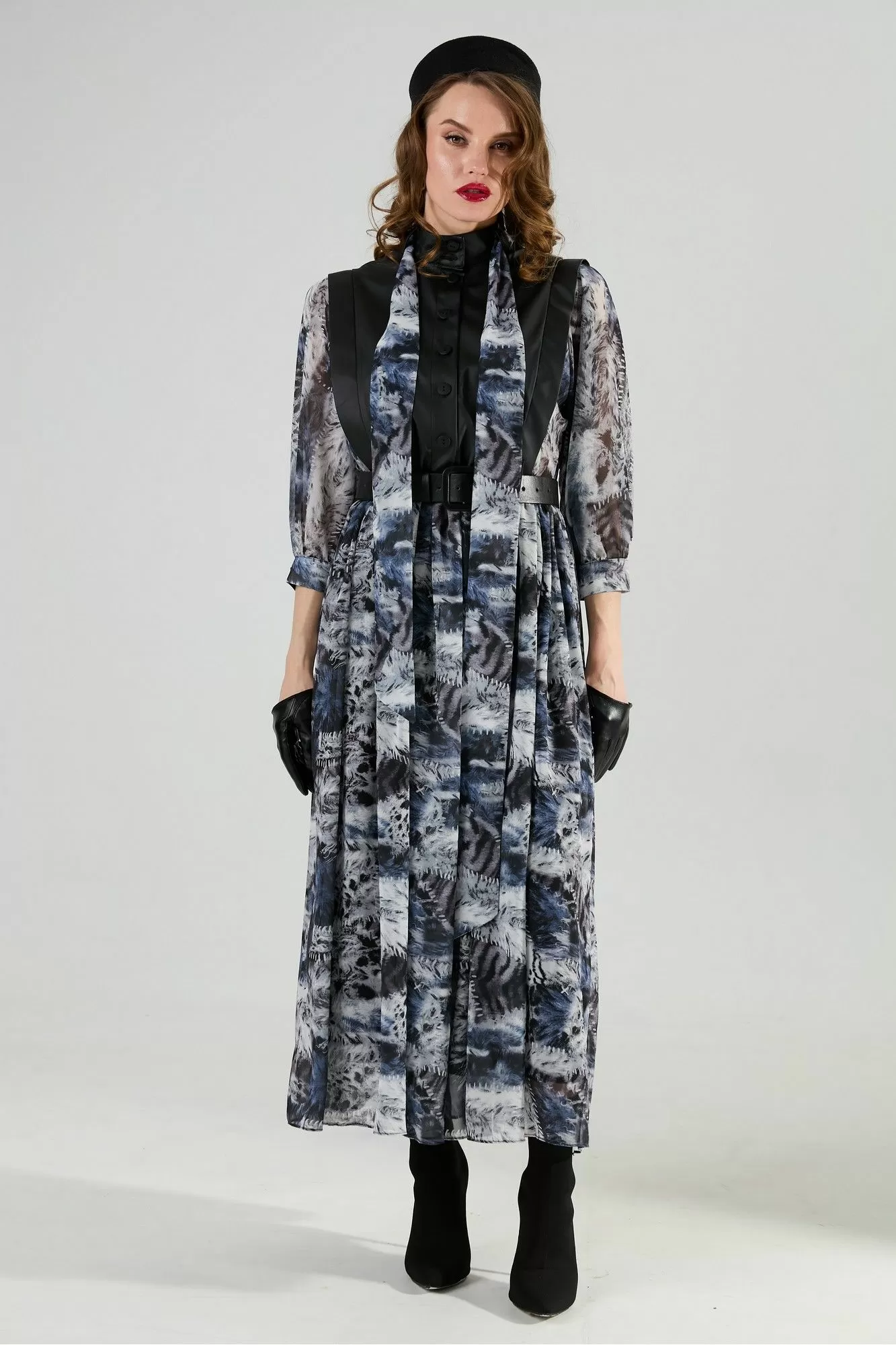 Платье комбинированное длиной макси, отрезное по линии талии с цельнокроеными рукавами. Застежка центральная с цельнокроеными планками на петли и пуговицы. Верхние части переда и спинки с вертикальными рельефами, начинающимися от линии плеча. Бантовая складка расположена по центру, боковые складки направлены от центра изделия в сторону бокового шва. Рукав цельнокроеный с боковыми частями переда и спинки с углубленной до линии талии проймой. По центру оката рукава сборка. Нижний срез рукава обработан притачной манжетой. Застежка манжеты на петли и пуговицы. Платье по линии талии собрано на резинку. Горловина изделия круглой формы, обработана воротником-стойкой, с застежкой на петли и пуговицы. Платье дополнено съёмным бантом. Бант съёмный, продевается в шлевки, расположенные на воротнике-стойке. В комплект к изделию идёт ремень из экокожи.