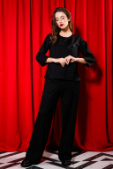 Брюки со стрелкой свободного кроя, верхний срез представлен широкой резинкой, с карманами.