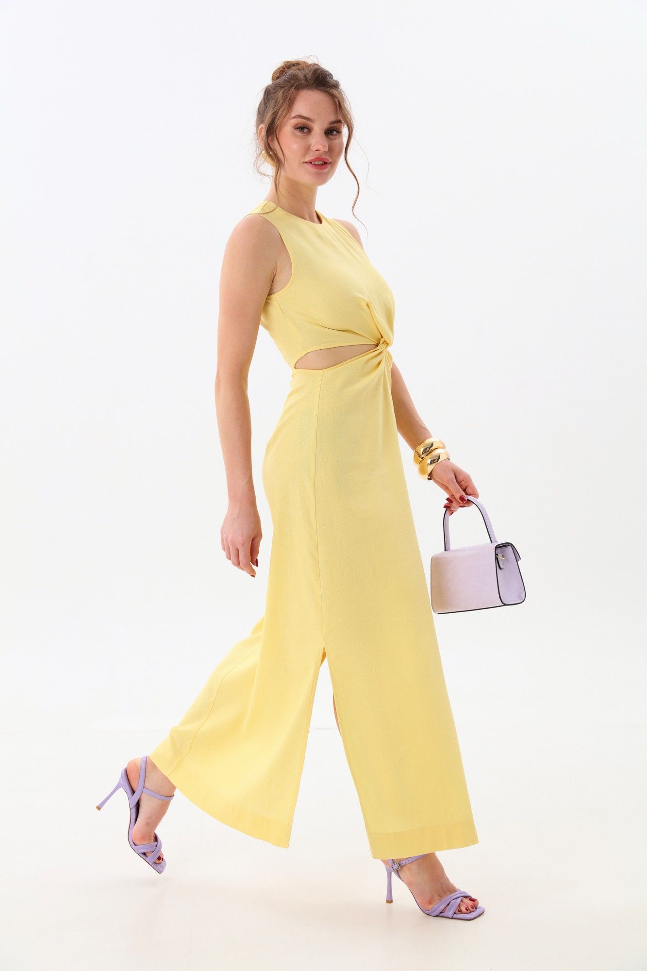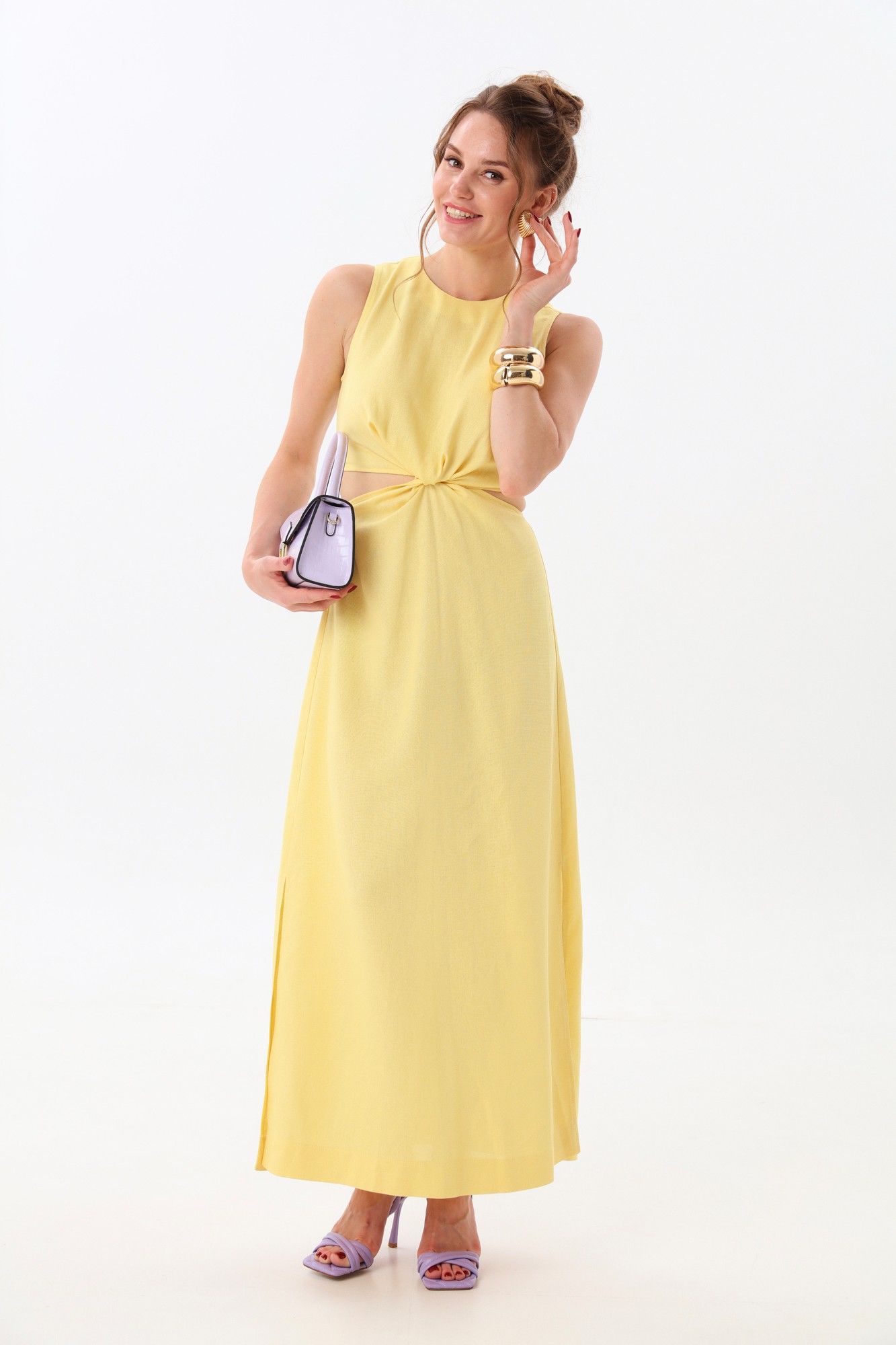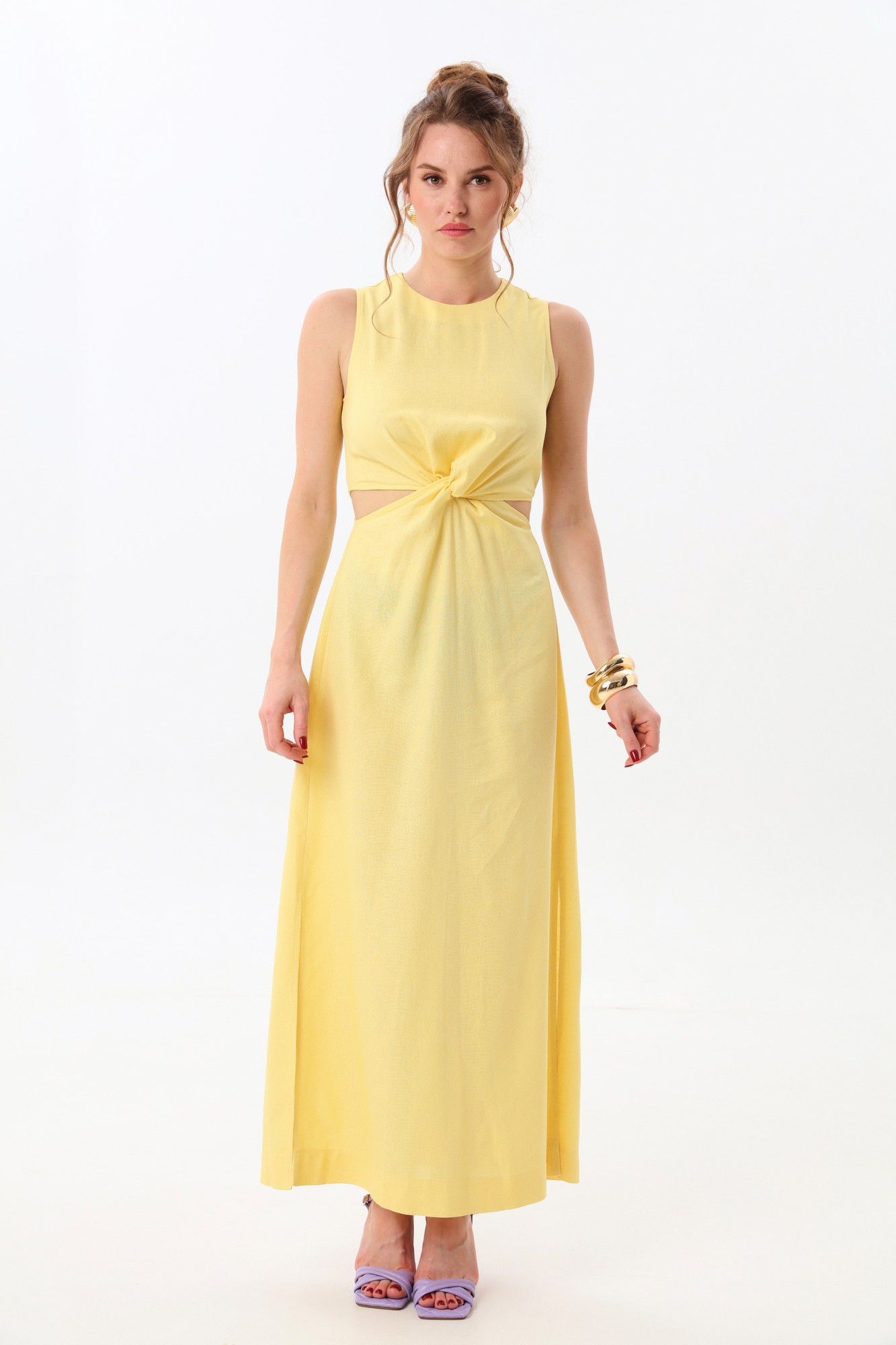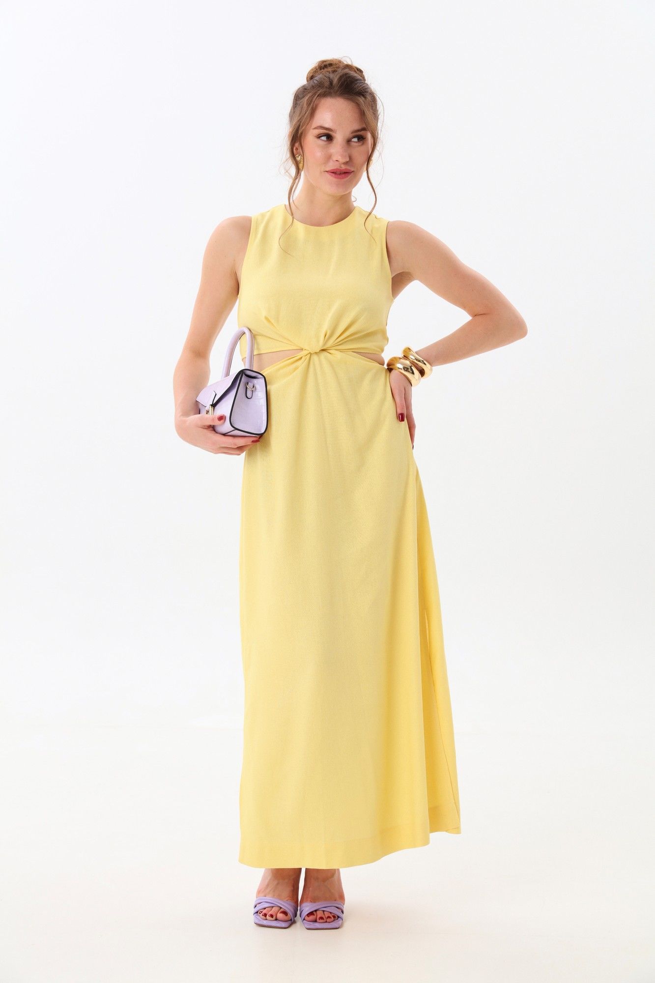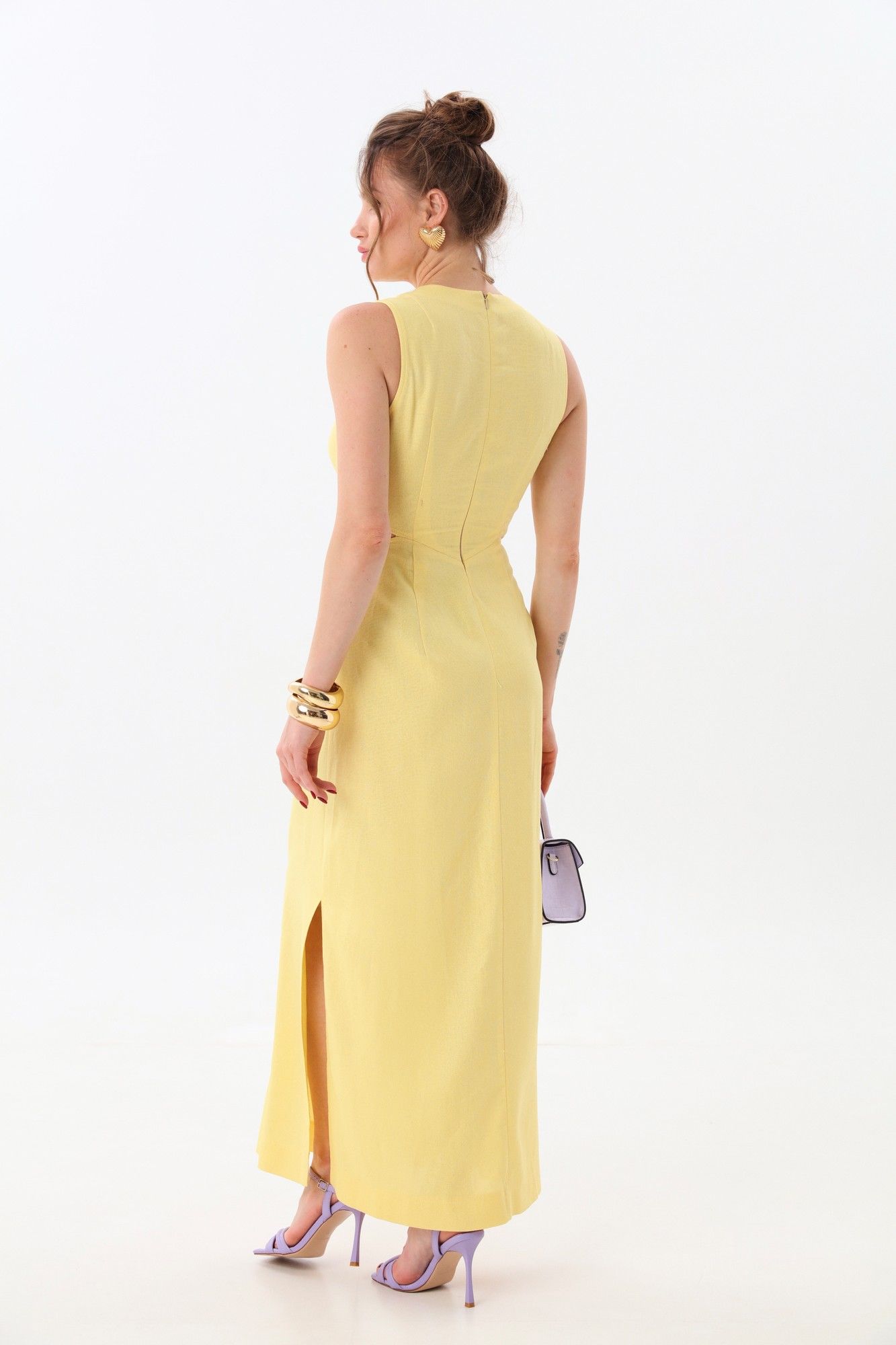 Платье прямого силуэта, слегка расклешённое к низу, длиной до щиколотки. Платье отрезное по талии. Спереди на уровне талии драпировка, имитирующая узел между лифом и юбкой платья. Боковые вырезы на талии сзади и спереди. Застёжка в среднем шве спинки на потайную молнию.