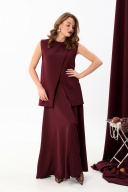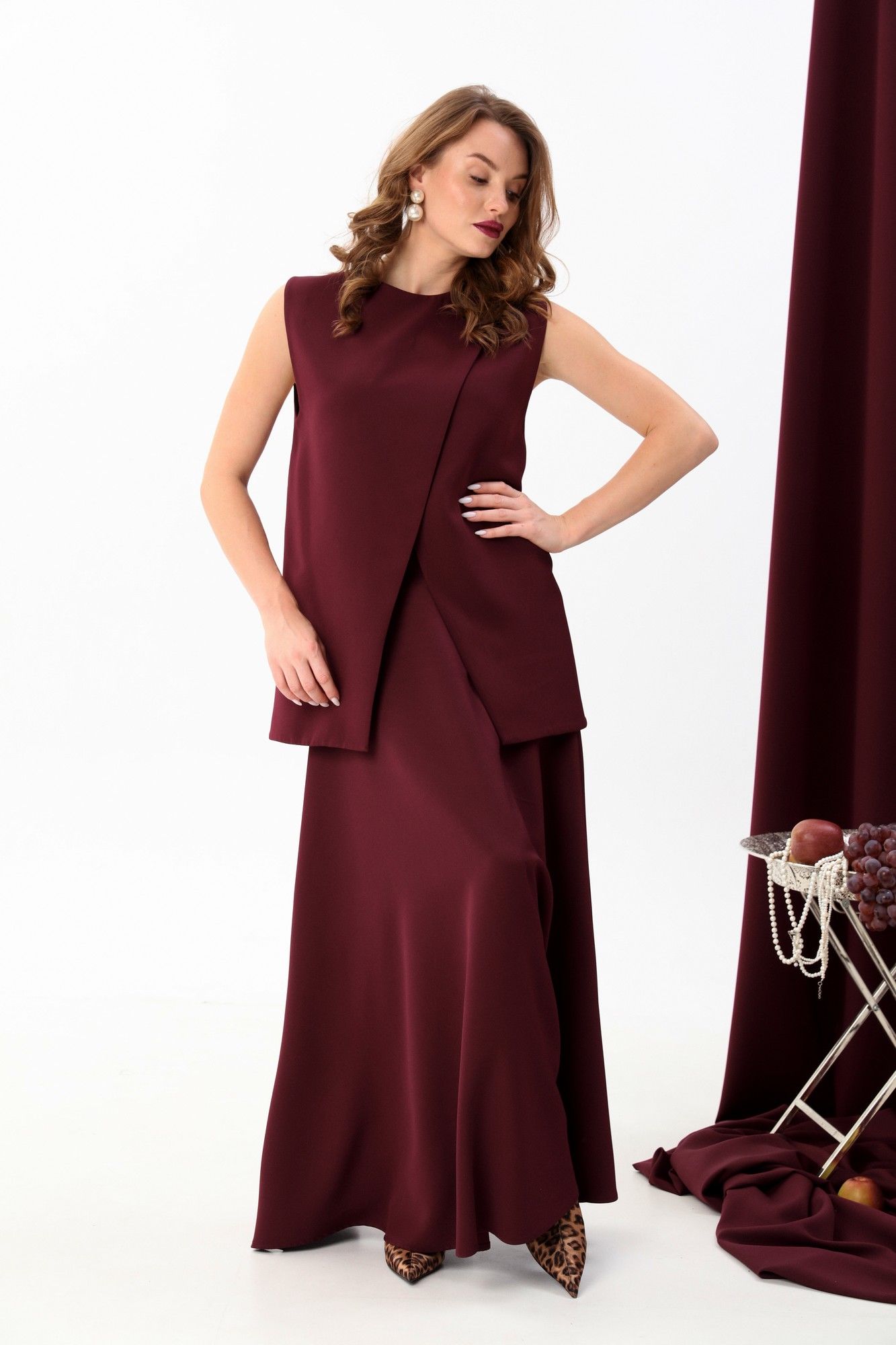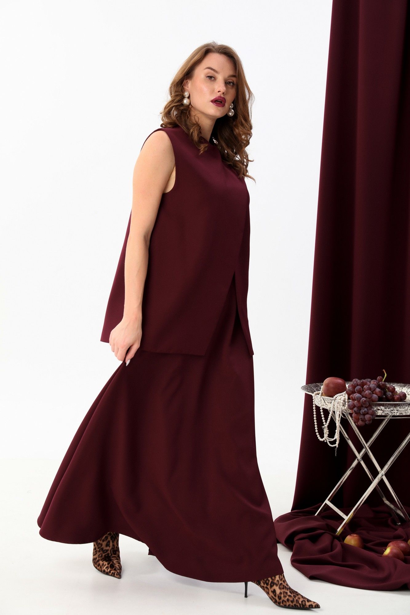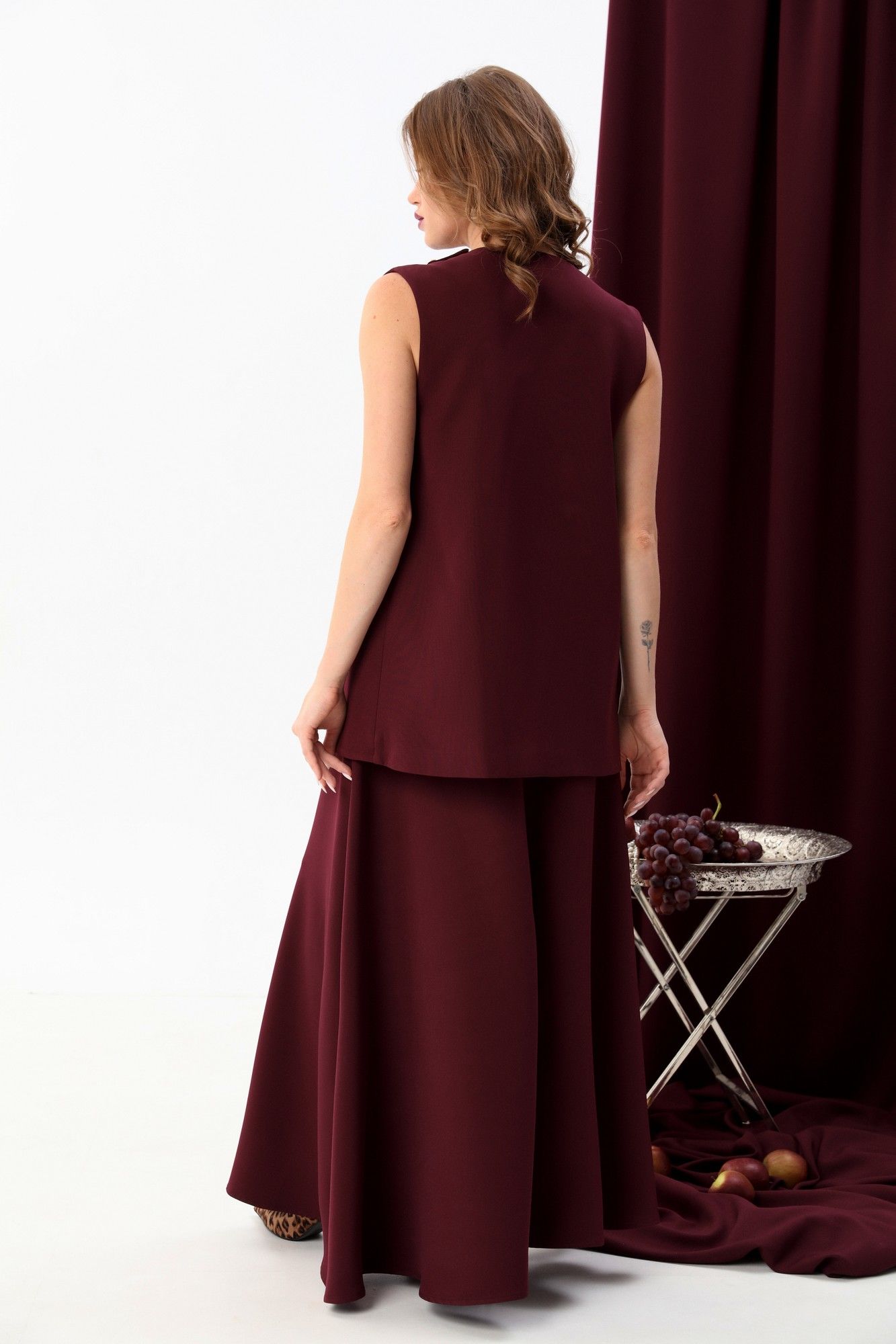 Костюм двухпредметный: состоит из жилета и юбки. Жилет назапах с полукруглым вырезом. Застёжка на петли и пуговицы на уровне плечевого шва. Роскошная юбка - солнце миди с узким поясом. В боковых швах расположены карманы. Изделие без подкладки.
