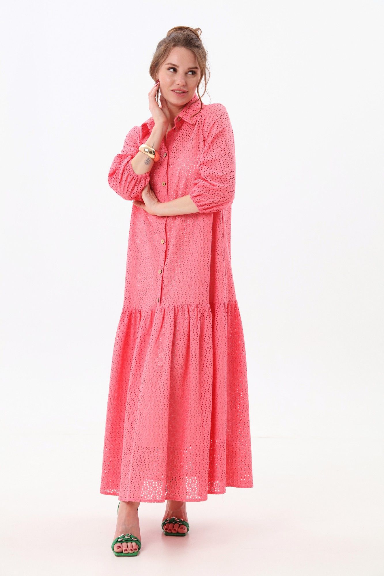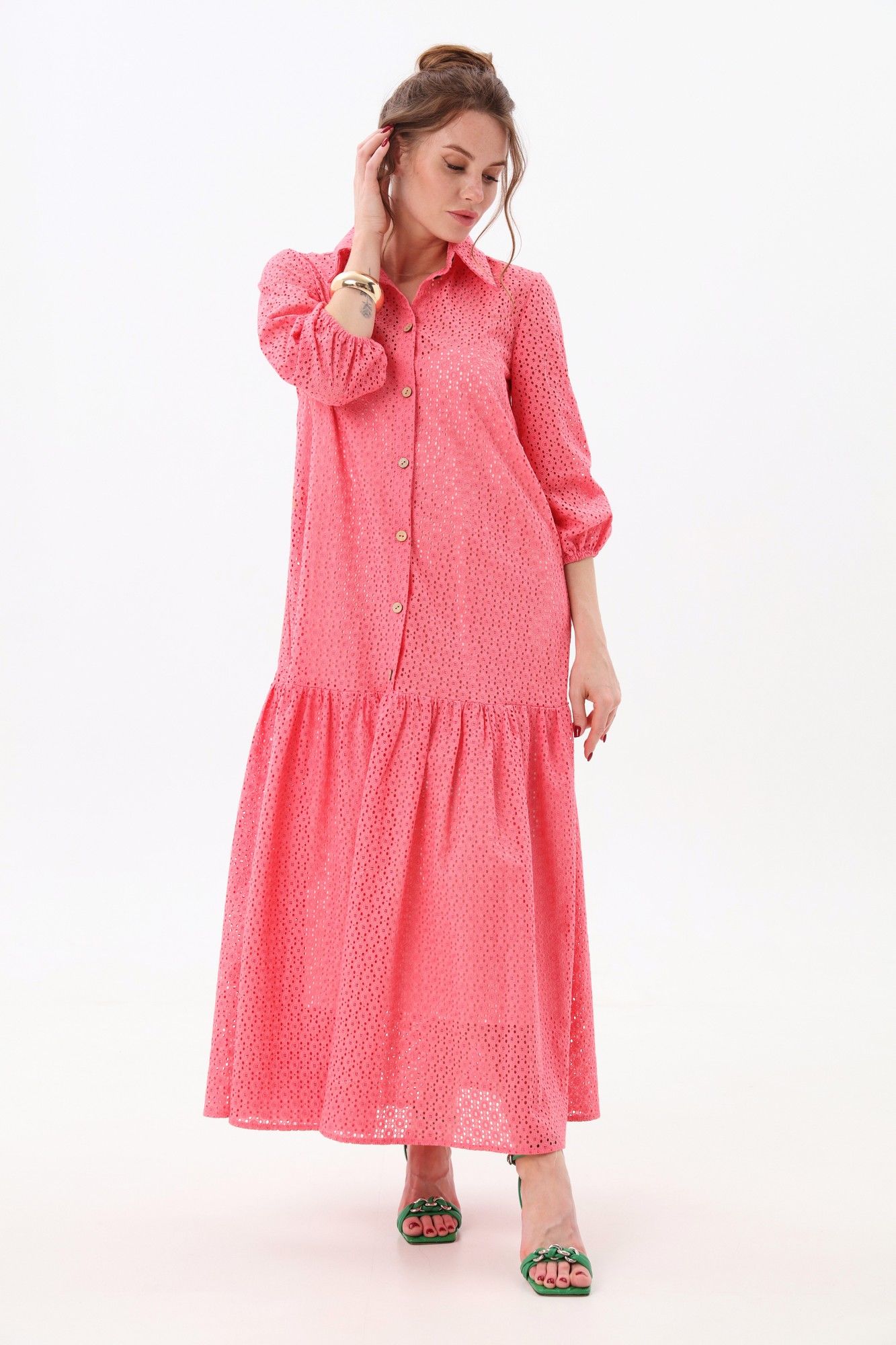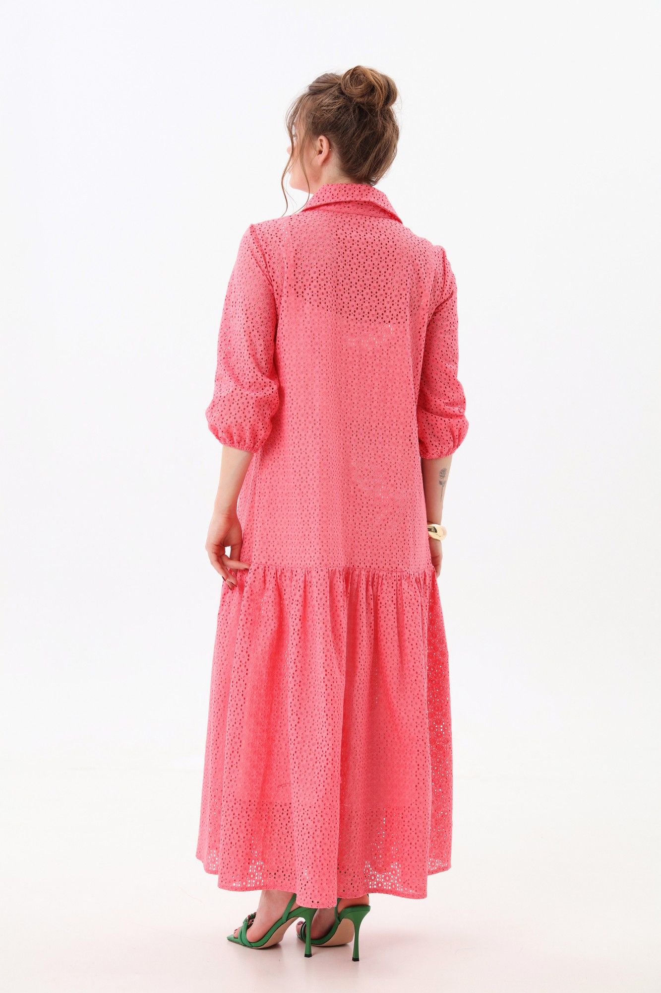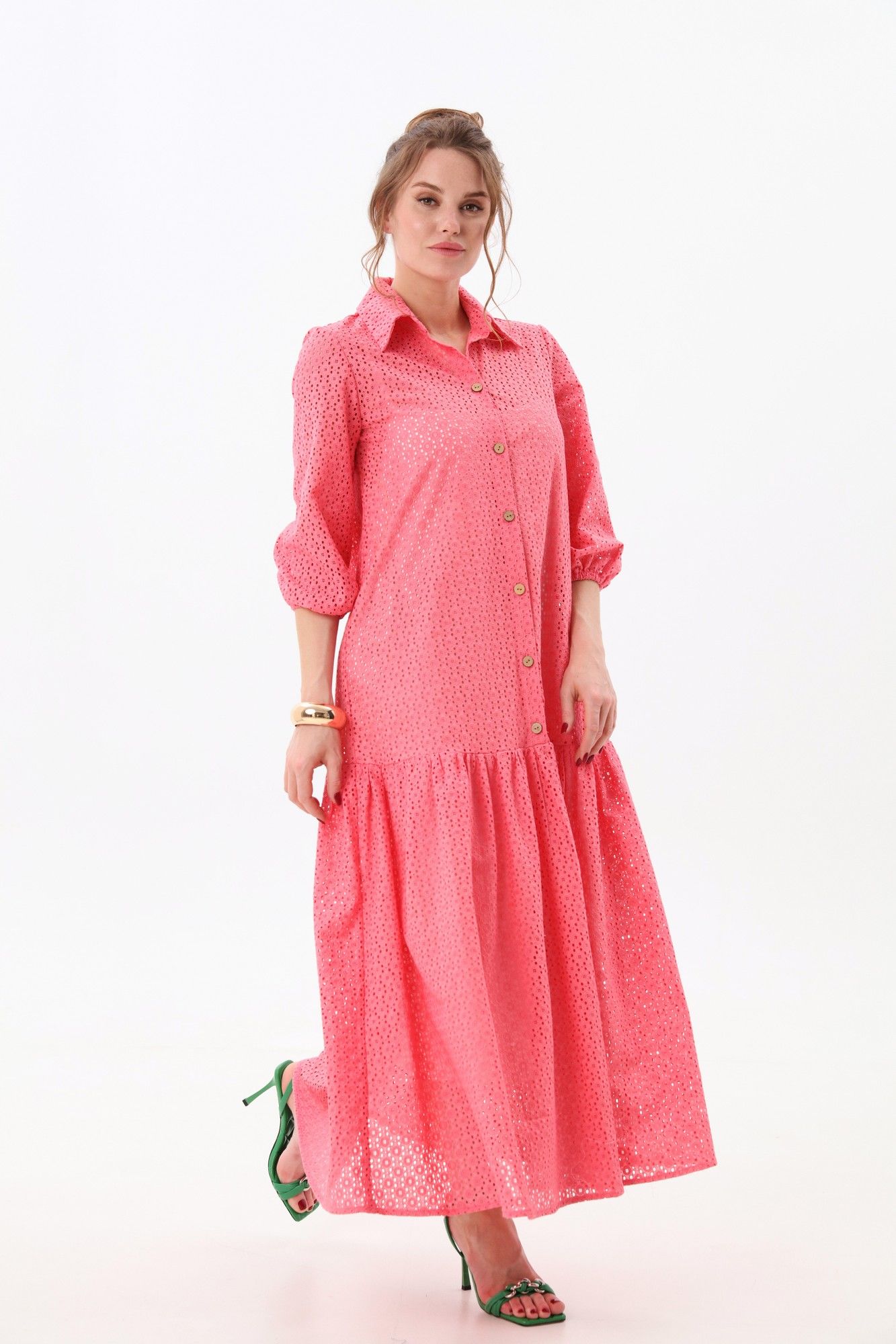 Платье состоит из двух платьев: нижнего и верхнего. Верхнее платье макси прямого свободного силуэта с воланом по низу изделия. Рукав втачной. Горловина обработана плосколежащим воротником. Центральная застёжка на петли и пуговицы. Нижнее платье комбинация на регулируемых бретелях.
