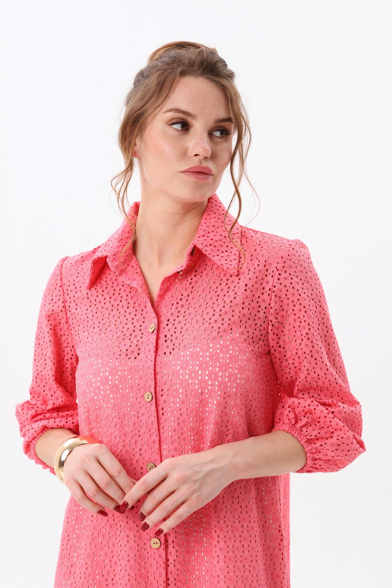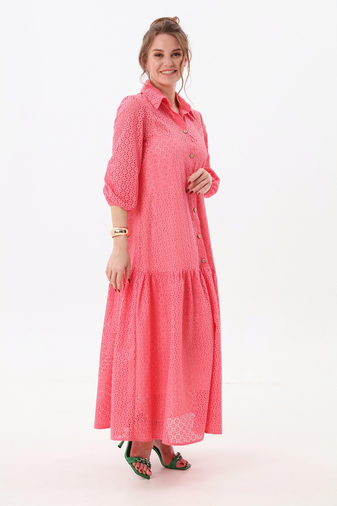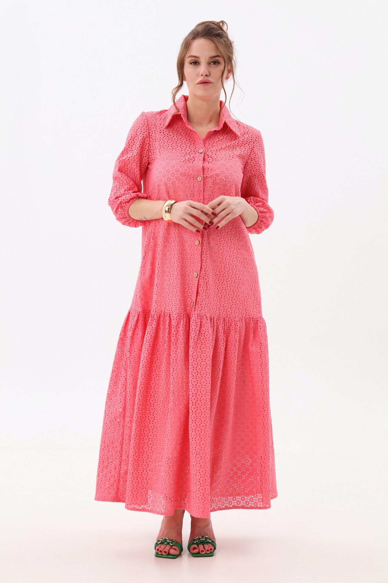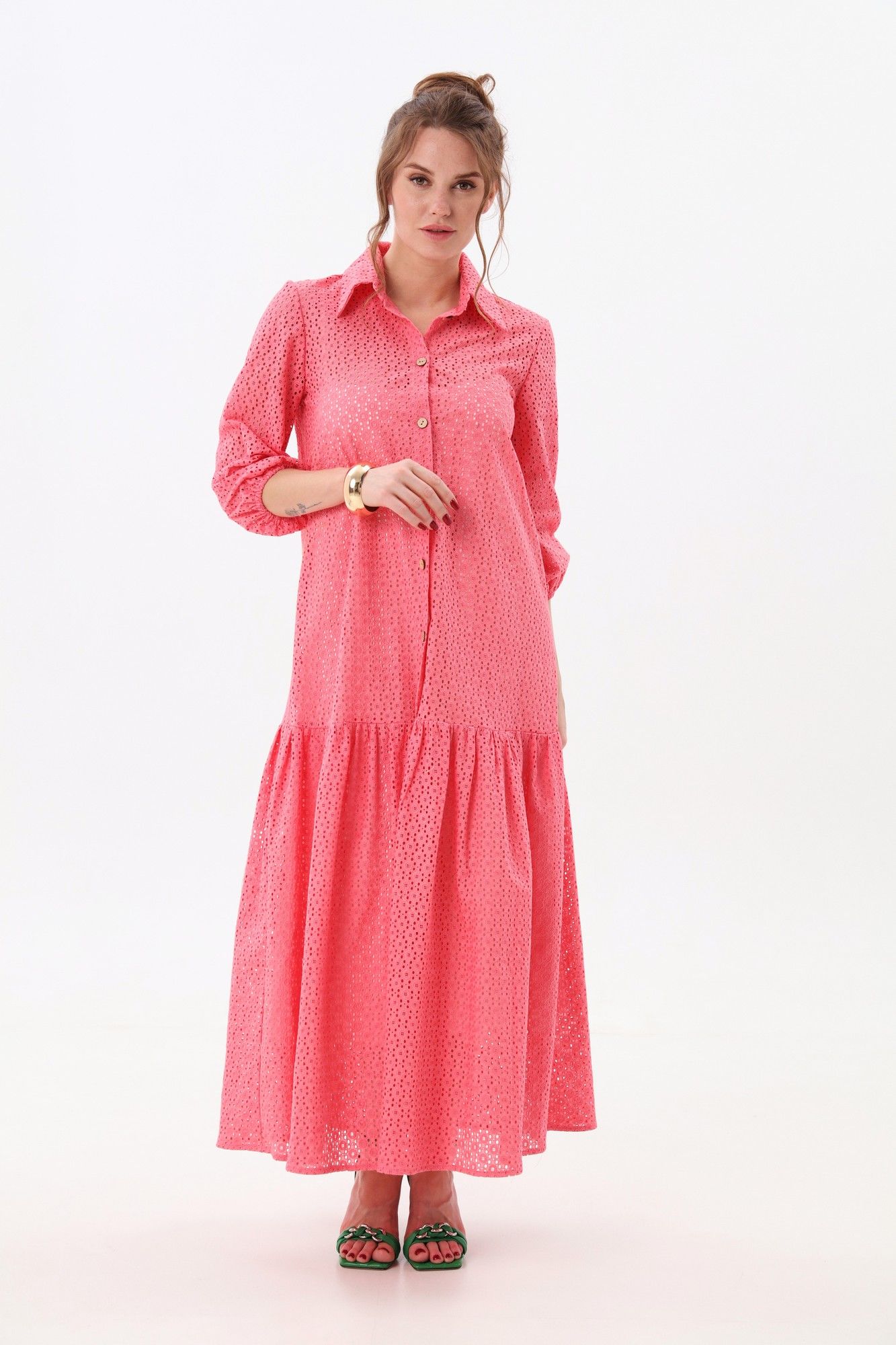 Платье состоит из двух платьев: нижнего и верхнего. Верхнее платье макси прямого свободного силуэта с воланом по низу изделия. Рукав втачной. Горловина обработана плосколежащим воротником. Центральная застёжка на петли и пуговицы. Нижнее платье комбинация на регулируемых бретелях.