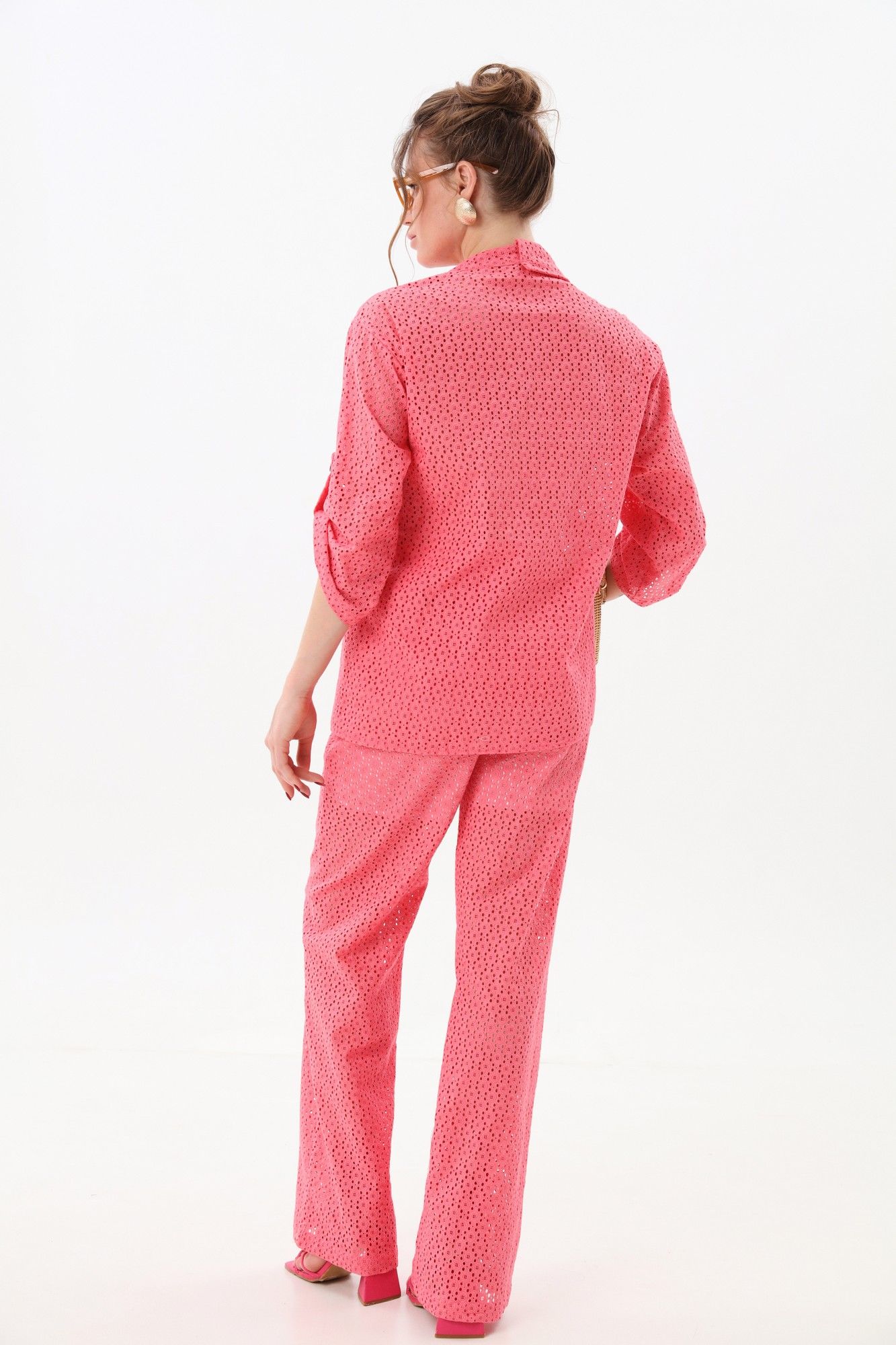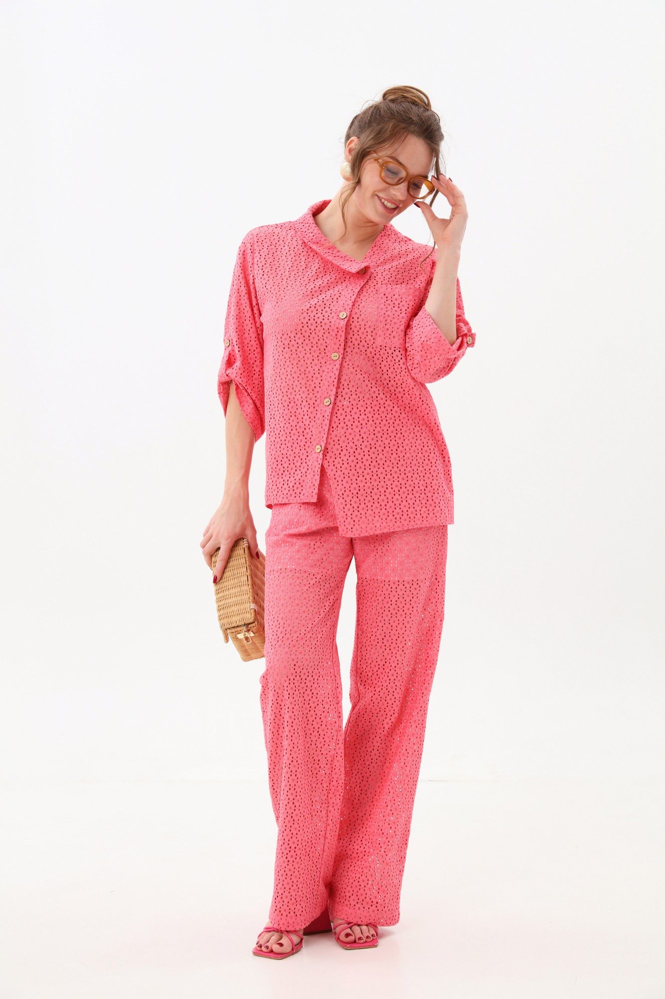 Жакет рубашечного типа прямого силуэта с асимметричным низом. Рукав втачной со спущенной линией плеча, фиксируется на пату. Застежка центральная на петли и пуговицы, смещённая по косой. На левой полочке накладной карман с клапаном. Воротник отложной на стойке до половины спинки.