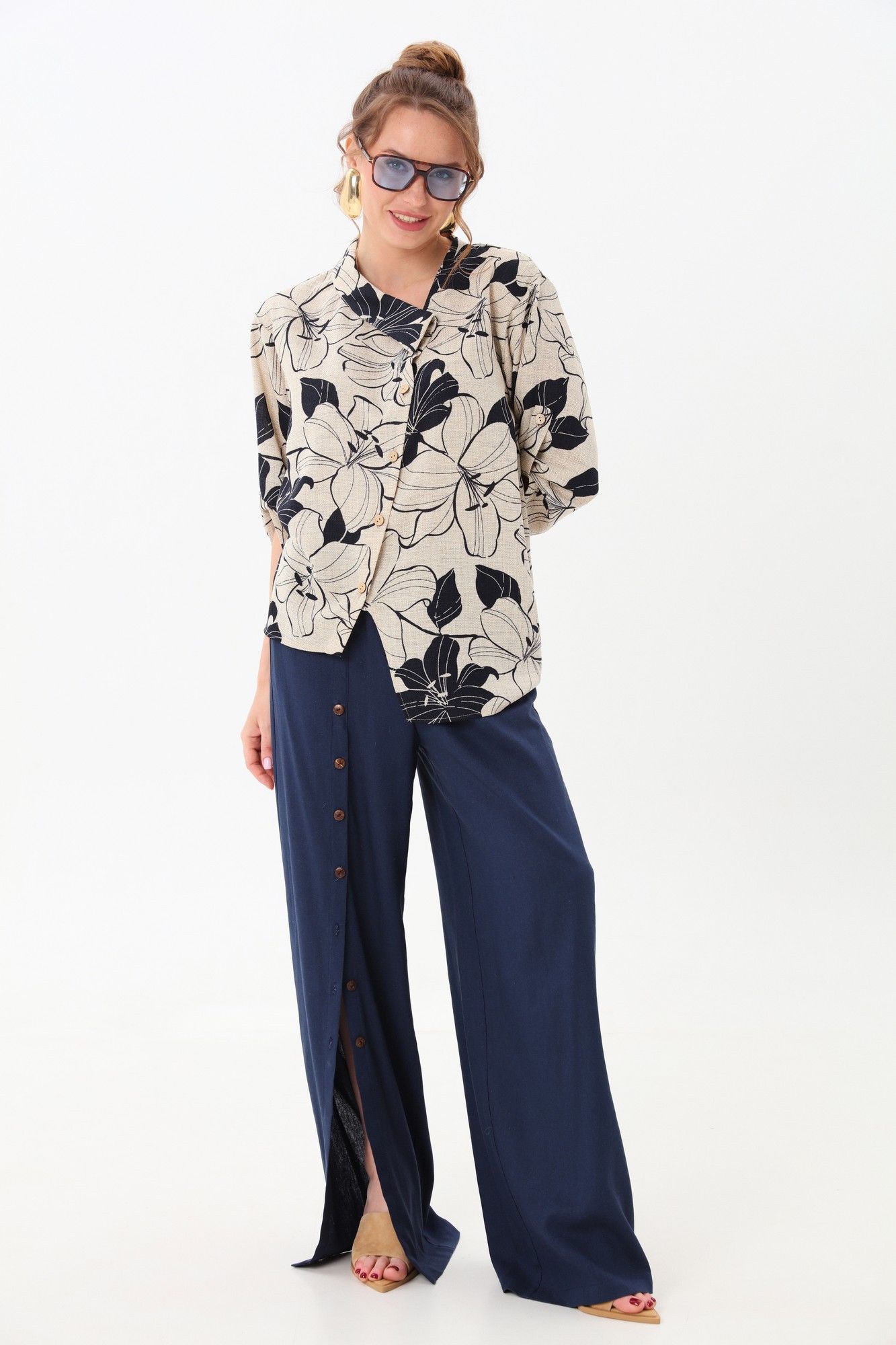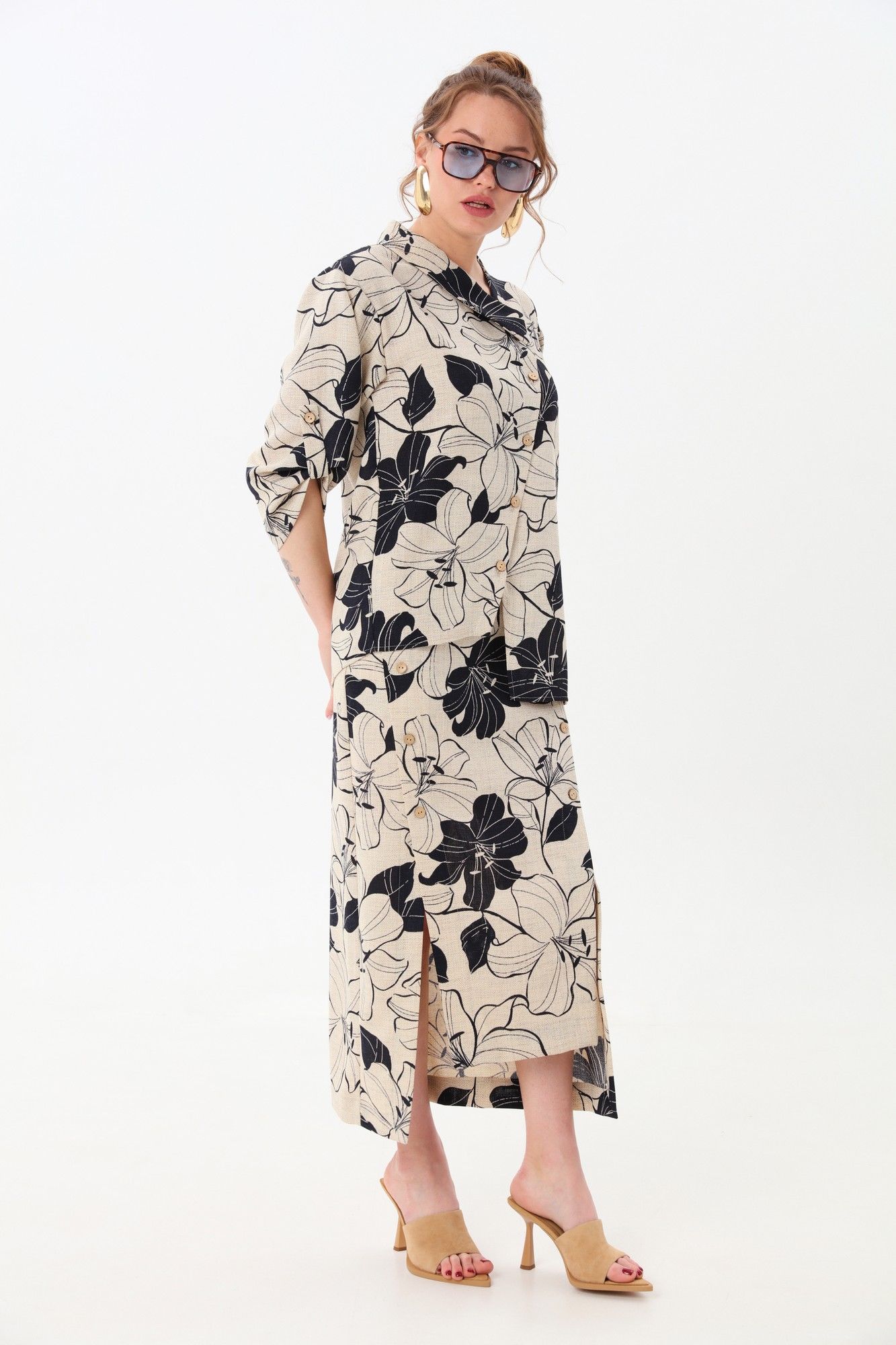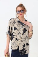 Жакет рубашечного типа прямого силуэта с асимметричным низом. Рукав втачной со спущенной линией плеча, фиксируется на пату. Застежка центральная на петли и пуговицы, смещённая по косой. Воротник отложной на стойке до половины спинки.