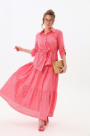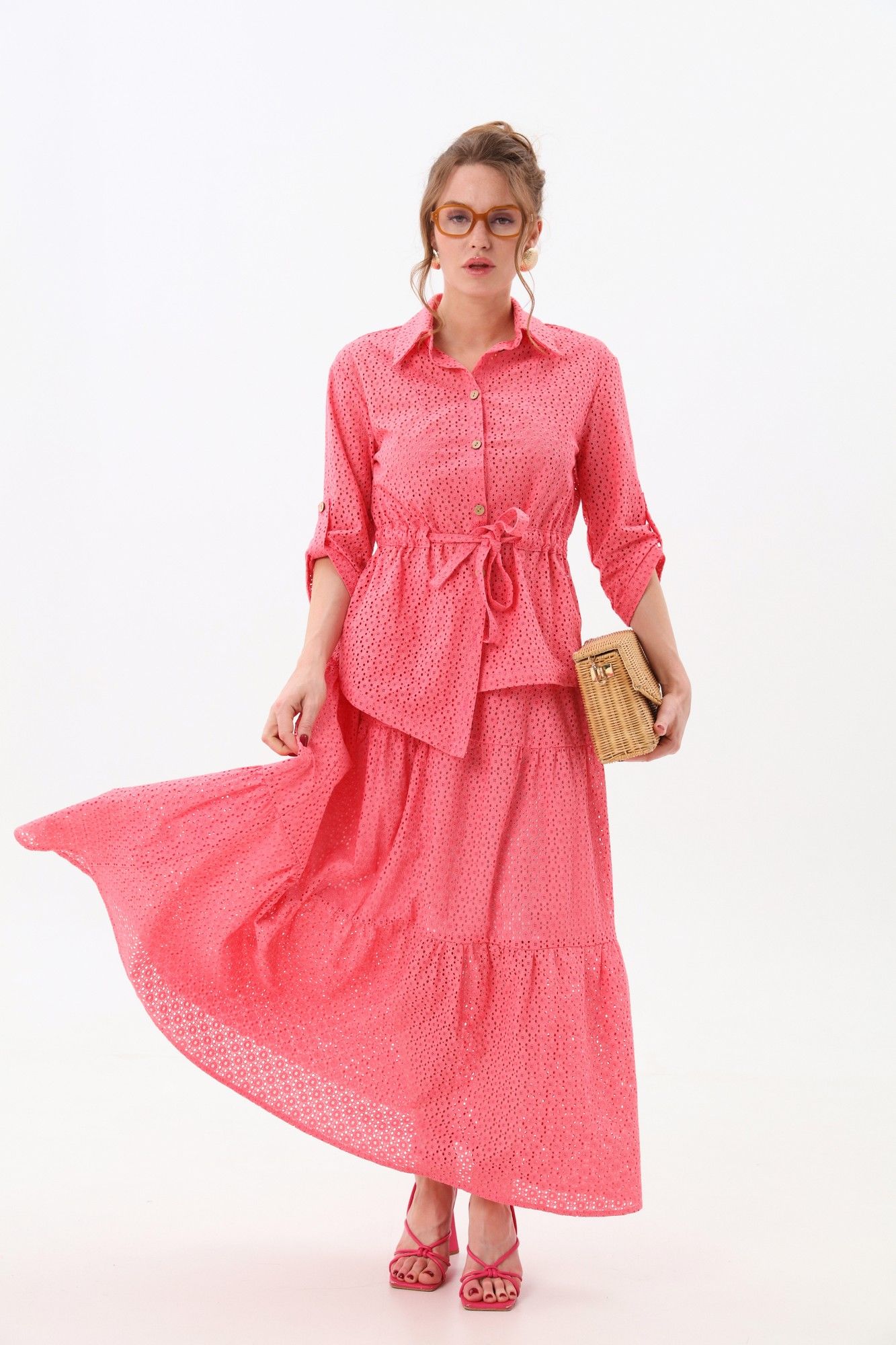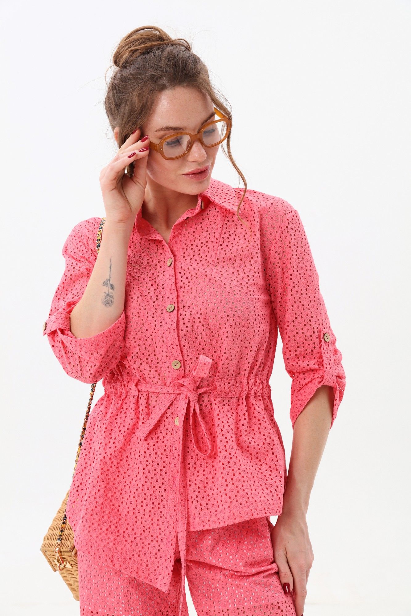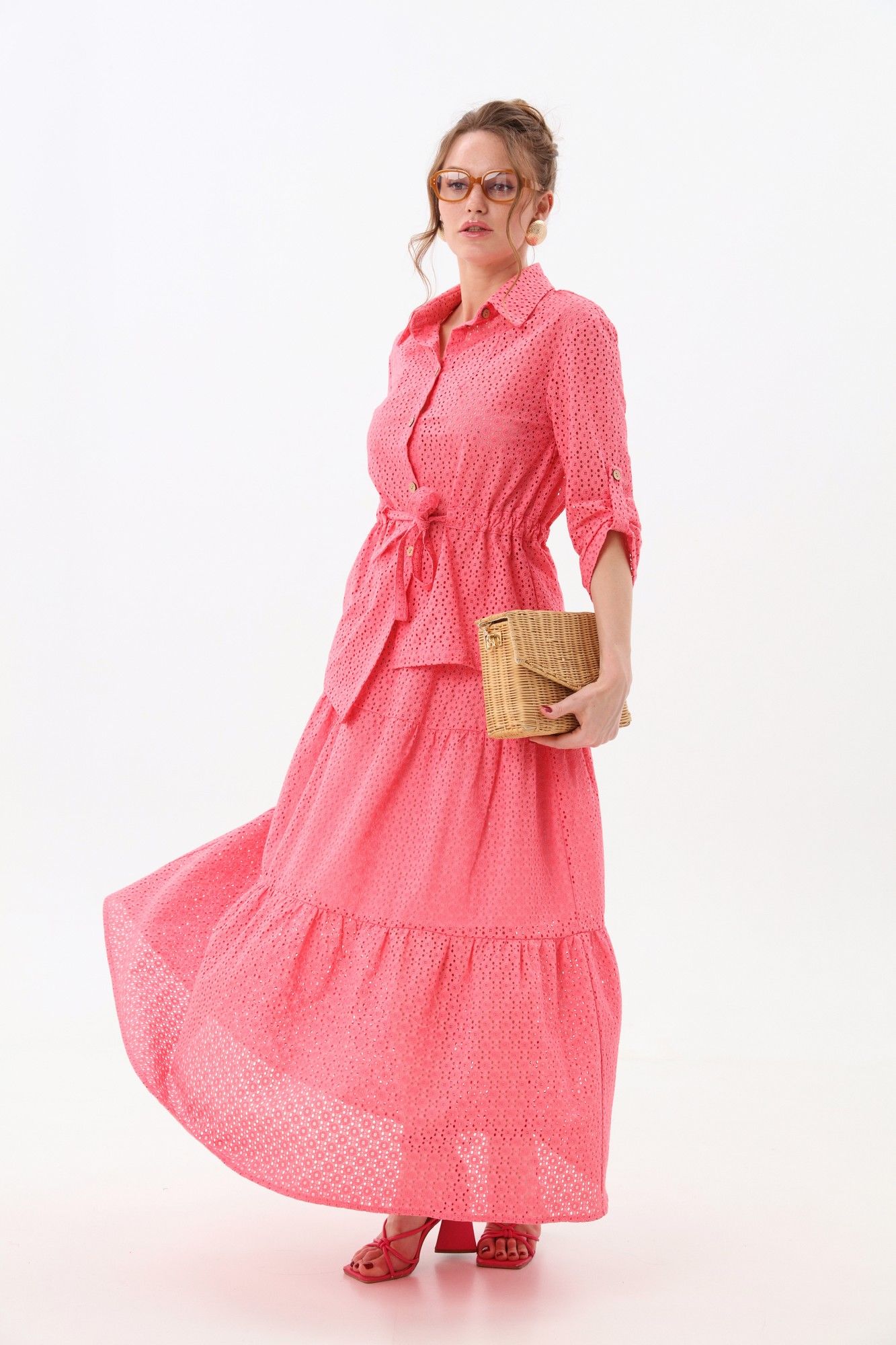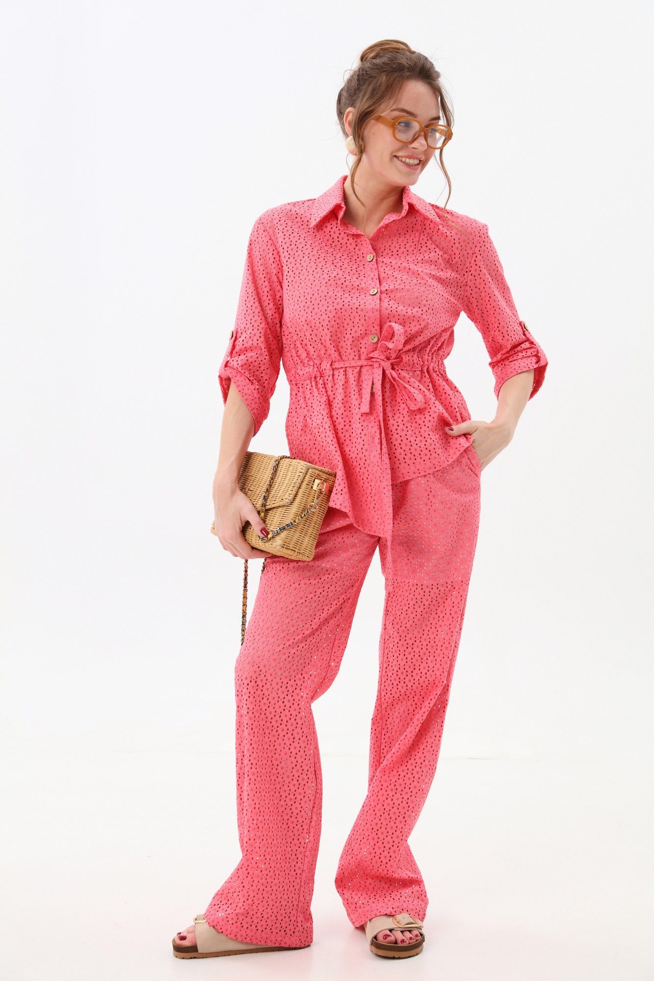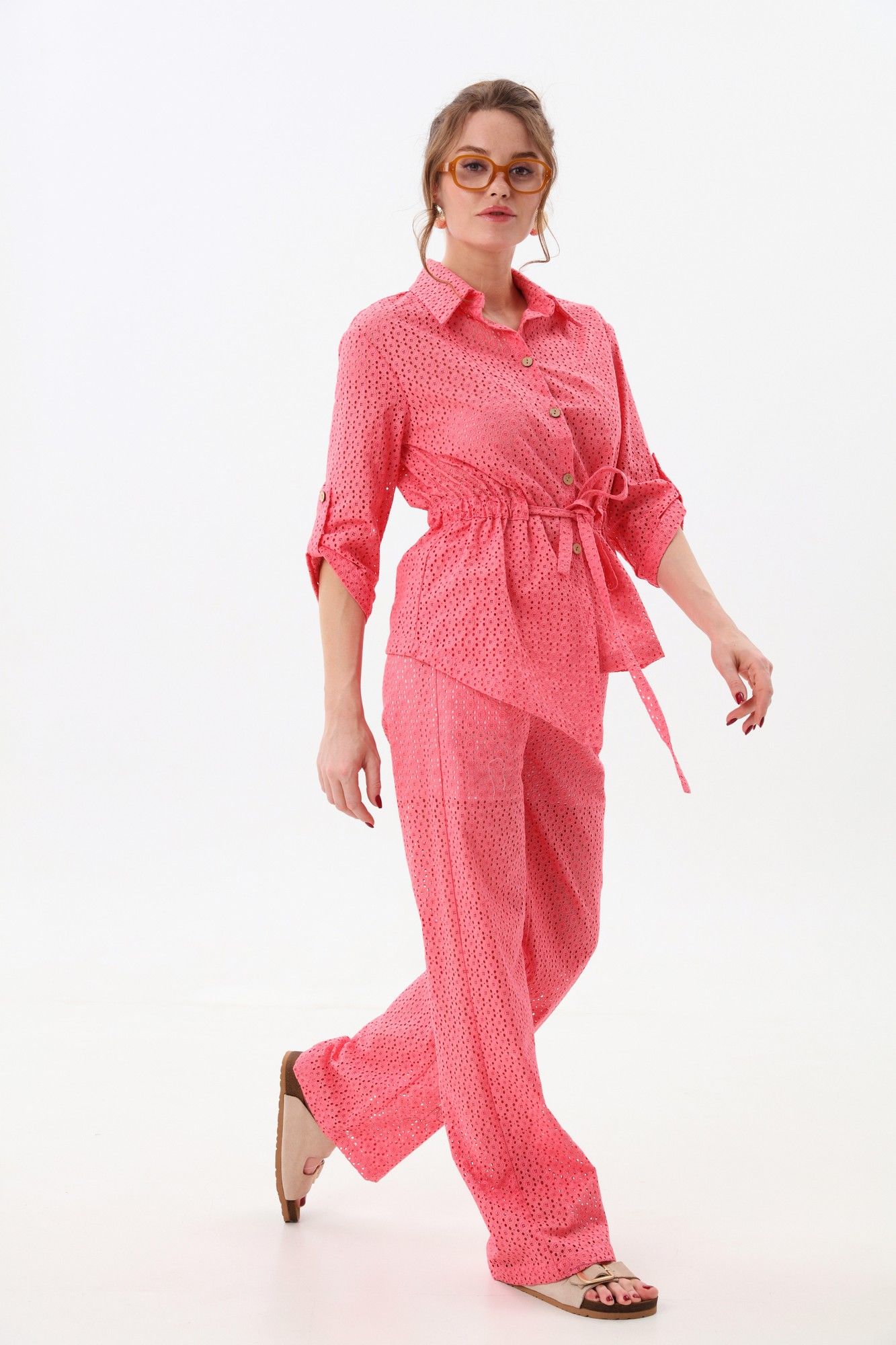 Жакет прямого силуэта, воротник пиджачного типа, рукав одношовный, втачной с незначительно спущенной линией плеча, длиной три четверти, с патой. По линии ткани настрачная кулиса с завязками из основной ткани. Застежка центрально-бортовая. Линия низа верхней части фигурная ассиметричная.