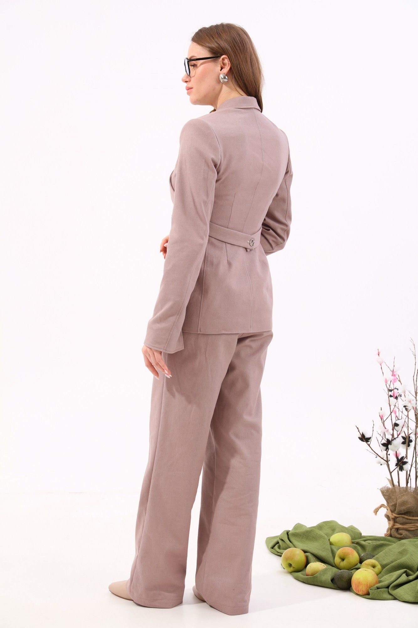 Костюм трёхпредметный: состоит из жакета и брюки, съёмных гофрированных манжет. Жакет полуприлегающего силуэта с втачными длинными прямыми рукавами. Перед с двумя нагрудными вытачками, переведенными в подрез, переходящий в боковой горизонтальный карман с клапаном и двумя обтачками и верхним наклонным карманом с листочкой, со смещённой застежкой на петли и пуговицы. Спинка со средним швом, двумя талевыми вытачками и отрезным бочком. Воротник пиджачного типа с заострёнными концами, направленными вверх, с лацканами, переходящими в пояс, застегивающимися сзади на пуговицу. Изделие на подкладке. Прямые брюки с двойным поясом из отделочной контрастной ткани. Изделие по линии талии на резинке с имитацией гульфика. Карманы с отрезным бочком.