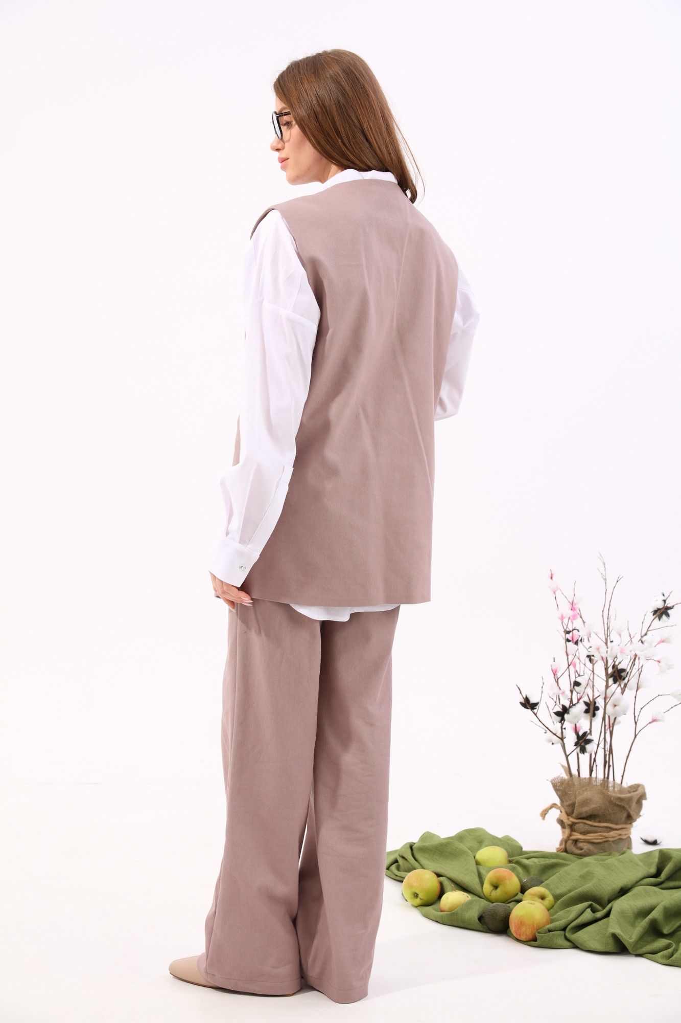 Костюм двухпредметный: состоит из жилета и брюк. Жилет прямого силуэта оверсайз. По переду талиевая вытачка переходящая в прорезной карман с клапаном и двумя обтачками. Спинка цельнокроенная. Перед фигурный симметричный с застежкой на правом плече на петли и пуговицы. Для дополнительной фиксации по центру застежка на одну петлю и пуговицу. Прямые брюки с двойным поясом из отделочной контрастной ткани. Изделие по линии талии на резинке с имитацией гульфика. Карманы с отрезным бочком.