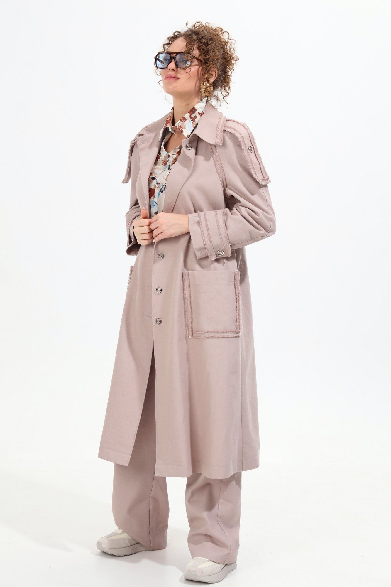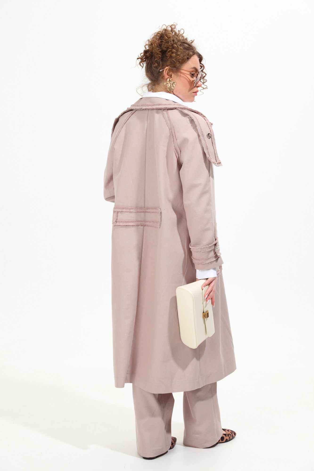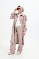 Костюм трёхпредметный: состоит из кардигана, брюк и платка. Кардиган оверсайз, немного расклешенного силуэта, без подкладки. Перед с центральной бортовой застежкой на пуговицы и петли. На детали передней части накладной карман. Спинка со средним швом и расположенным в области талии хлястиком. Рукав покроя реглан. Воротник стояче-отложной. Пришивная декоративная нашивка на кармане по переду. Прямые брюки с двойным поясом из отделочной контрастной ткани. Изделие по линии талии на резинке с имитацией гульфика. Карманы с отрезным бочком. В комплект входит платок.